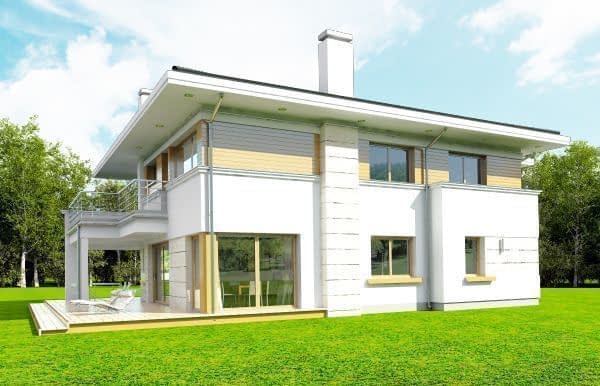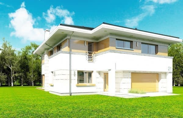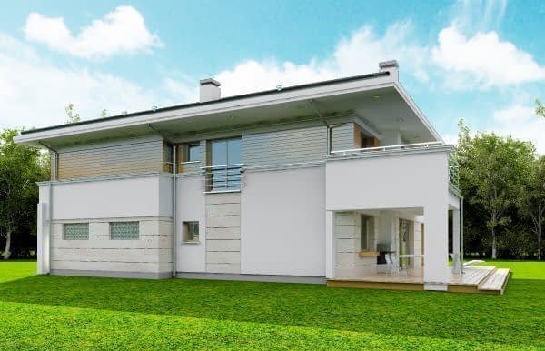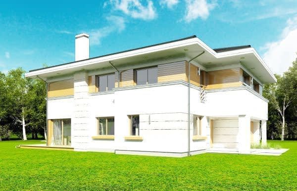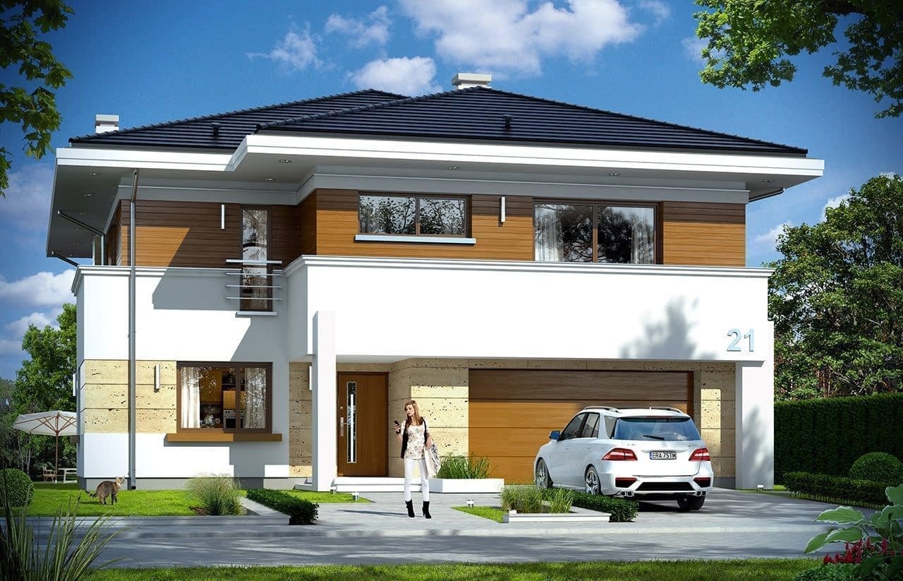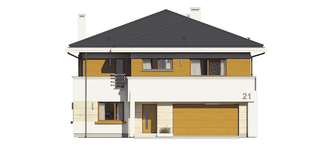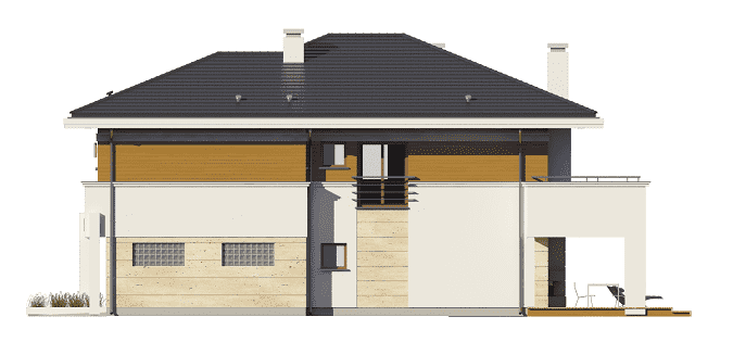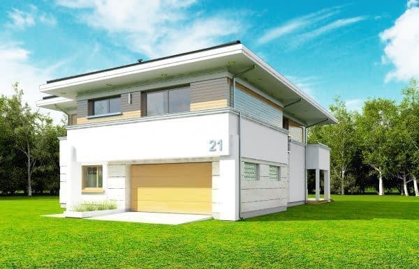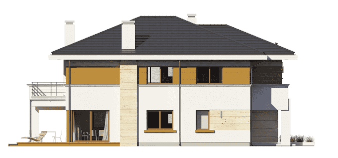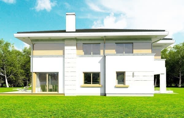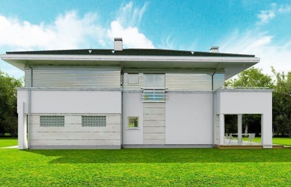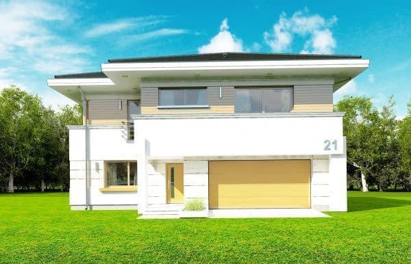 Projekt domu Oceanic to luksusowy piętrowy dom dla cztero-sześciowosobowej rodziny o nowoczesnej zwartej bryle, z ciekawym detalem i materiałami wykończeniowymi. Piętrowa prostokątna sylwetka została tutaj nakryta łagodnym czterospadowym dachem, z szerokimi okapami. Elewacja podzielona została na poziome pasy: na parterze – część murowana i obłożona kamieniem, na piętrze - okładzina drewniana ścian. Dom dzięki dużym przeszkleniom, właściwym proporcjom elewacji, ma w sobie lekkość. Szczególnie elewacja ogrodowa jest bardzo otwarta. Front domu jest nieco bardziej masywny, solidny, z mniejszymi oknami, aby w naturalny sposób swoistą barierę dla wnętrza od ulicy. Wnętrze domu ma maksymalnie prosty program i układ funkcjonalny. Na parterze mieści się duża część dzienna, z salonem, jadalnią, obszerną kuchnią i holem ze schodami. Dodatkowo na parterze mamy ładny podwójny garaż, kotłownię i pokój - gabinet / sypialnię gościnną. Na piętrze natomiast mieści się aż pięć pokoi - bardzo rzadko spotykana rzecz w tej wielkości domach. Pięć pokoi, pralnia suszarnia, dwie łazienki i centralna duża garderoba. Oczywiście podział pomieszczeń można inaczej zaplanować, ale najważniejszy jest fakt, że piętro jest bardzo pojemne. Projekt domu Oceanic to propozycja dla wszystkich tych przyszłych właścicieli domu, którzy cenią sonie nowoczesny wygląd domu, nie lubią poddaszy ze skosami, potrzebują mieć sporo przestrzeni ukrytych w pokojach - poza salonem. Jednocześnie jak na swoją wielkość dom ma na tyle zwartą bryłę i prostą konstrukcję, że koszt jego realizacji nie jest bardzo wysoki. Projekt domu Oceanic został zaprojektowany jako energooszczędny, z dużą ilością dobrych ociepleń, oraz z wentylacją mechaniczną z rekuperacją.