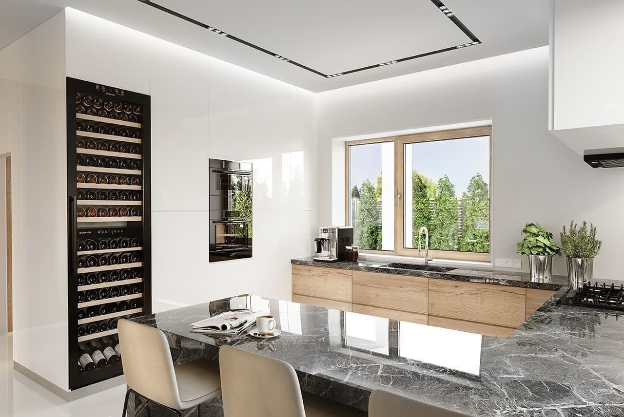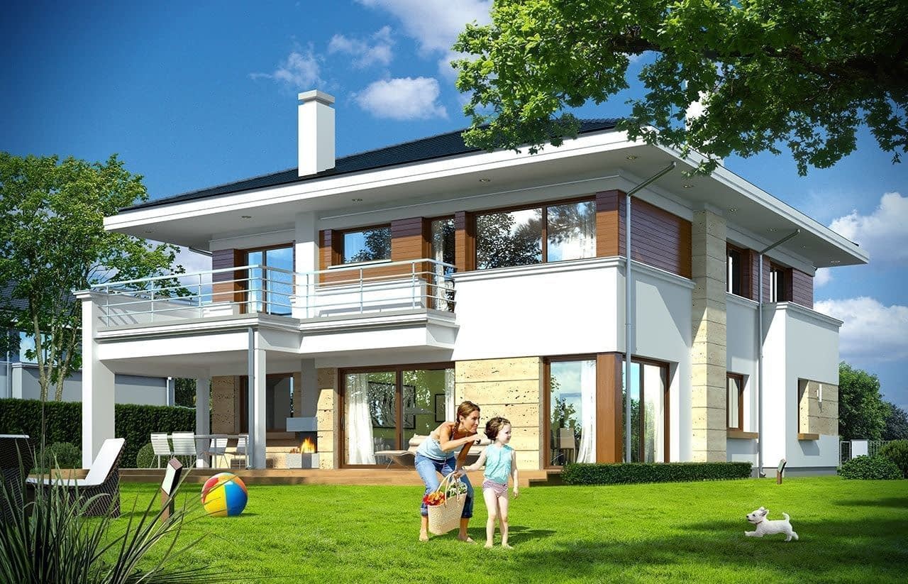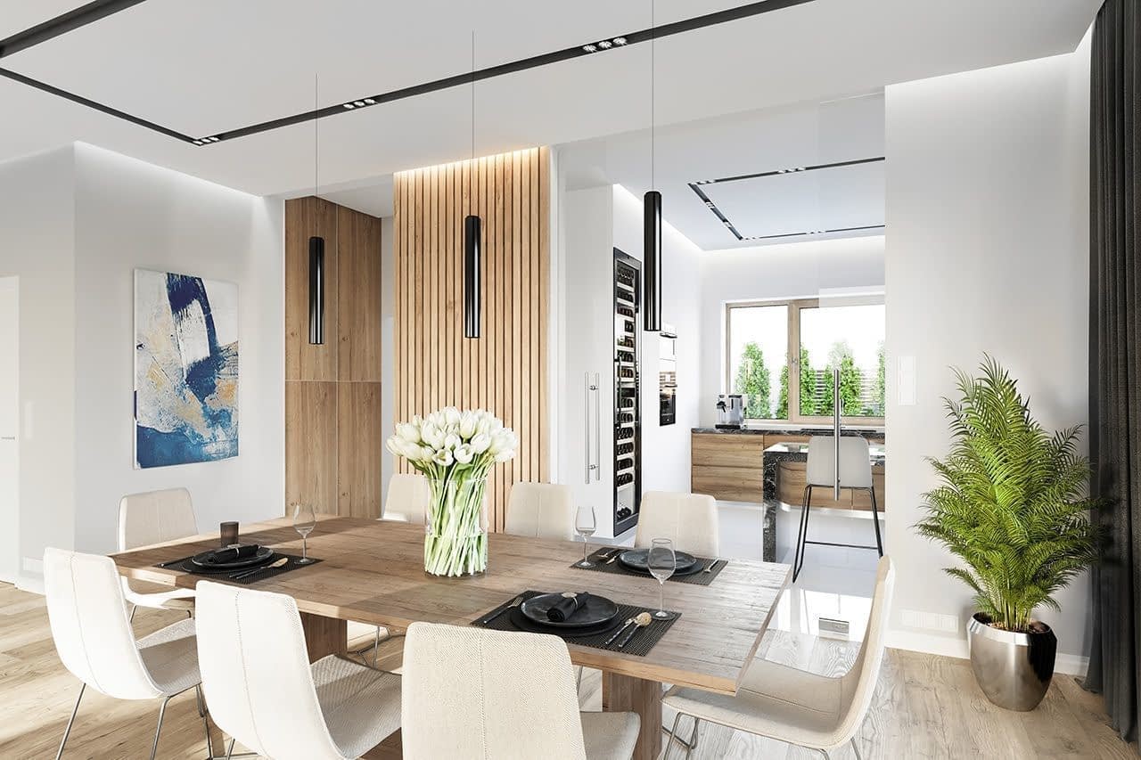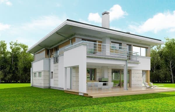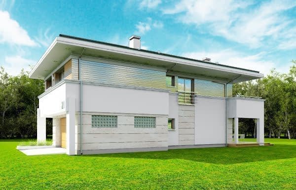 Projekt domu Oceanic to luksusowy piętrowy dom dla cztero-sześciowosobowej rodziny o nowoczesnej zwartej bryle, z ciekawym detalem i materiałami wykończeniowymi. Piętrowa prostokątna sylwetka została tutaj nakryta łagodnym czterospadowym dachem, z szerokimi okapami. Elewacja podzielona została na poziome pasy: na parterze – część murowana i obłożona kamieniem, na piętrze - okładzina drewniana ścian. Dom dzięki dużym przeszkleniom, właściwym proporcjom elewacji, ma w sobie lekkość. Szczególnie elewacja ogrodowa jest bardzo otwarta. Front domu jest nieco bardziej masywny, solidny, z mniejszymi oknami, aby w naturalny sposób swoistą barierę dla wnętrza od ulicy. Wnętrze domu ma maksymalnie prosty program i układ funkcjonalny. Na parterze mieści się duża część dzienna, z salonem, jadalnią, obszerną kuchnią i holem ze schodami. Dodatkowo na parterze mamy ładny podwójny garaż, kotłownię i pokój - gabinet / sypialnię gościnną. Na piętrze natomiast mieści się aż pięć pokoi - bardzo rzadko spotykana rzecz w tej wielkości domach. Pięć pokoi, pralnia suszarnia, dwie łazienki i centralna duża garderoba. Oczywiście podział pomieszczeń można inaczej zaplanować, ale najważniejszy jest fakt, że piętro jest bardzo pojemne. Projekt domu Oceanic to propozycja dla wszystkich tych przyszłych właścicieli domu, którzy cenią sonie nowoczesny wygląd domu, nie lubią poddaszy ze skosami, potrzebują mieć sporo przestrzeni ukrytych w pokojach - poza salonem. Jednocześnie jak na swoją wielkość dom ma na tyle zwartą bryłę i prostą konstrukcję, że koszt jego realizacji nie jest bardzo wysoki. Projekt domu Oceanic został zaprojektowany jako energooszczędny, z dużą ilością dobrych ociepleń, oraz z wentylacją mechaniczną z rekuperacją.