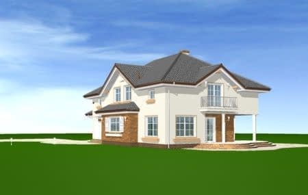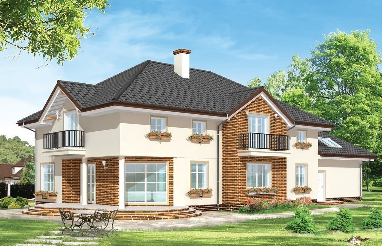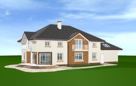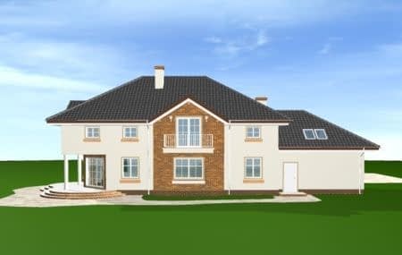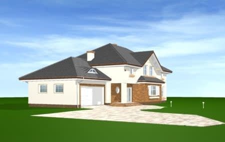 Projekt domu Okazały to duży, reprezentacyjny dom, dla rodziny 4-6 osobowej. Piętrowa bryła domu tworzy pełnowymiarowe pokoje na piętrze, bez skosów przy ścianach zewnętrznych. Na parterze zaprojektowano duży salon połączony z holem i aneksem jadalnym. Salon posiada piękne obniżone okno w ściętym narożniku, wychodzące na ogród. Jadalnia jest częściowo połączona z obszerną kuchnią ze spiżarnią. Na parterze zaprojektowano dodatkowy pokój-gabinet i dodatkowe pomieszczenie gospodarcze. Na piętrze w domu Okazały zaprojektowano 4 sypialnie, w tym jedna - sypialnia rodziców - z własną łazienką i garderobą. Nad garażem zaplanowano strych - mogący służyć np. jako pokój z kinem domowym lub sala ćwiczeń. Wygląd zewnętrzny domu: frontowy narożny podcień z eleganckimi drzwiami wejściowymi, duże okno kuchenne, ciekawy tylny podcień ogrodowy wsparty na kolumnach, balkony od strony ogrodowej - wszystkie te elementy nadają bryle finezji i elegancji. Pracownia posiada odbicie lustrzane projektu domu Okazały.