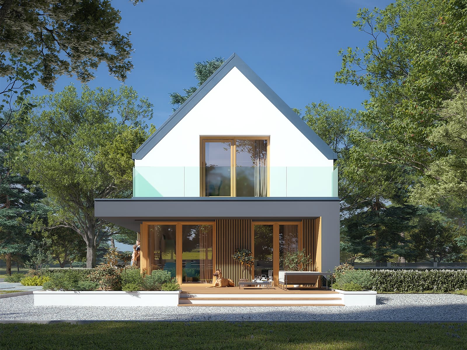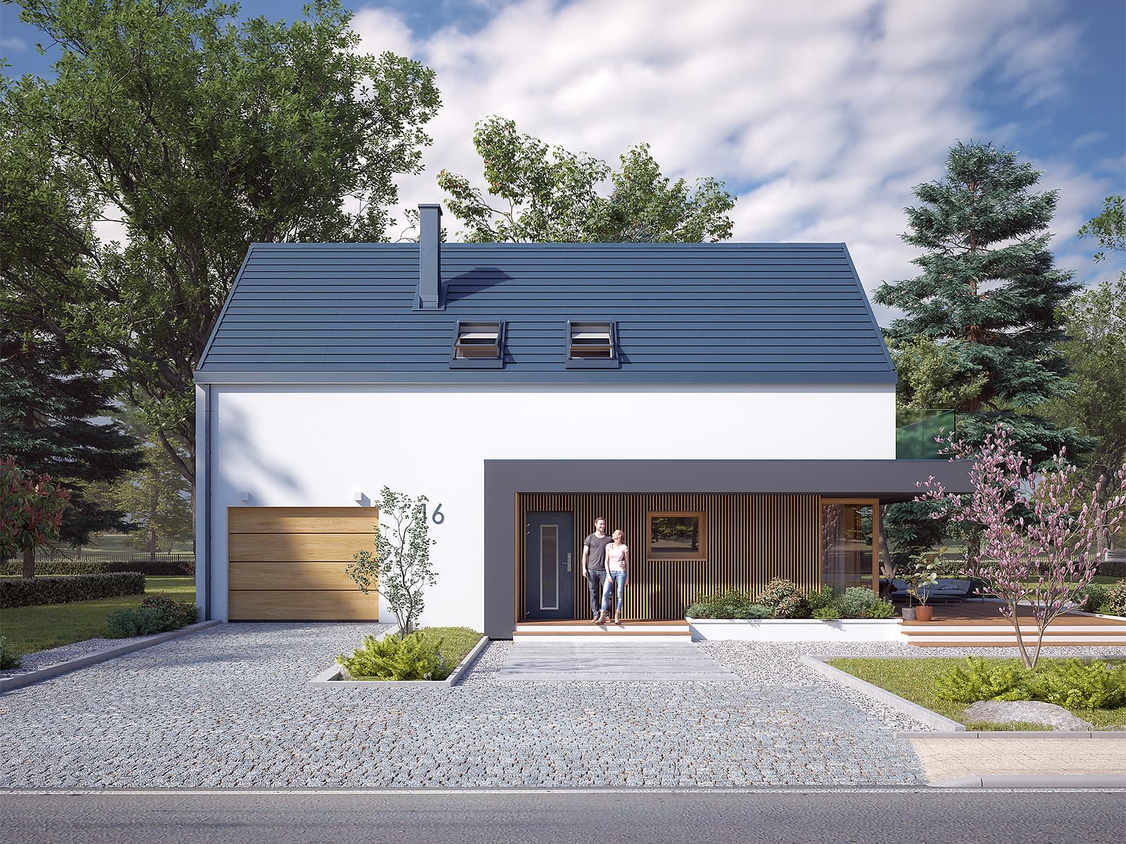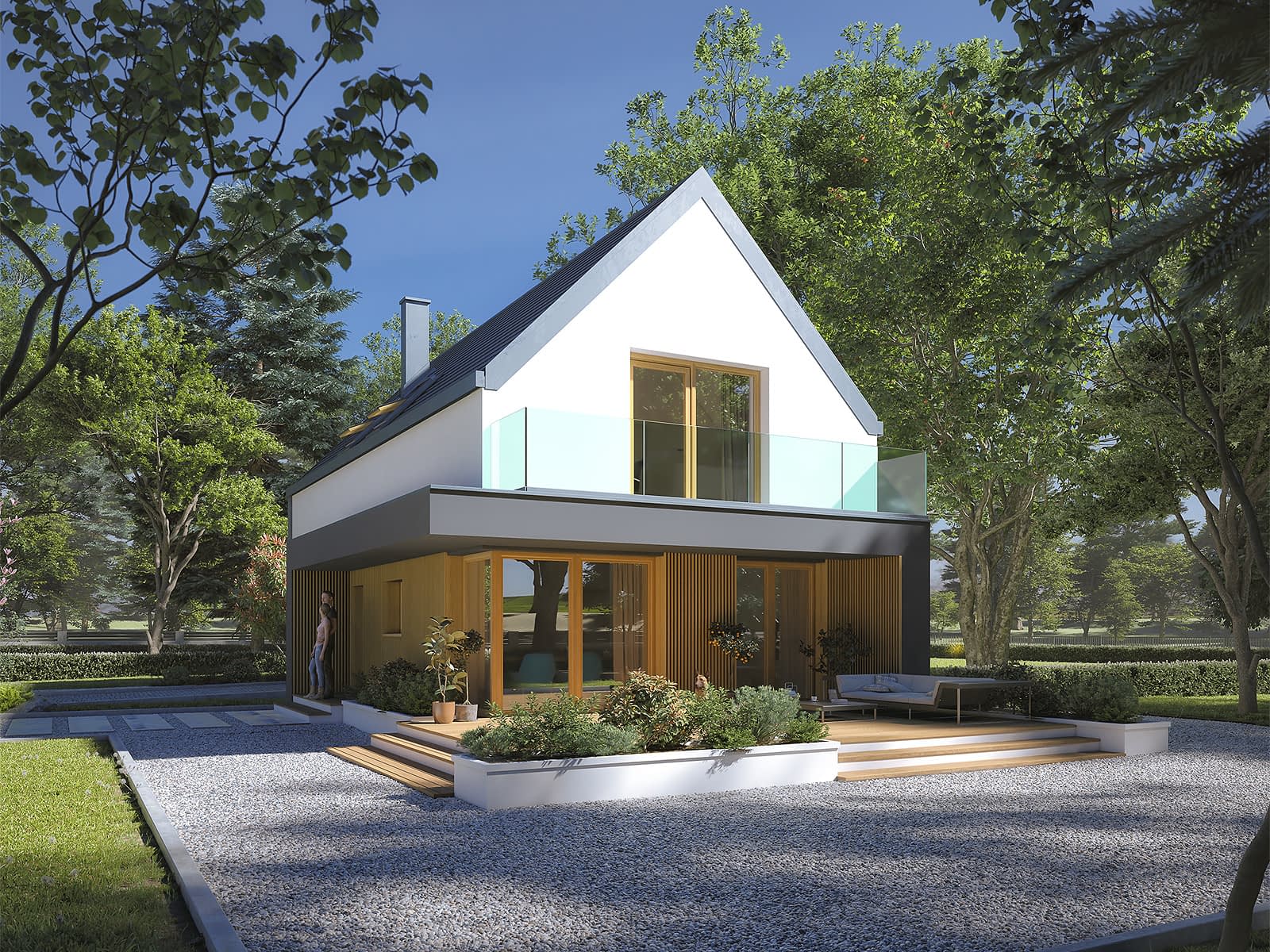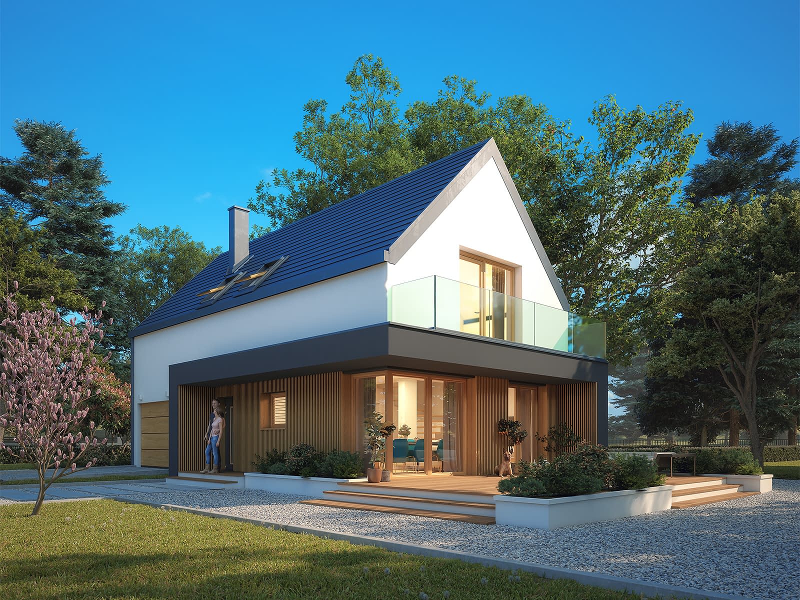 Okruszek to projekt domu z użytkowym poddaszem o powierzchni 111 m2. Dom idealnie wpisuje się w nurt współczesnej architektury. Minimalistyczna forma zainteresuje nie tylko zwolenników stylu tradycyjnego, ale również nowoczesnego. Dom posiada prostą bryłę, bezokapowy dach i liczne przeszklenia. Elewację zdobi drewniana szalówka oraz tynk w kolorze białym i szarym. Całość prezentuje się niezwykle oryginalnie.Konstrukcja