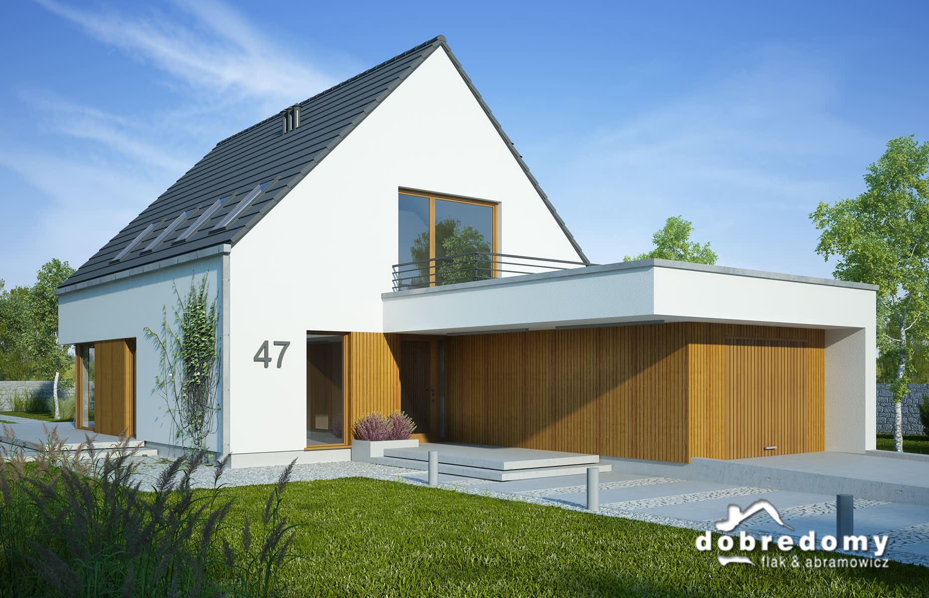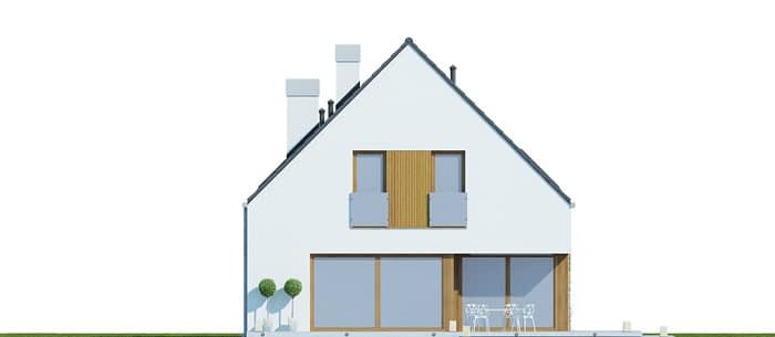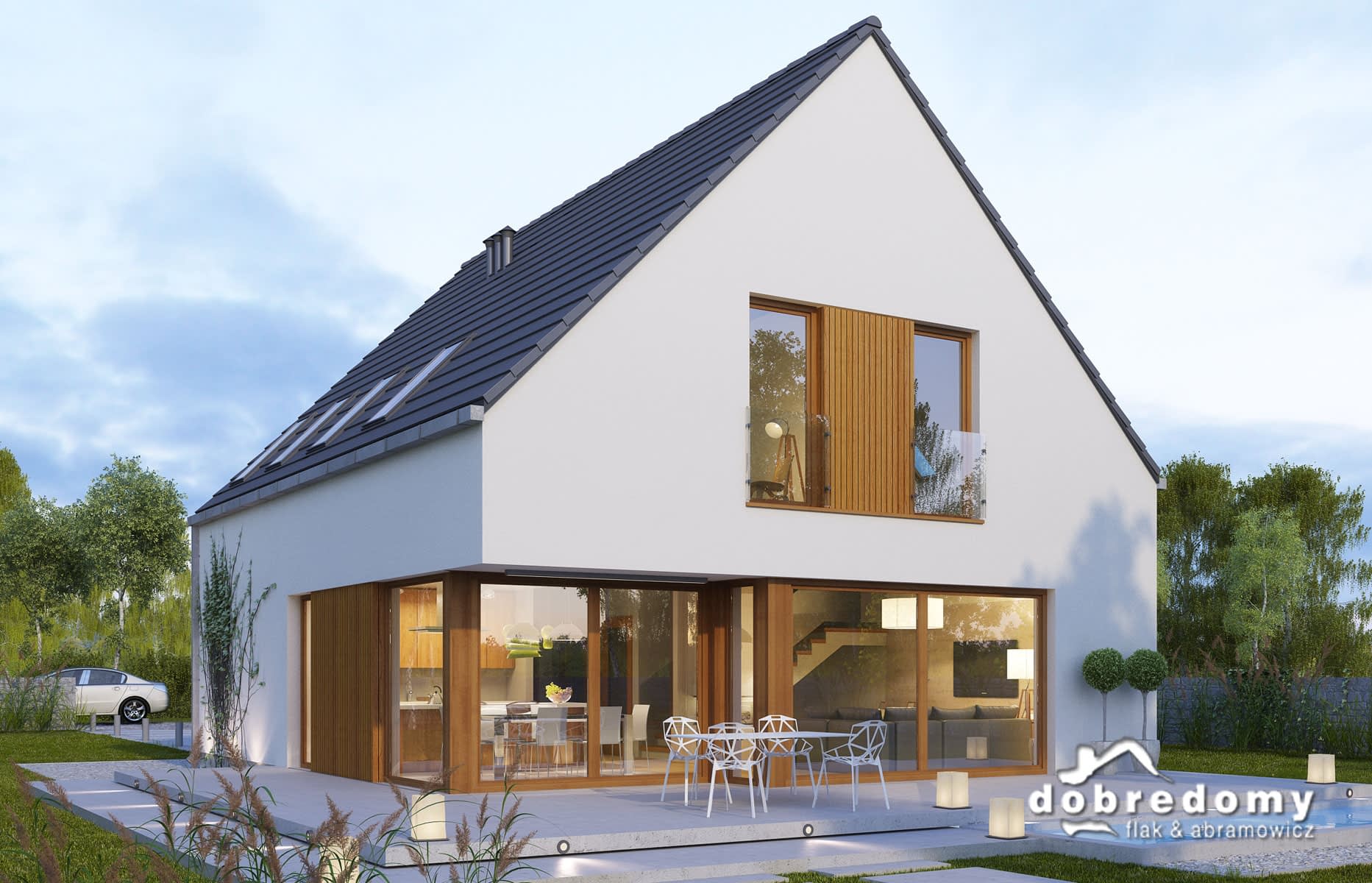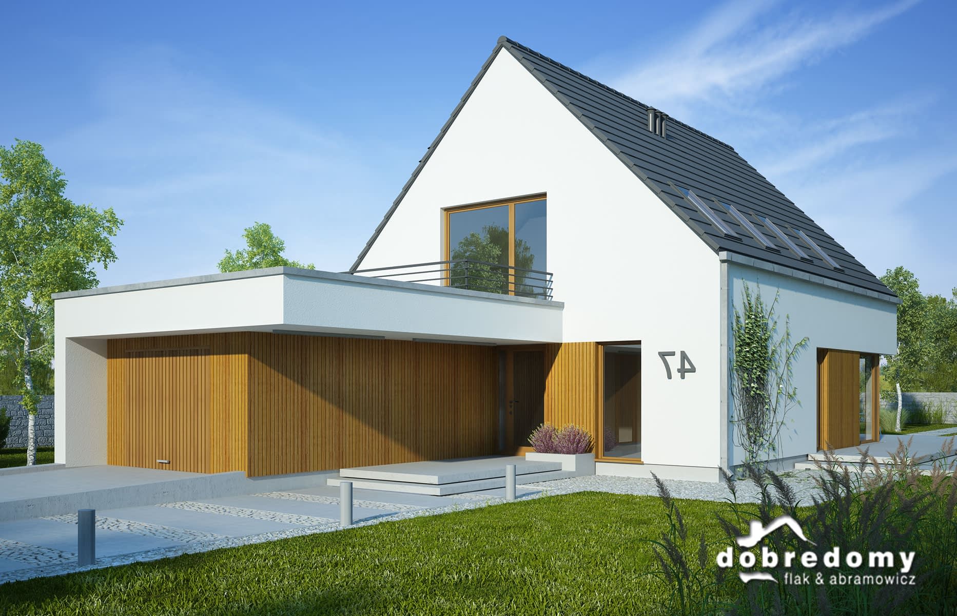 Elewacje - tynk strukturalny w systemie ociepleń Termo Organika oraz okładziną drewnianą. W projekcie zastosowano okna dachowe marki FAKRO. Pokrycie dachu - dachówka ceramiczna lub cementowa CREATON.