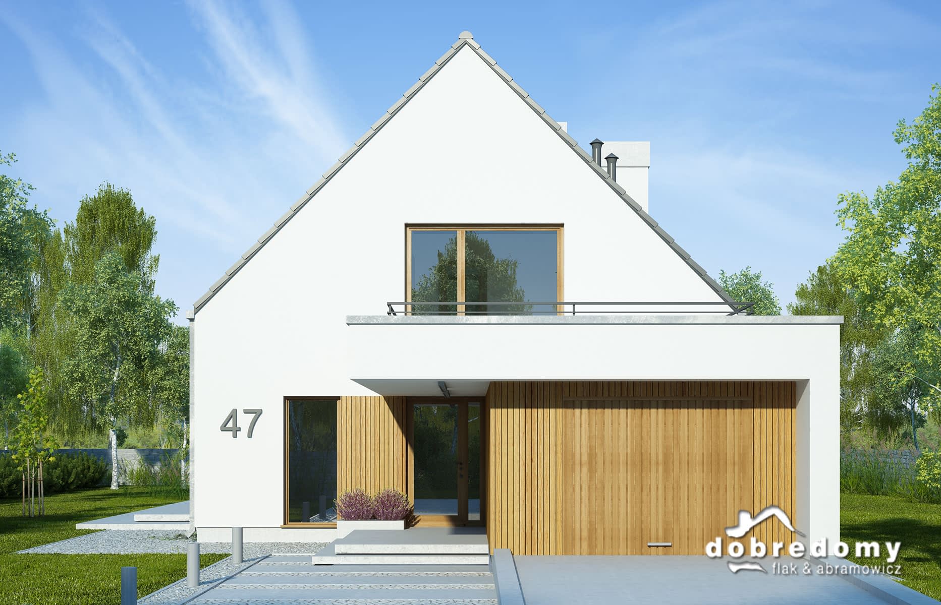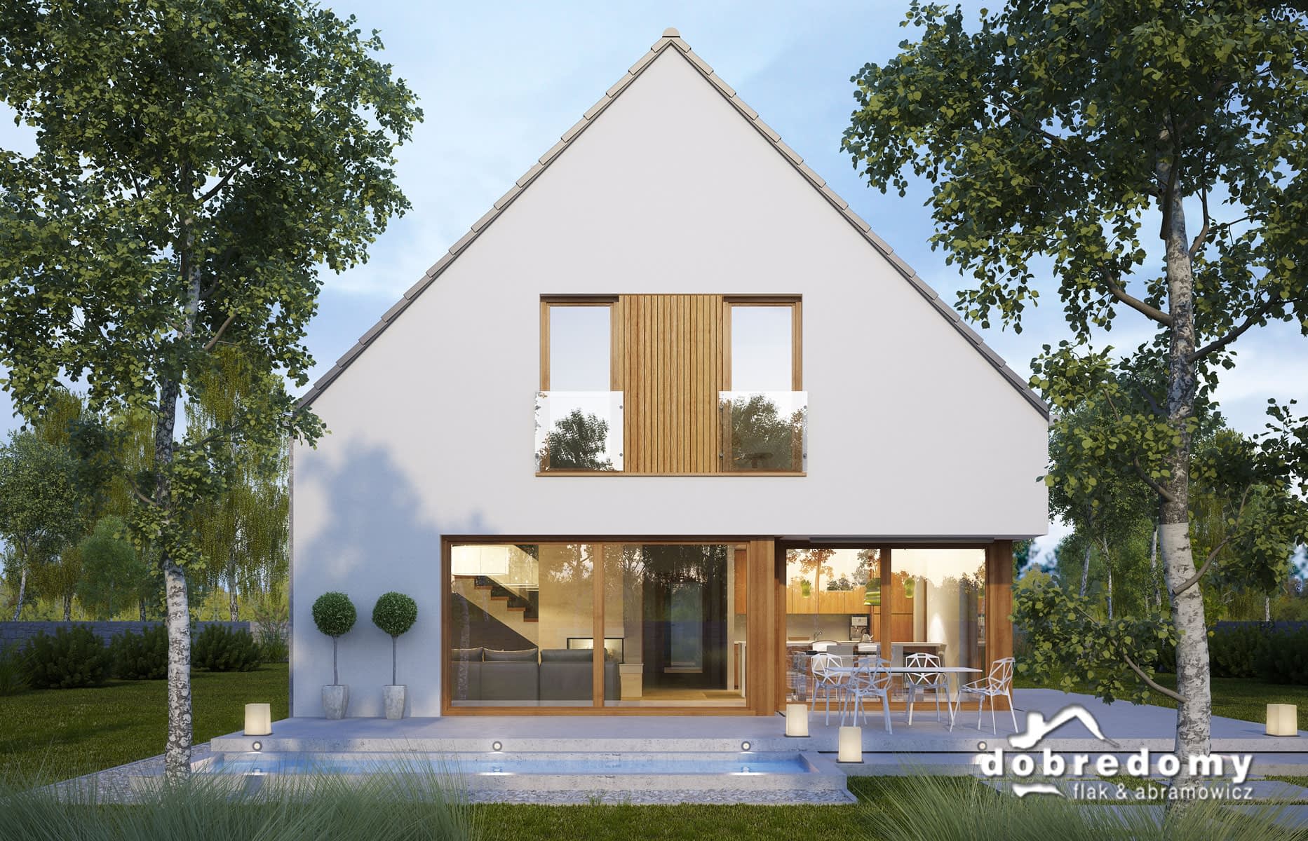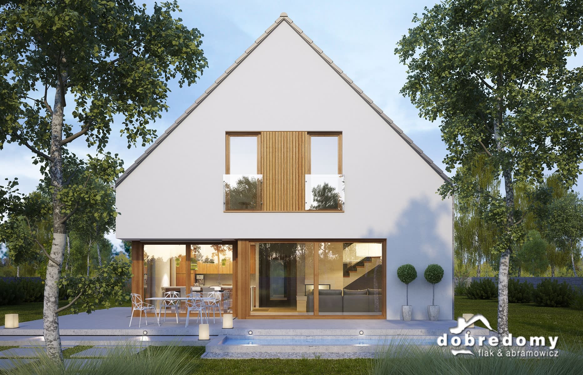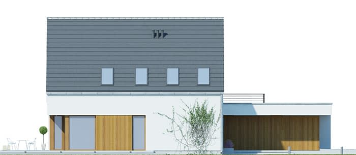 Elewacje - tynk strukturalny w systemie ociepleń Termo Organika oraz okładziną drewnianą. W projekcie zastosowano okna dachowe marki FAKRO. Pokrycie dachu - dachówka ceramiczna lub cementowa CREATON.