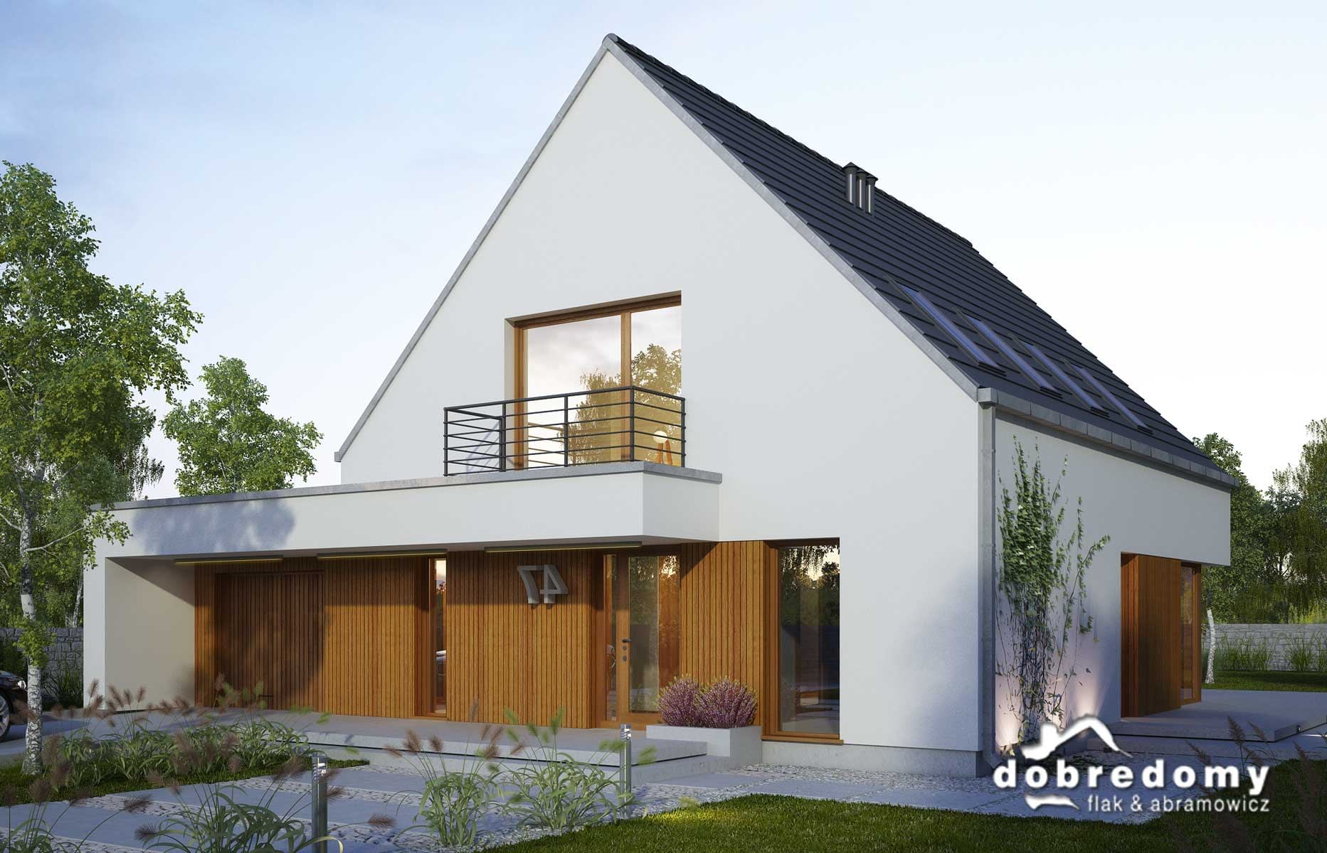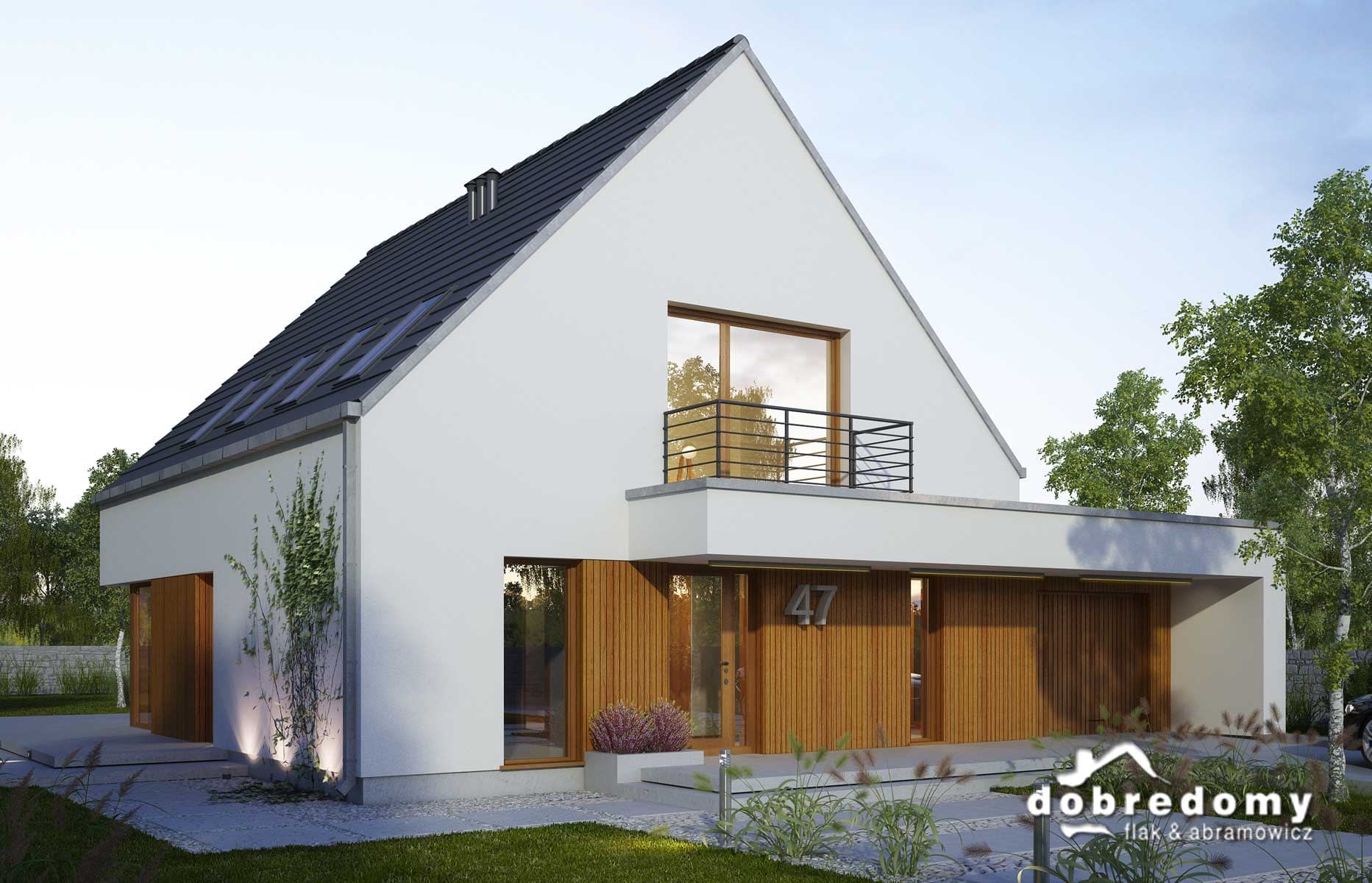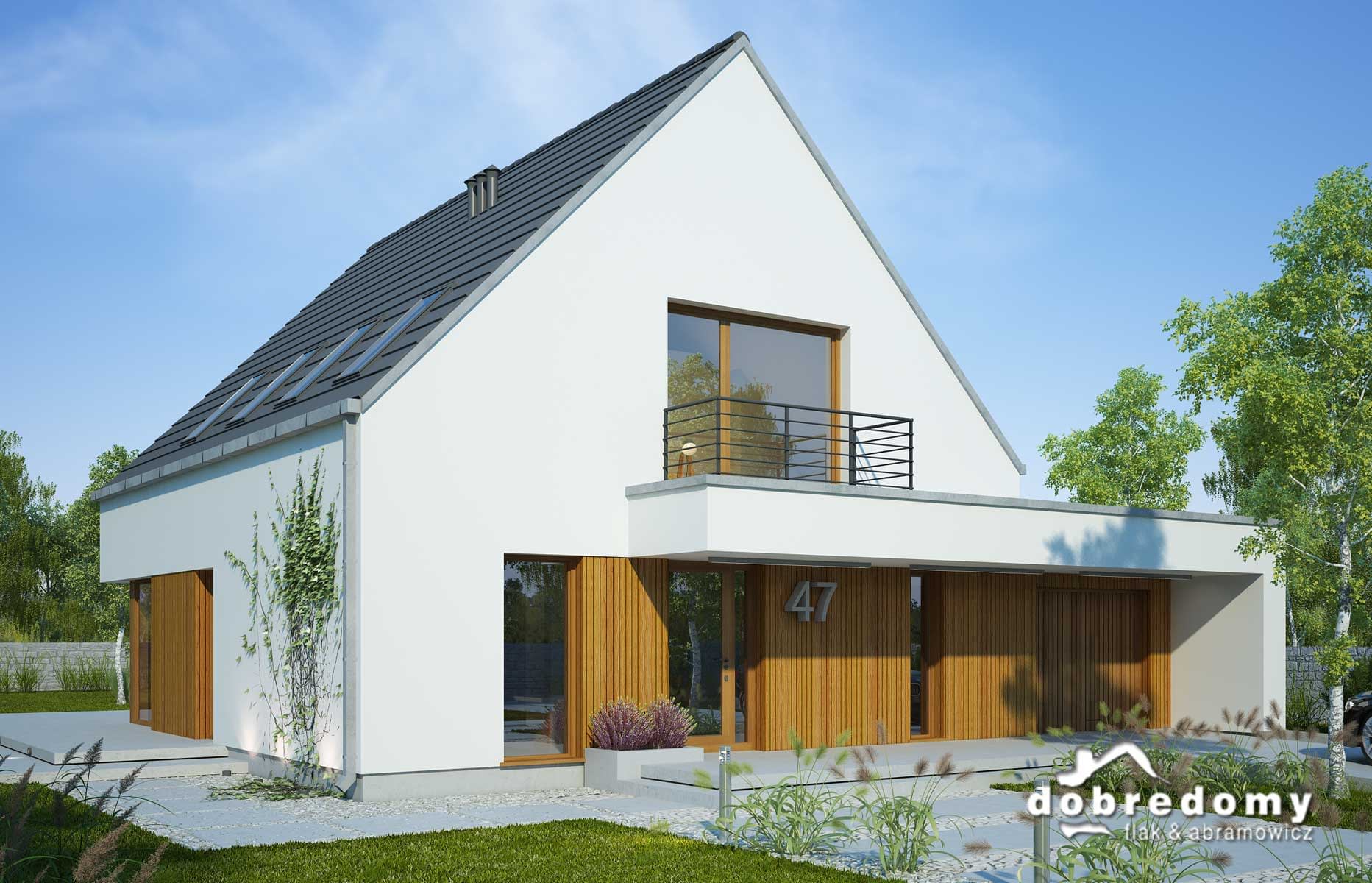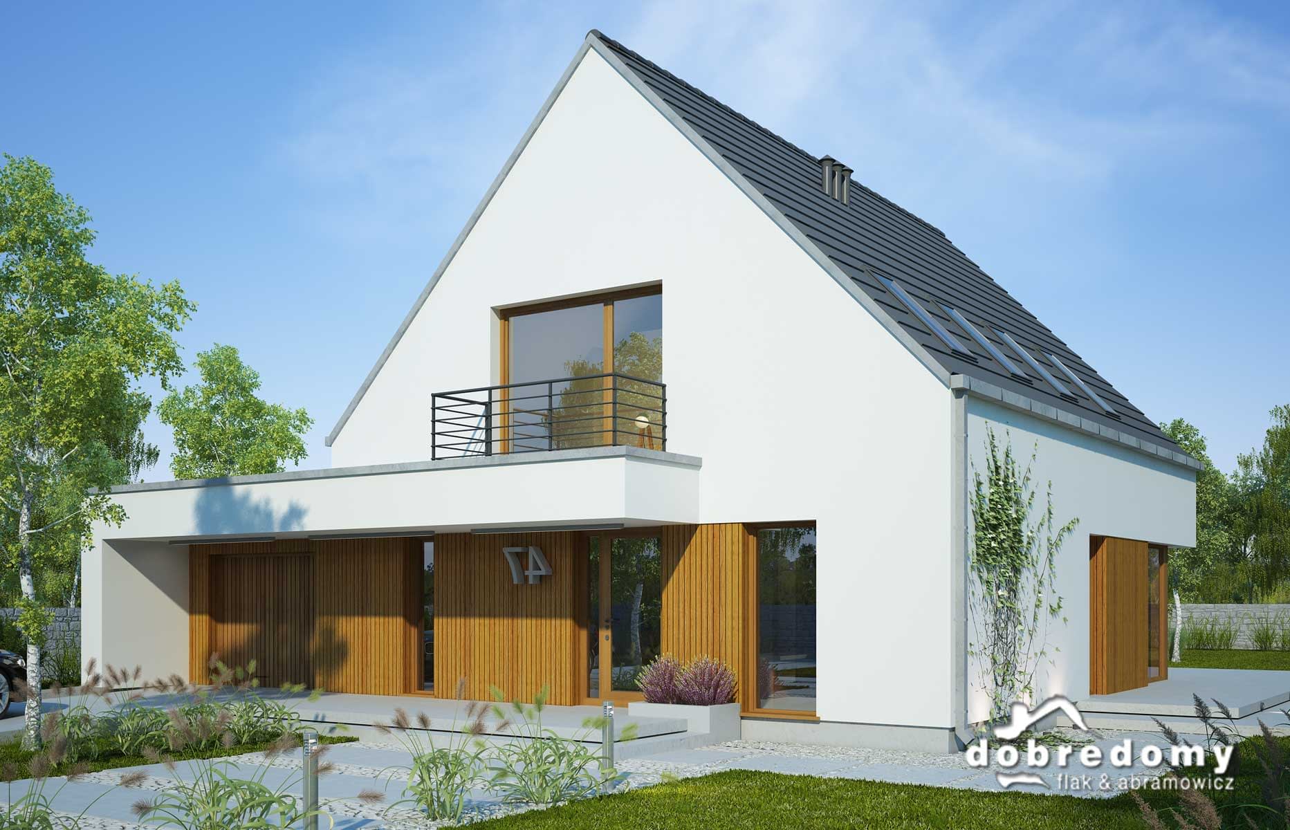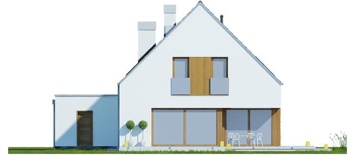 Elewacje - tynk strukturalny w systemie ociepleń Termo Organika oraz okładziną drewnianą. W projekcie zastosowano okna dachowe marki FAKRO. Pokrycie dachu - dachówka ceramiczna lub cementowa CREATON.