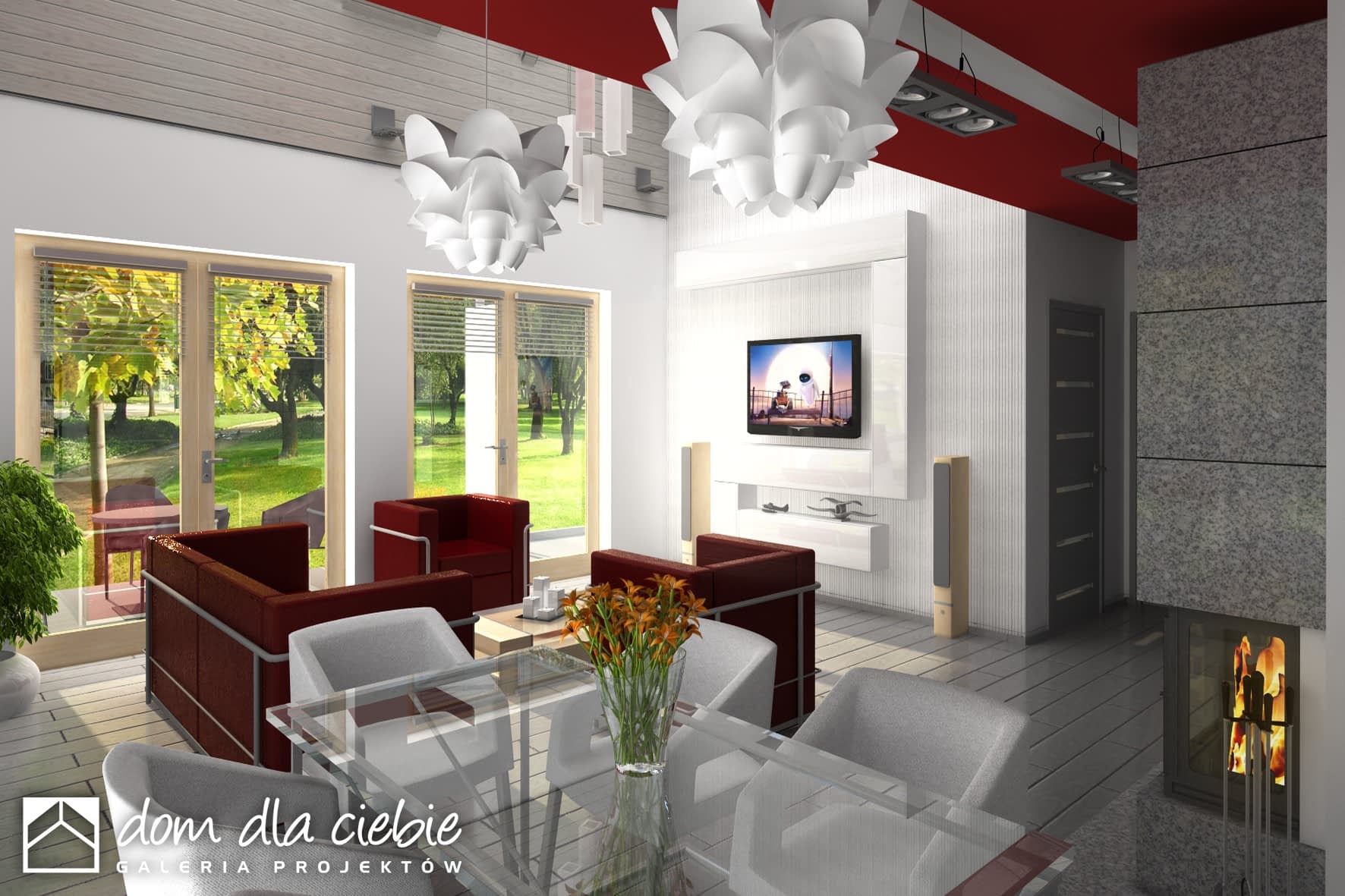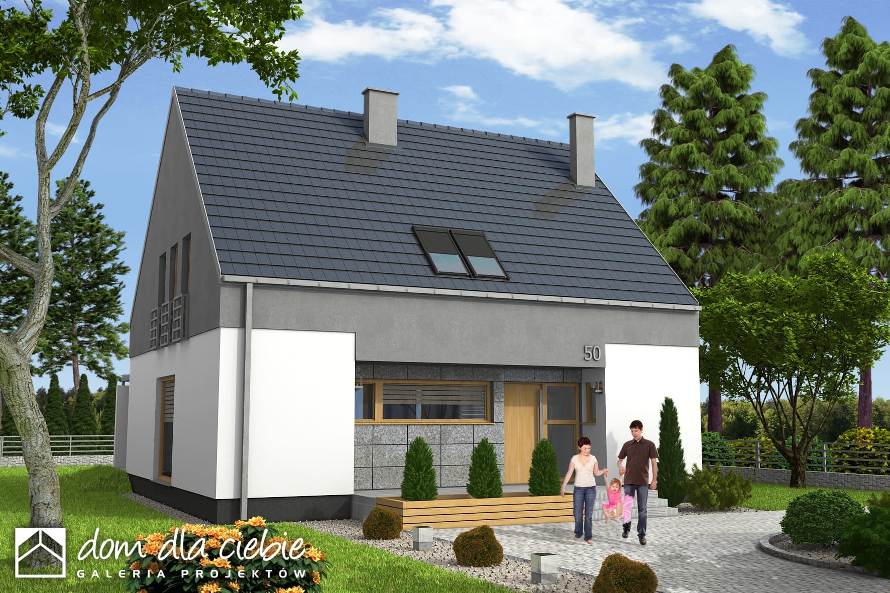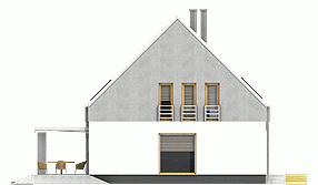 Nowoczesny dom jednorodzinny z antresolą, o prostej, energooszczędnej bryle i nieskomplikowanych rozwiazaniach konstrukcyjnych. Dom przeznaczony jest dla 4-5 osobowej rodziny. Oprócz podstawowego programu funkcjonalnego zapewniono dużą spiżarnię obok kuchni oraz dodatkowe pomieszczenie gospodarcze za garażem dostępne z ogrodu. Dom posiada atrakcyjny salon- wysoki na dwie kondygnacje- dodatkowo doświetlony oknami połaciowymi sterowanym zdalnie. Z tyłu domu zaprojektowano nowoczesną pergolę na słupach, którą można wyposażyć w poziomą, tekstylną roletę. Poddasze, z atrakcyjnym holem- otwartym na pustkę nad salonem- składa się z 3 wygodnych sypialni oraz dużej łazienki.