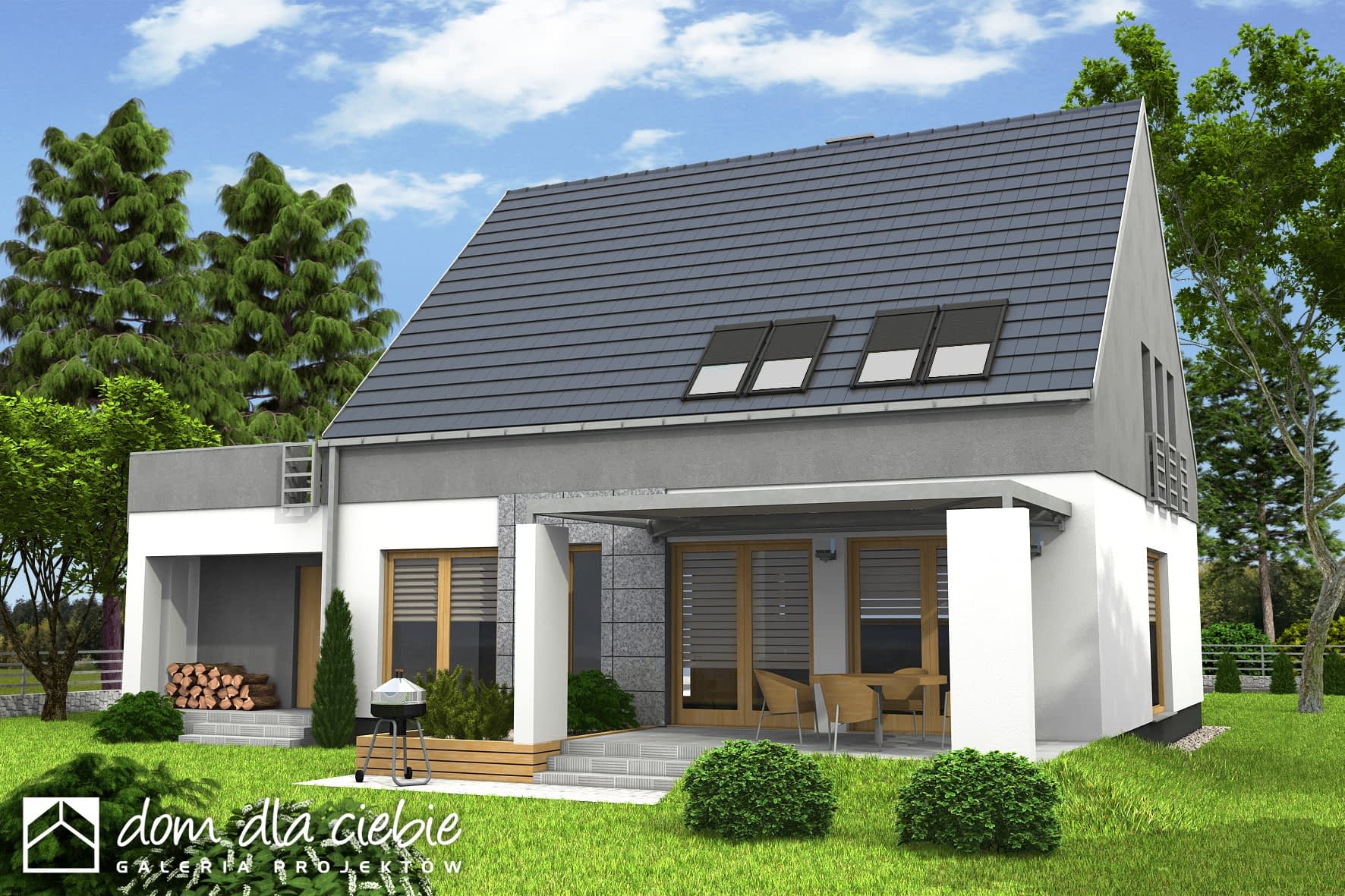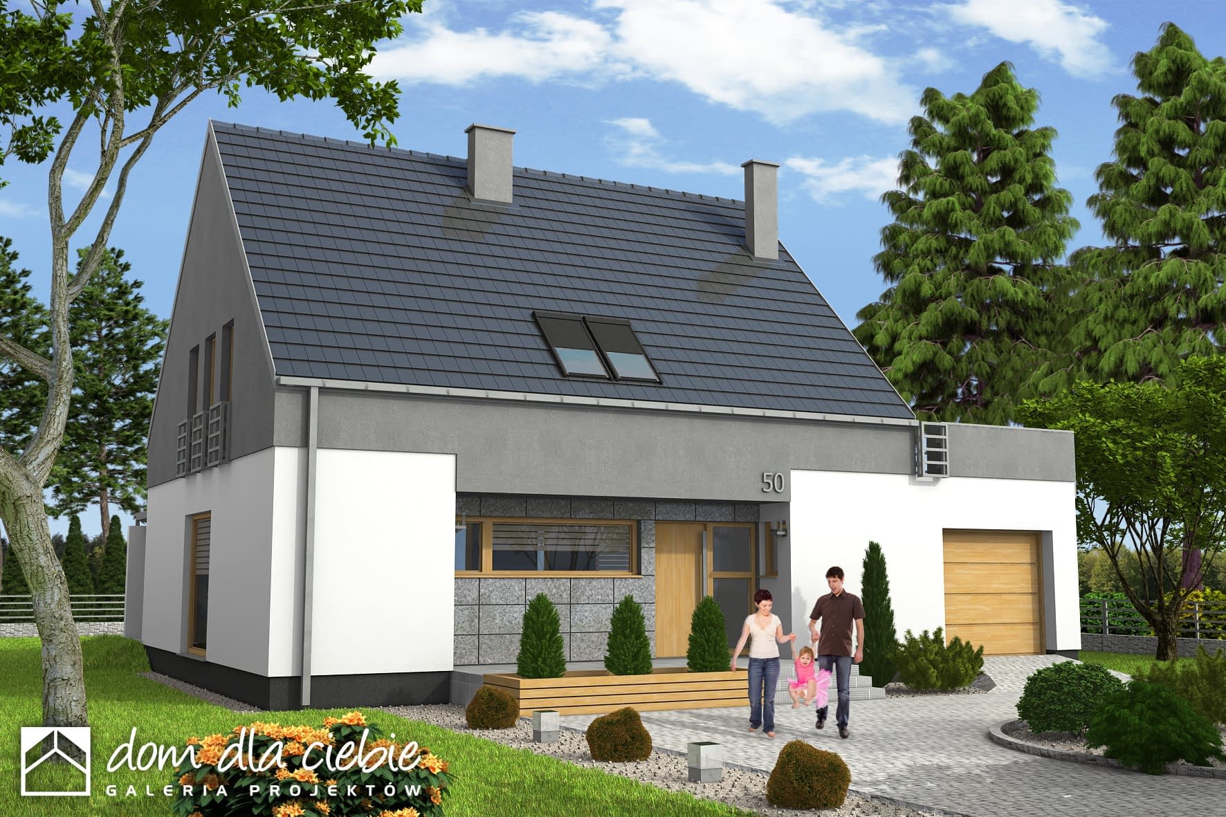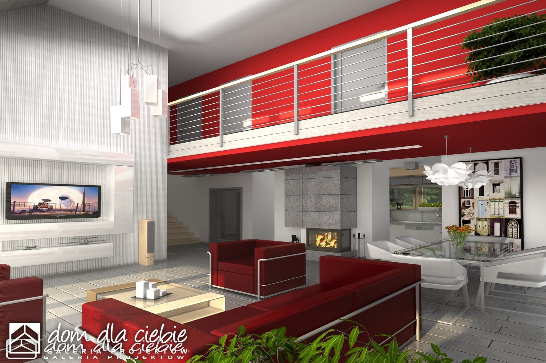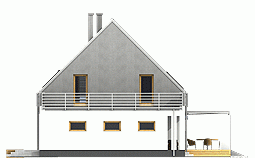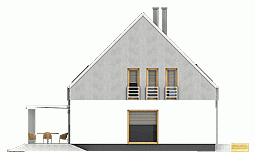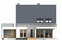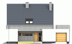 Nowoczesny dom jednorodzinny z antresolą, o prostej, energooszczędnej bryle i nieskomplikowanych rozwiązaniach konstrukcyjnych. Dom przeznaczony jest dla 4-5 osobowej rodziny. Oprócz podstawowego programu funkcjonalnego zapewniono dużą spiżarnię obok kuchni oraz dodatkowe pomieszczenie gospodarcze za garażem dostępne z ogrodu. Oba wejścia do budynku- główne i do pomieszczenia gosp. za garażem- chronione są przed opadami praktycznymi podcieniami, z których tylny można wykorzystać do składowania drewna kominkowego. Dom posiada atrakcyjny salon- wysoki na dwie kondygnacje- dodatkowo doświetlony oknami połaciowymi sterowanym zdalnie. Z tyłu domu zaprojektowano nowoczesną pergolę na słupach, którą można wyposażyć w poziomą, tekstylną roletę. Poddasze, z atrakcyjnym holem- otwartym na pustkę nad salonem- składa się z 3 wygodnych sypialni oraz dużej łazienki. Obszerny taras nad częścią garażową dostępny jest z dwóch sypialni.