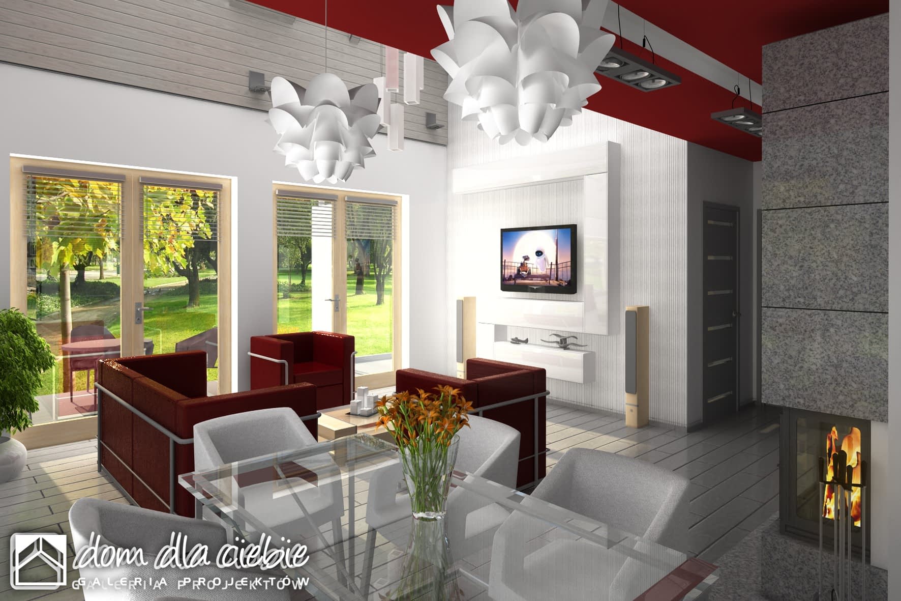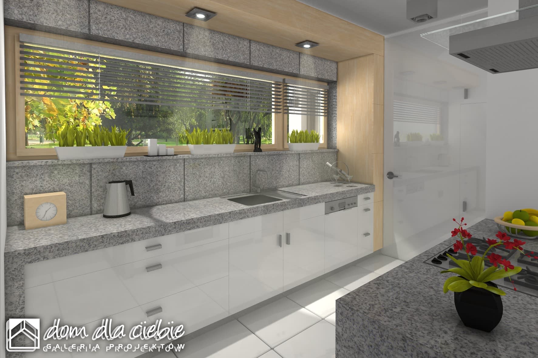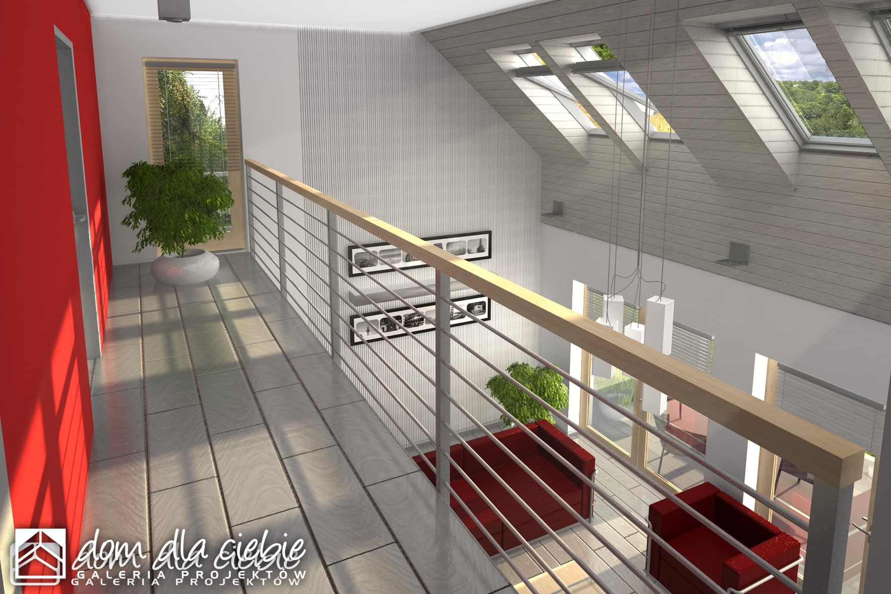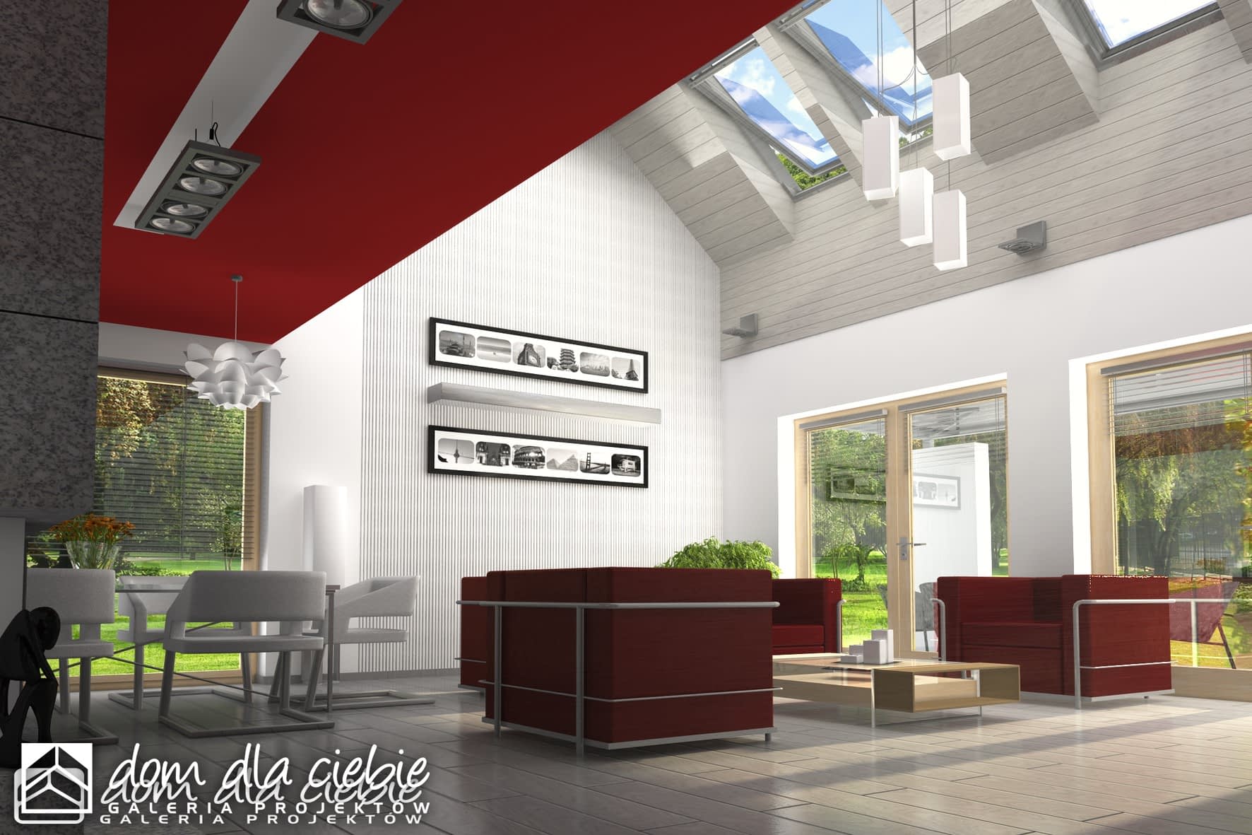 Nowoczesny dom jednorodzinny z antresolą, o prostej, energooszczędnej bryle i nieskomplikowanych rozwiązaniach konstrukcyjnych. Dom przeznaczony jest dla 4-5 osobowej rodziny. Oprócz podstawowego programu funkcjonalnego zapewniono dużą spiżarnię obok kuchni oraz dodatkowe pomieszczenie gospodarcze za garażem dostępne z ogrodu. Oba wejścia do budynku- główne i do pomieszczenia gosp. za garażem- chronione są przed opadami praktycznymi podcieniami, z których tylny można wykorzystać do składowania drewna kominkowego. Dom posiada atrakcyjny salon- wysoki na dwie kondygnacje- dodatkowo doświetlony oknami połaciowymi sterowanym zdalnie. Z tyłu domu zaprojektowano nowoczesną pergolę na słupach, którą można wyposażyć w poziomą, tekstylną roletę. Poddasze, z atrakcyjnym holem- otwartym na pustkę nad salonem- składa się z 3 wygodnych sypialni oraz dużej łazienki. Obszerny taras nad częścią garażową dostępny jest z dwóch sypialni.