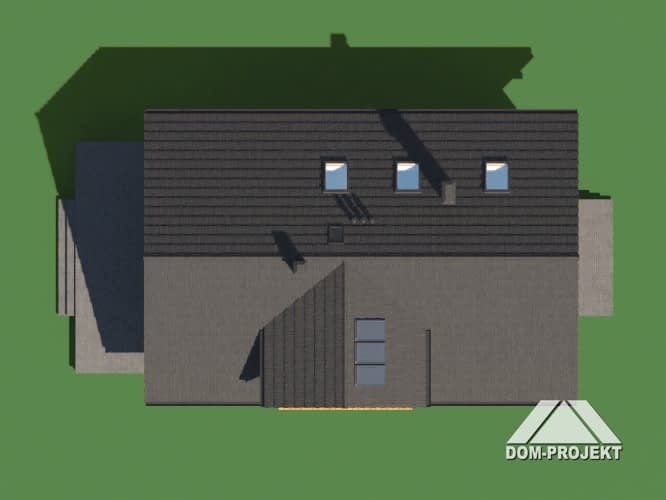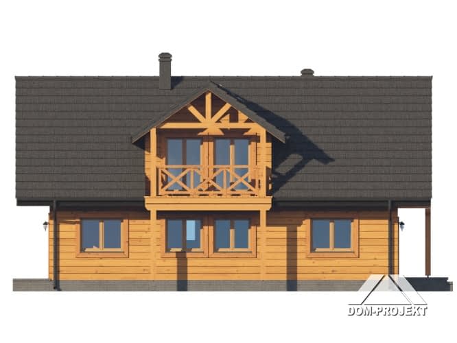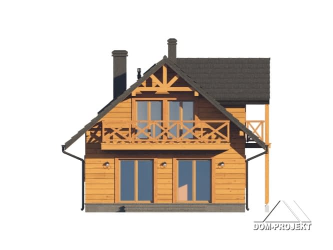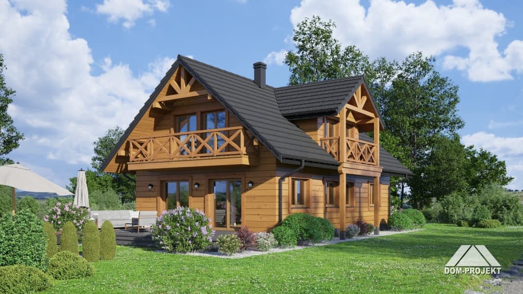 Dom w konstrukcji szkieletu drewnianego. Na parterze duży salon z aneksem kuchennym, kominkiem oraz wyjściem na taras. Pokój, pomieszczenie gospodarcze, komunikacja, wiatrołap, wc, kotłownia. Na poddaszu trzy pokoje, dwie łazienki, duża komunikacja, trzy balkony. Zwarta bryła budynku oraz dach dwuspadowy sprzyjają szybkiej i taniej budowie oraz niskim kosztom eksploatacji.Rzuty