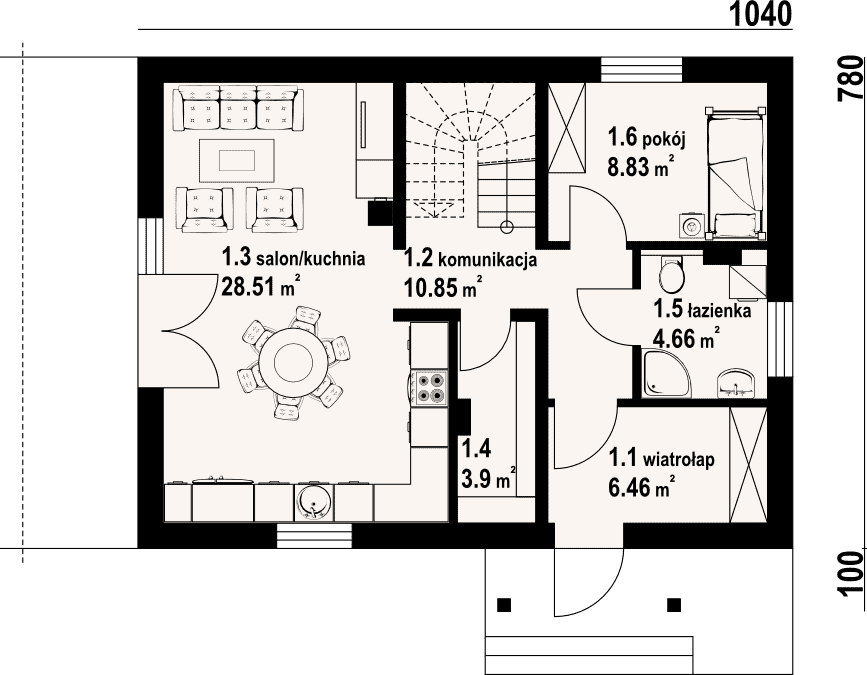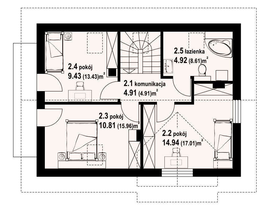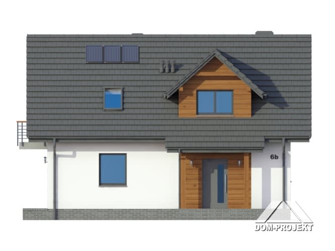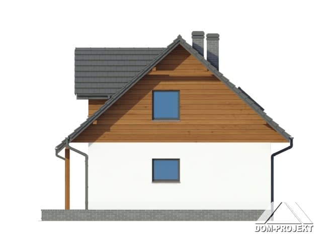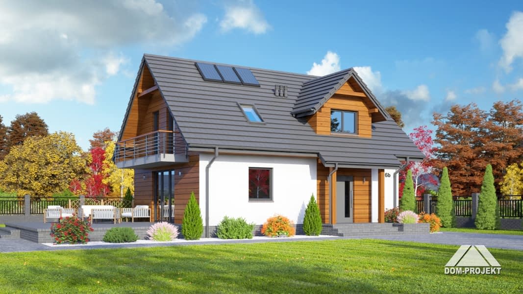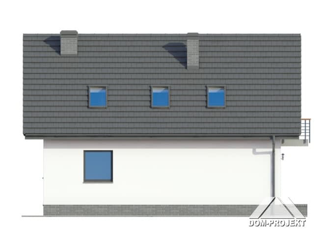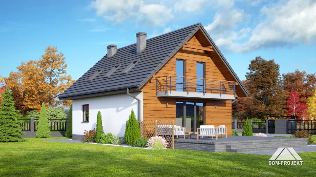 Dom z poddaszem. Duży salon z aneksem kuchennym, kominkiem i wyjściem na taras. Pokój, łazienka, wiatrołap, spiżarka i komunikacja. Na poddaszu trzy pokoje, łazienka, komunikacja i balkon. Zwarta bryła budynku i dach dwuspadowy sprzyjają szybkiej i taniej budowie i niskim kosztom eksploatacji.Rzuty