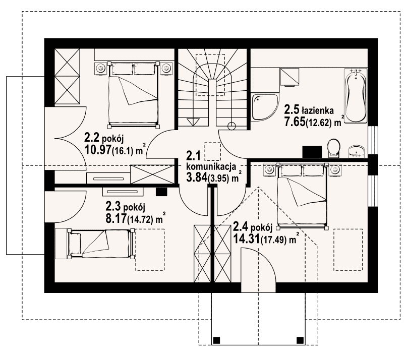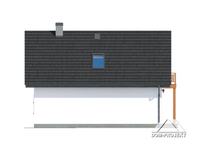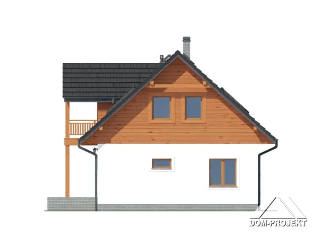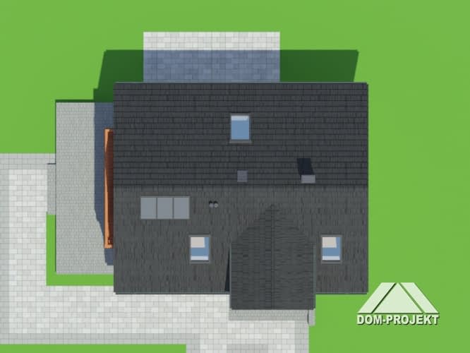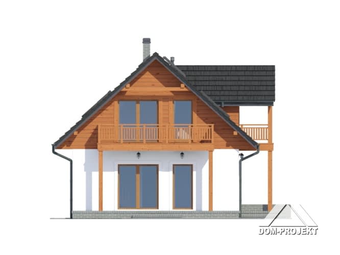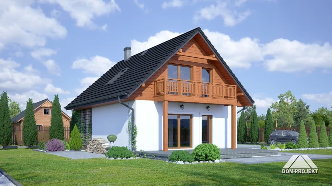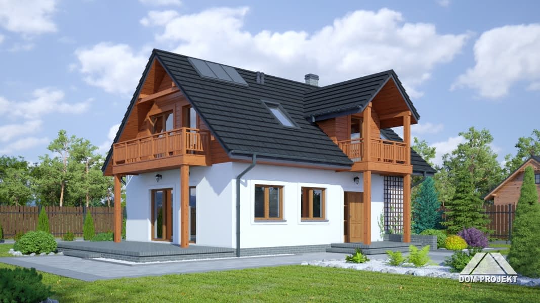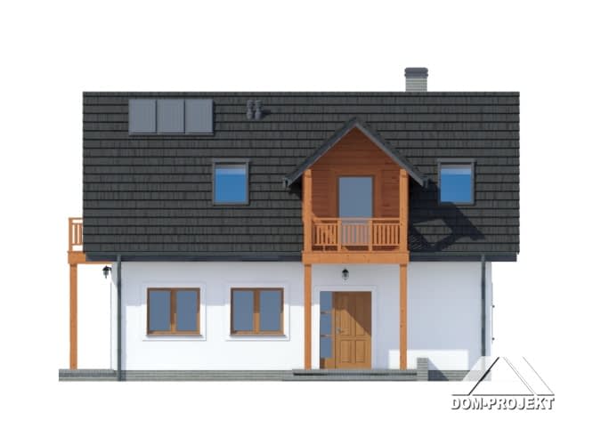 Dom w konstrukcji szkieletu drewnianego. Duży salon z aneksem kuchennym, wyjściem na taras i schodami na poddasze. Pokój, łazienka, garderoba, komunikacja i wiatrołap. Na poddaszu trzy pokoje, łazienka, komunikacja i dwa balkony. Zwarta bryła budynku i dach dwuspadowy sprzyjają szybkiej i taniej budowie i niskim kosztom eksploatacji.Rzuty