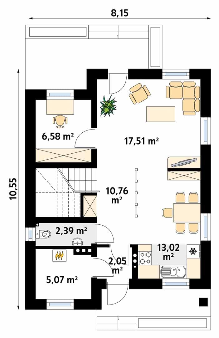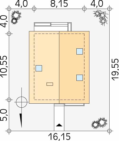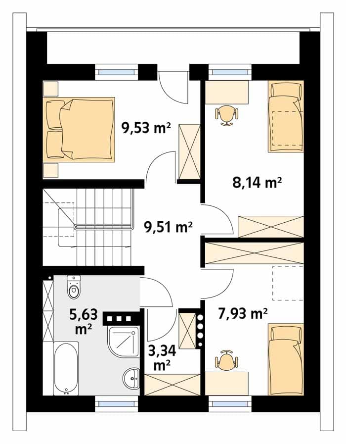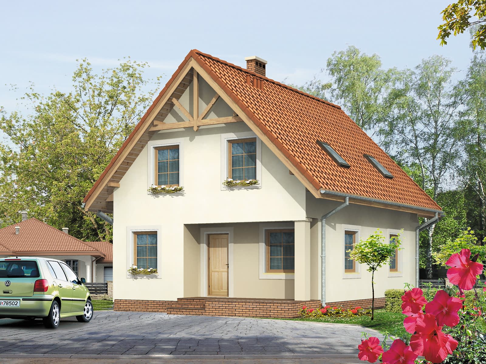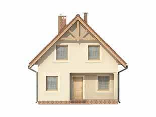Mały dom jednorodzinny z poddaszem użytkowym dla 3 – 4-osobowej rodziny. Na parterze dodatkowy pokój z możliwością wykorzystania na gabinet. Na poddaszu trzy sypialnie, łazienka oraz mała garderoba.Konstrukcja
