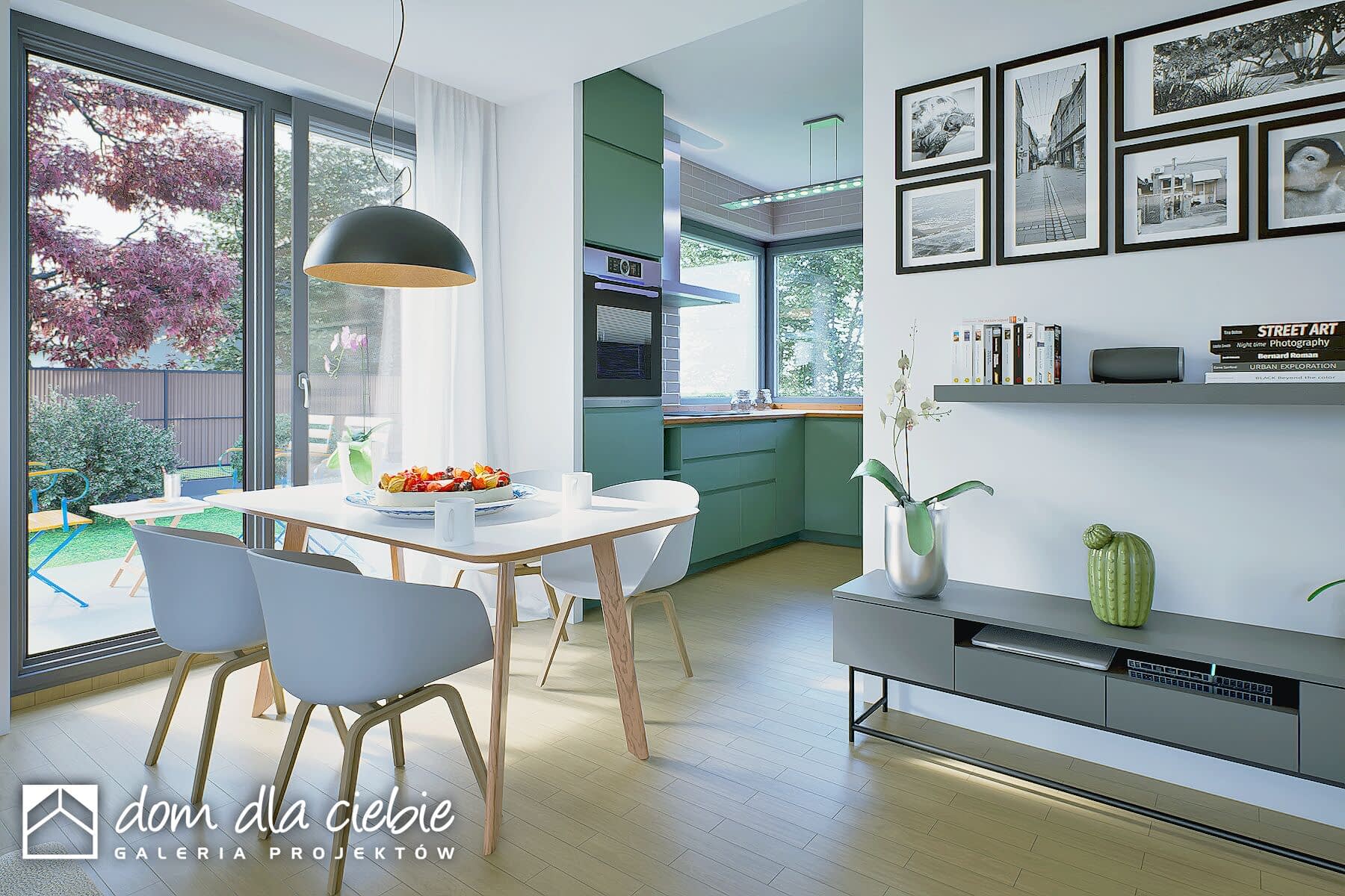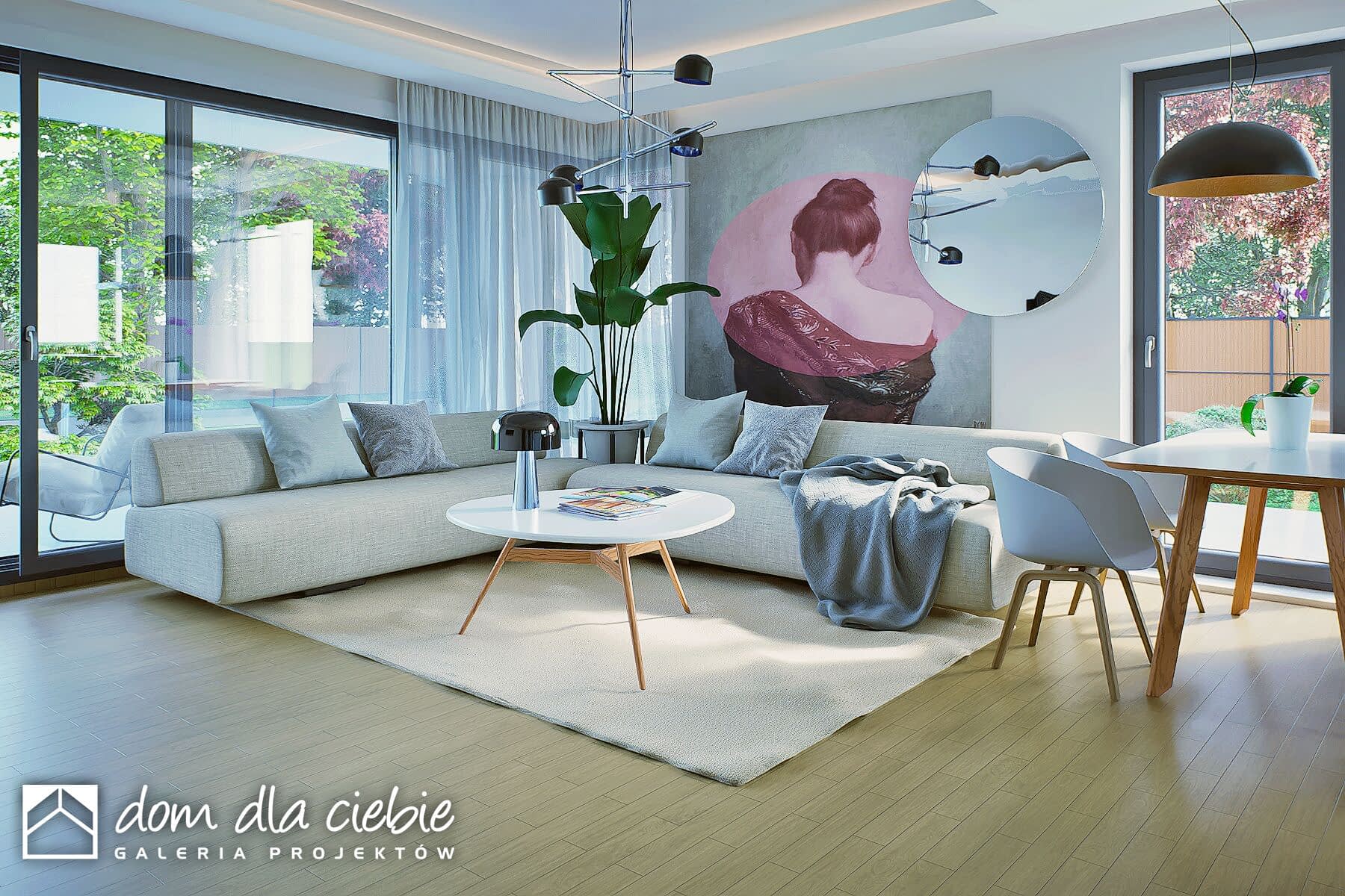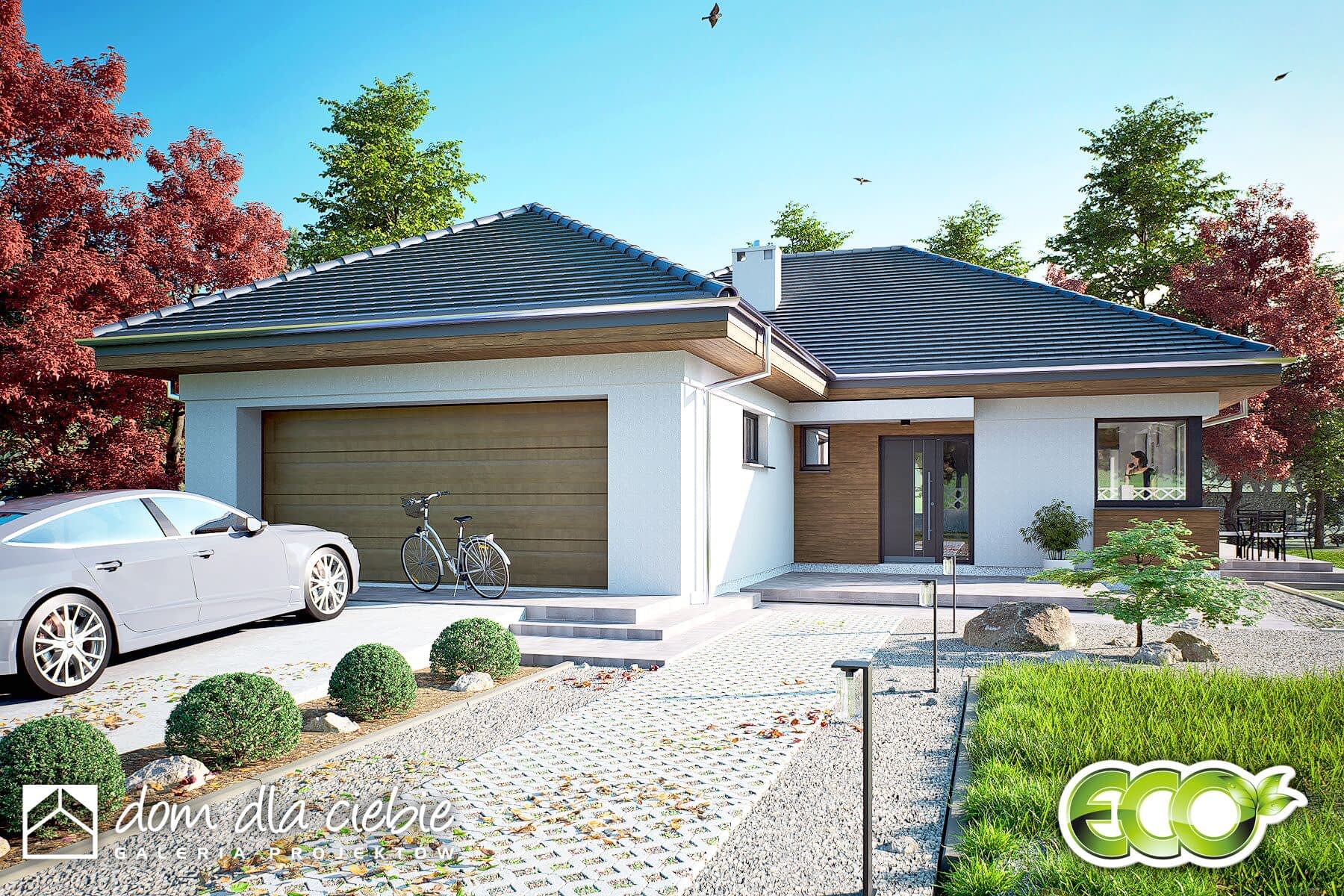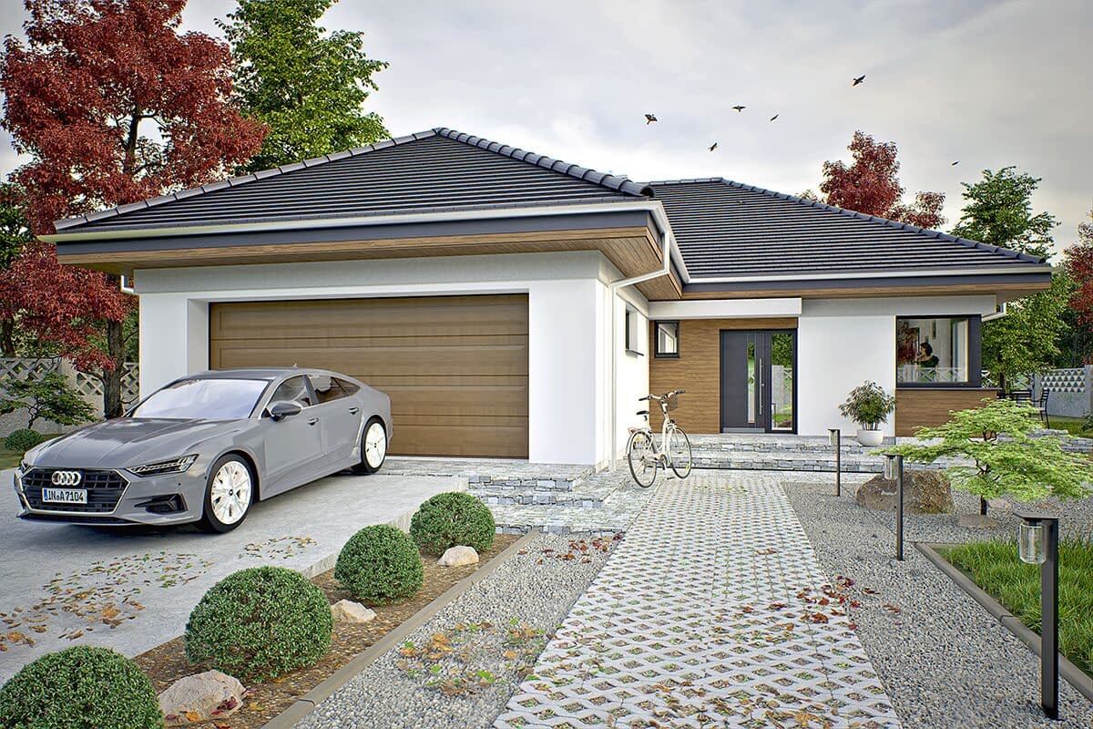 Oliwka to projekt małego, ale wygodnego i praktycznego domu jednorodzinnego z wielospadowym dachem i garażem dwustanowiskowym. Dom wyróżnia się estetycznym wyglądem i zapewnia komfort jego mieszkańcom. Stworzony został z myślą o czteroosobowej rodzinie, a jego uniwersalny design sprawia, że dobrze pasuje zarówno do nowoczesnych osiedli, jak i starszej zabudowy.Wejście prowadzi przez wiatrołap do otwartej przestrzeni dziennej, w której znajdują się salon, kuchnia i jadalnia. W tej strefie zaplanowano kominek oraz dwa wyjścia na taras – z salonu i jadalni. Przy kuchni znajduje się praktyczna spiżarnia, a centralnym miejscem jest jadalnia.Z holu, gdzie zaplanowano szafę wnękową, można przejść do części prywatnej, w której są trzy sypialnie i duża łazienka. Dom ma także eleganckie narożne okna, które dodają mu nowoczesnego wyglądu.To projekt idealny dla osób szukających taniego w budowie i utrzymaniu domu, który spełnia współczesne potrzeby. Uniwersalny styl tego domu to jego duża zaleta.
