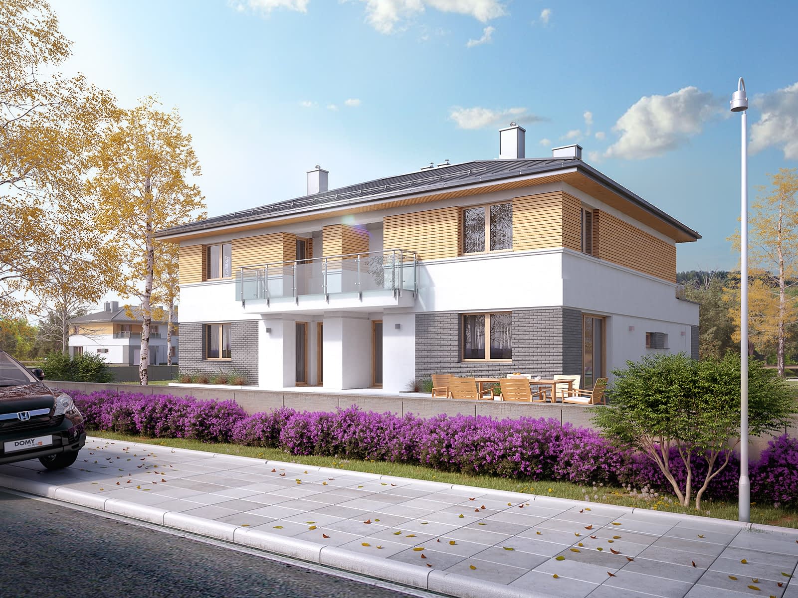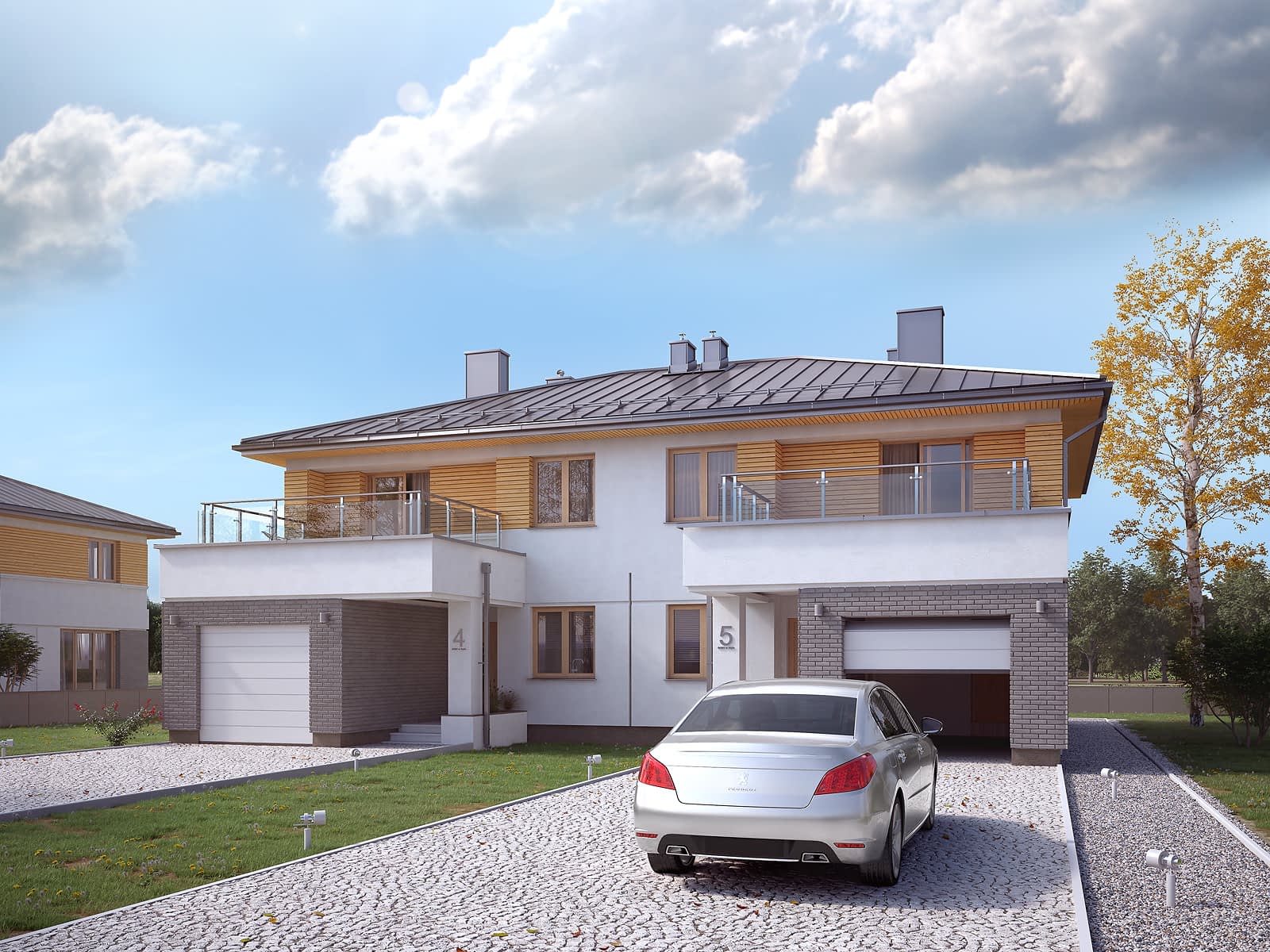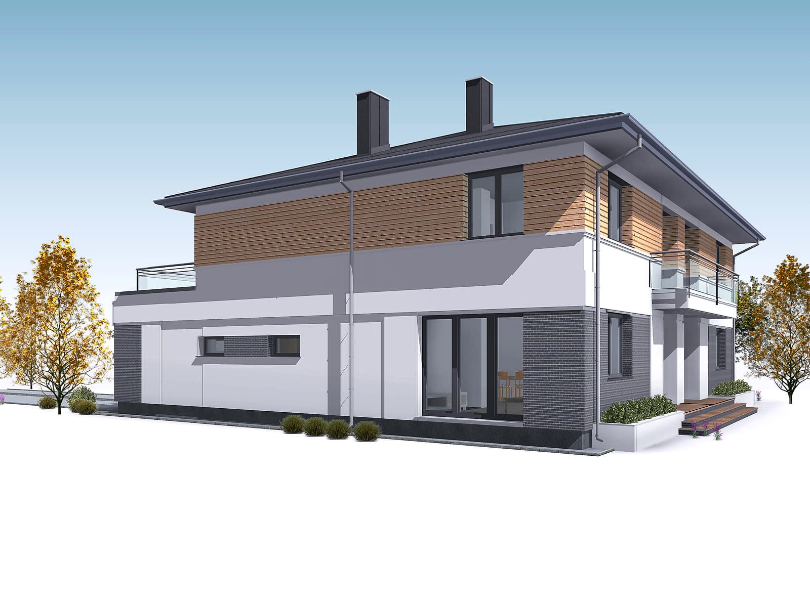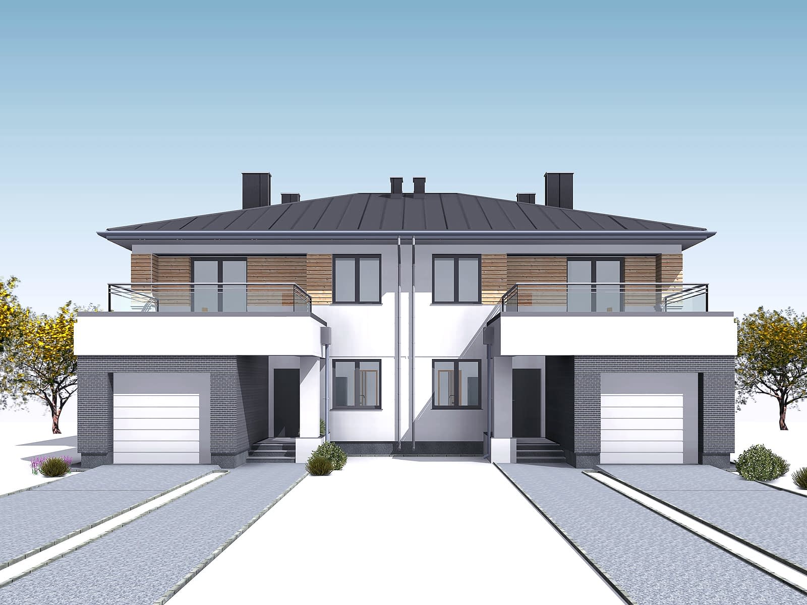 Oliwkowy jest propozycją domu mieszkalnego w zabudowie bliźniaczej. Projekt składa się z dwóch symetrycznych segmentów. Na parterze zaprojektowano przestronną część dzienną. Tworzą ją salon, jadalnia oraz kuchnia ze spiżarnią. Układ funkcjonalny parteru dopełnia WC, wiatrołap, kotłownia oraz jednostanowiskowy garaż. W przestrzeni holu przewidziano również miejsce na dwie szafy. Na piętrze ulokowano trzy wygodne sypialnie oraz rodzinna łazienkę. Nad garażem i wejściem głównym przewidziano obszerny taras. Rozwiązania materiałowe, oszczędny detal oraz szklane balustrady nadają budynkowi nowoczesnego, minimalistycznego charakteru utrzymanego w stylu modernizmu. Segment budynku przeznaczony jest dla 4-osobowej rodziny.Konstrukcja