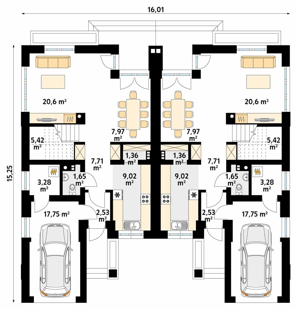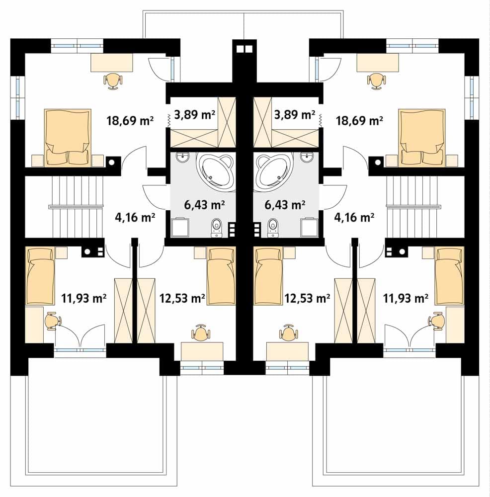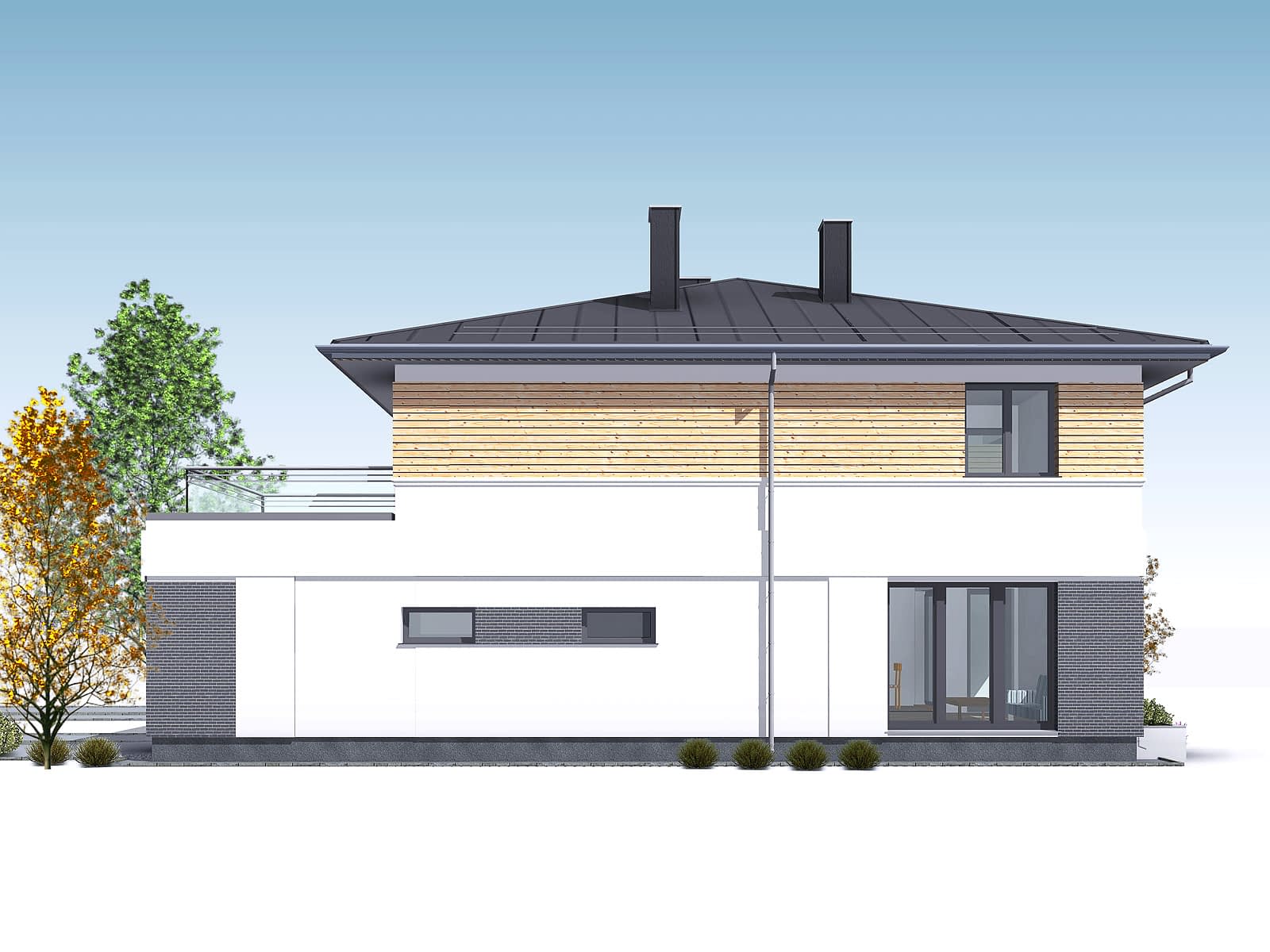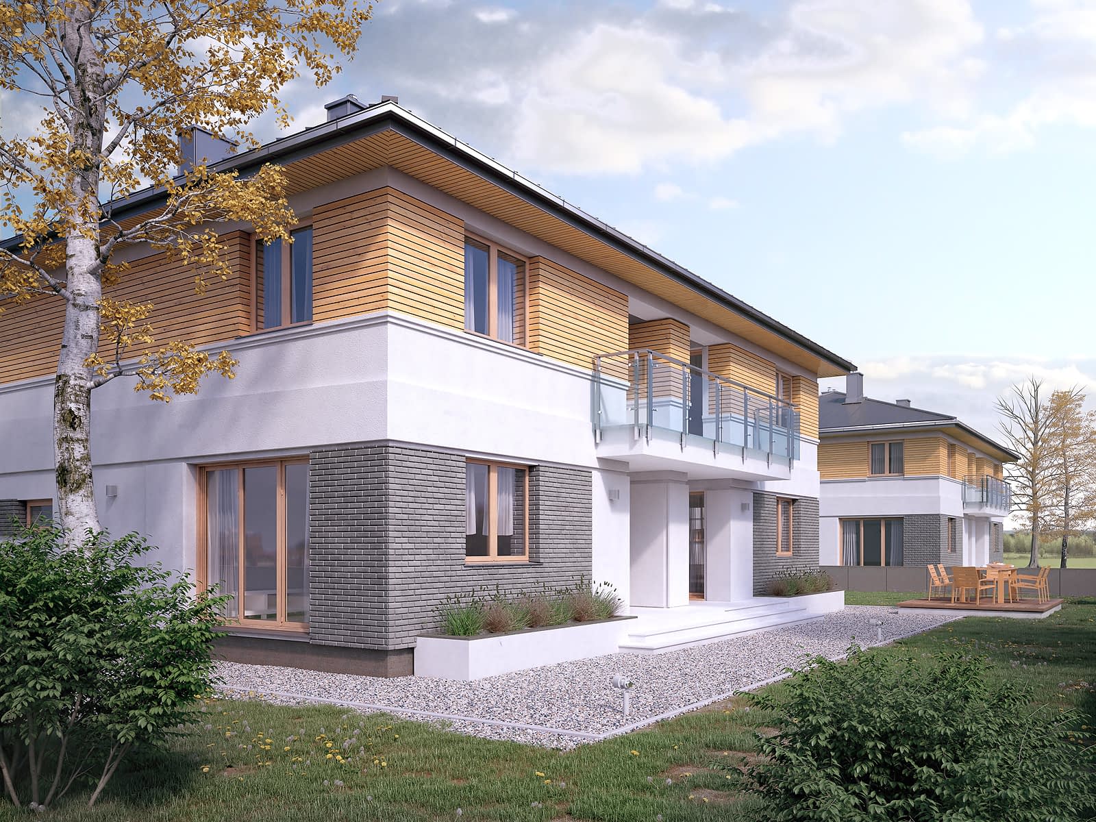 Oliwkowy jest propozycją domu mieszkalnego w zabudowie bliźniaczej. Projekt składa się z dwóch symetrycznych segmentów. Na parterze zaprojektowano przestronną część dzienną. Tworzą ją salon, jadalnia oraz kuchnia ze spiżarnią. Układ funkcjonalny parteru dopełnia WC, wiatrołap, kotłownia oraz jednostanowiskowy garaż. W przestrzeni holu przewidziano również miejsce na dwie szafy. Na piętrze ulokowano trzy wygodne sypialnie oraz rodzinna łazienkę. Nad garażem i wejściem głównym przewidziano obszerny taras. Rozwiązania materiałowe, oszczędny detal oraz szklane balustrady nadają budynkowi nowoczesnego, minimalistycznego charakteru utrzymanego w stylu modernizmu. Segment budynku przeznaczony jest dla 4-osobowej rodziny.Konstrukcja