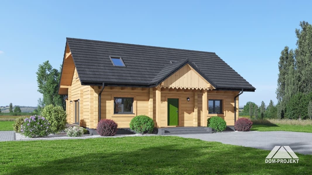 Dom drewniany z poddaszem użytkowym. Podpiwniczony. Na parterze salon z kuchnią, kominkiem oraz wyjściem na duży, zadaszony taras. Na poddaszu trzy pokoje, dwie łazienki, komunikacja. W podpiwniczeniu cztery piwnice oraz komunikacja. Zwarta bryła budynku i dach dwuspadowy sprzyjają szybkiej i taniej budowie oraz niskim kosztom eksploatacji.Rzuty