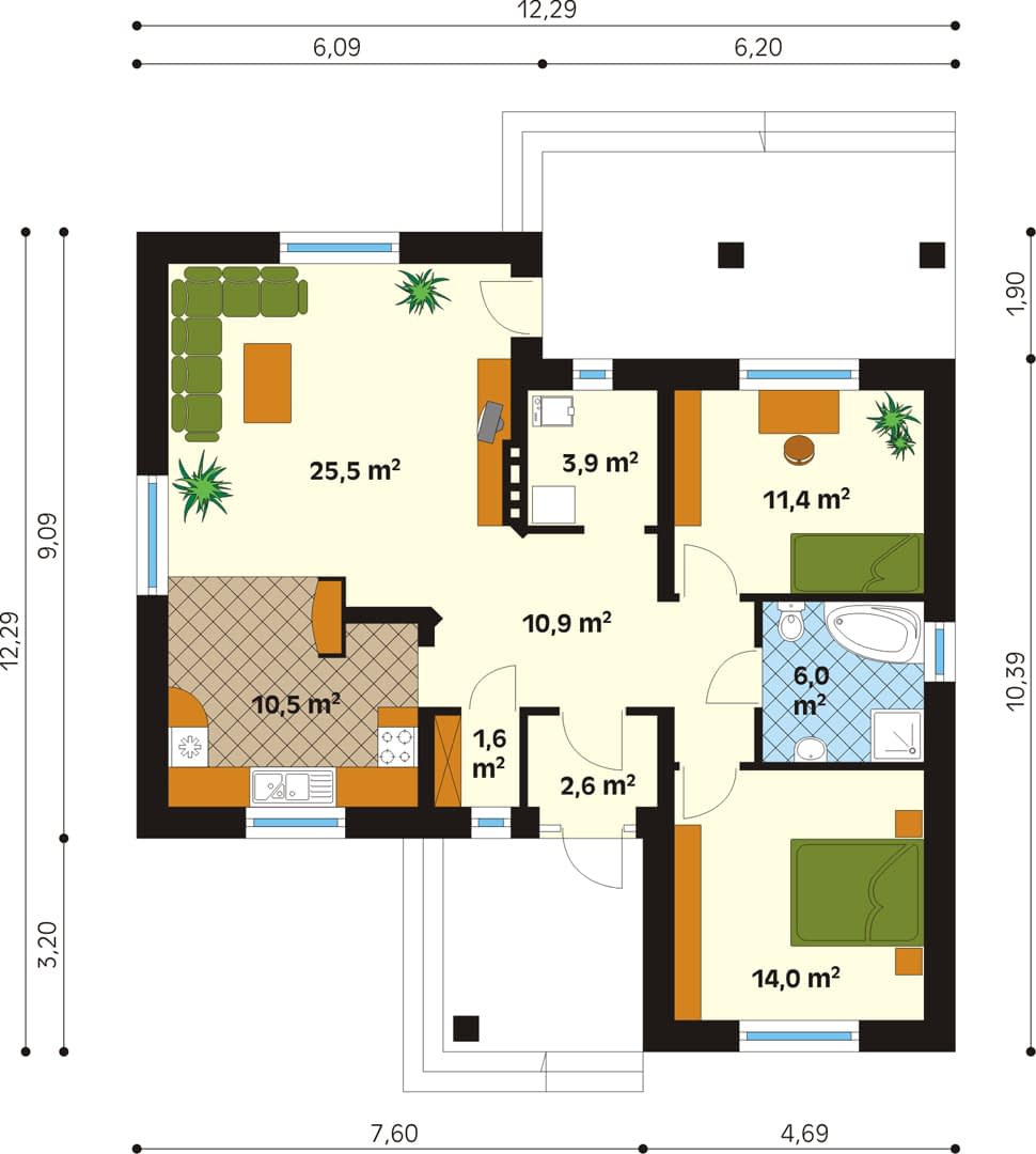 - Długość domu12.25 m
