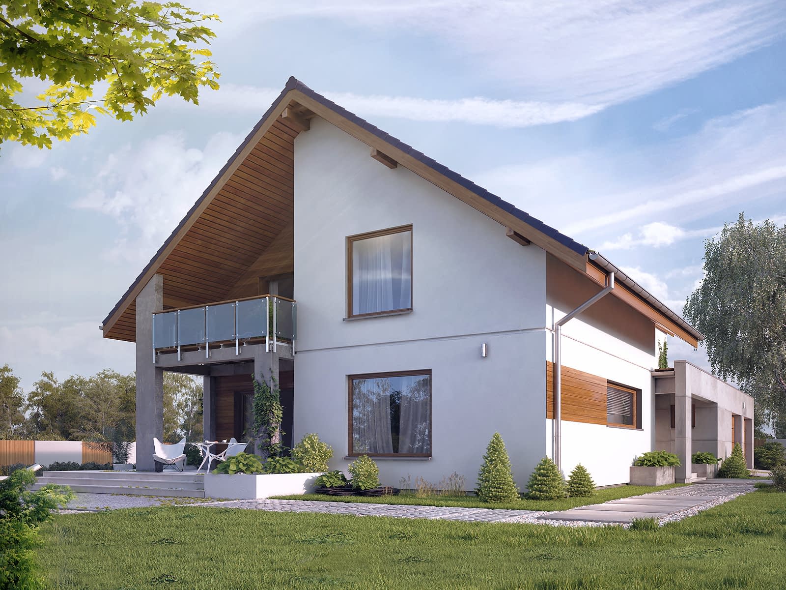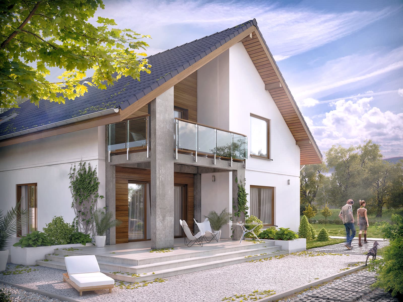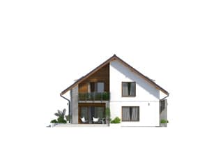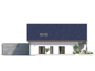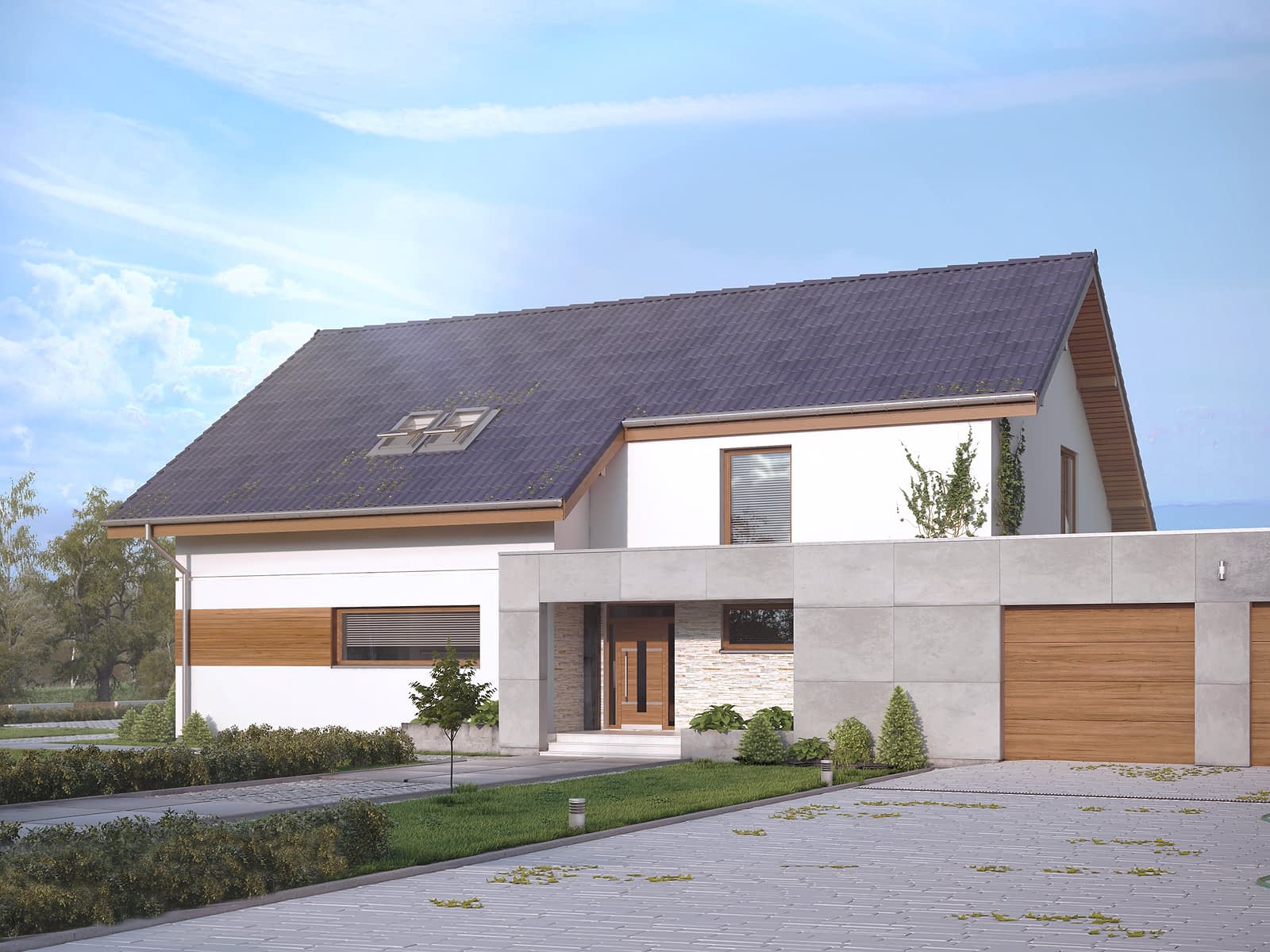 Onyks 4 to nowoczesny dom jednorodzinny z użytkowym poddaszem idealny dla 4-osobowej rodziny. Bryła budynku łączy w sobie cechy zarówno domu nowoczesnego oraz tradycyjnego. Dwuspadowy dach w połączeniu z nowoczesnym wykończeniem elewacji frontowej tworzy intrygujący efekt końcowy. Na parterze oprócz kuchni z jadalnią oraz salonu, znajduje się apartament gospodarzy z własną łazienką oraz garderobą. Na poddaszu dodatkowo zaprojektowano dwie sypialnie, łazienkę oraz kącik rekreacyjny idealny do zagłębienia się w lekturze. Niewątpliwym atutem projektu jest dwustanowiskowy garaż oraz rozległy taras zlokalizowany tuż nad nim.Konstrukcja