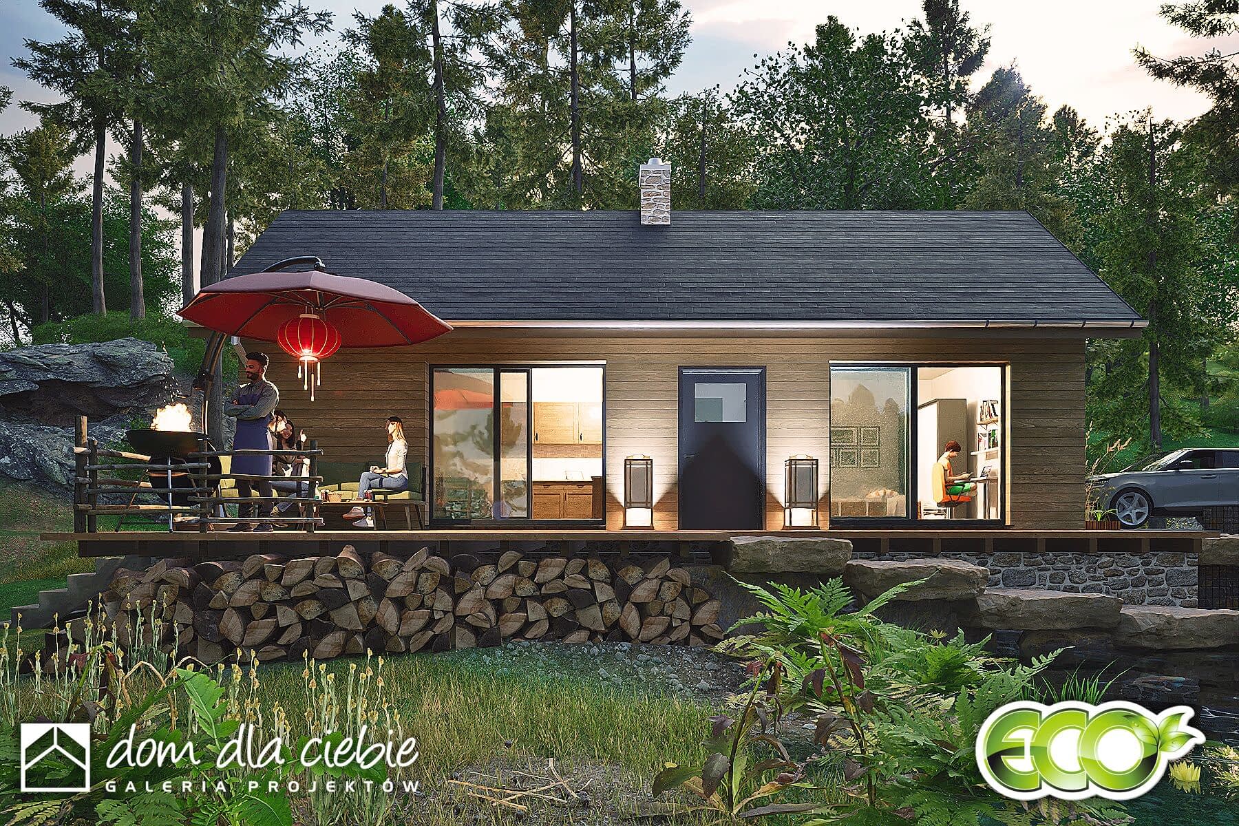 Opieńka to mały, murowany domek weekendowy o dwuspadowym dachu i naturalnej drewnianej elewacji z antracytowymi detalami. Projekt ten skupia się na ekonomicznym podejściu, oferując niewielkie witryny tarasowe dla kontaktu z naturą. Zaledwie 70 m2 powierzchni zabudowy pozwala na harmonijne wkomponowanie się w otoczenie. Wewnątrz znajduje się wiatrołap z szafą, łazienka z prysznicem, niewielka kuchnia, strefa wypoczynkowa z kominkiem oraz miejsce na stół jadalny. Taras stanowi płynne przedłużenie wnętrza na zewnątrz. Opieńka to propozycja ekonomicznego i ekologicznego domu, idealnego na relaksujące weekendy.