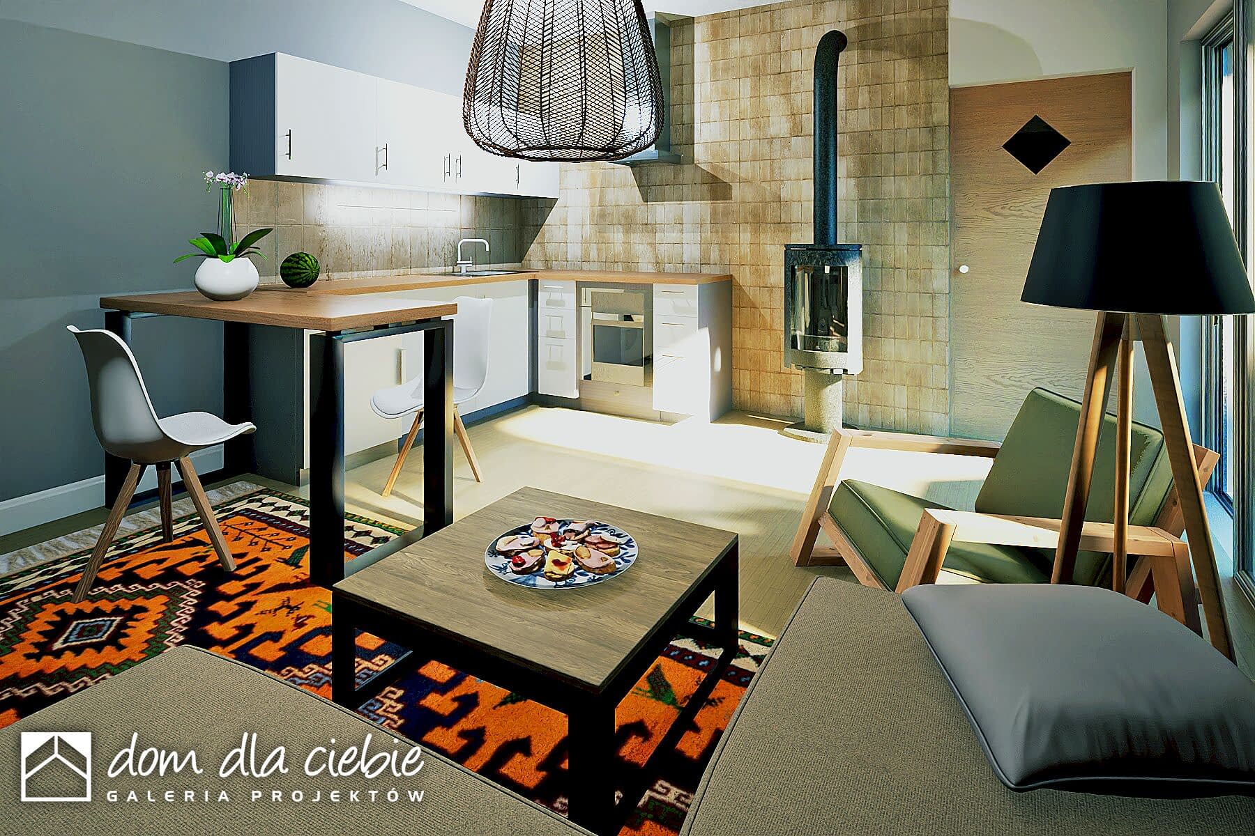 Opieńka to mały, murowany domek weekendowy o dwuspadowym dachu i naturalnej drewnianej elewacji z antracytowymi detalami. Projekt ten skupia się na ekonomicznym podejściu, oferując niewielkie witryny tarasowe dla kontaktu z naturą. Zaledwie 70 m2 powierzchni zabudowy pozwala na harmonijne wkomponowanie się w otoczenie. Wewnątrz znajduje się wiatrołap z szafą, łazienka z prysznicem, niewielka kuchnia, strefa wypoczynkowa z kominkiem oraz miejsce na stół jadalny. Taras stanowi płynne przedłużenie wnętrza na zewnątrz. Opieńka to propozycja ekonomicznego i ekologicznego domu, idealnego na relaksujące weekendy.