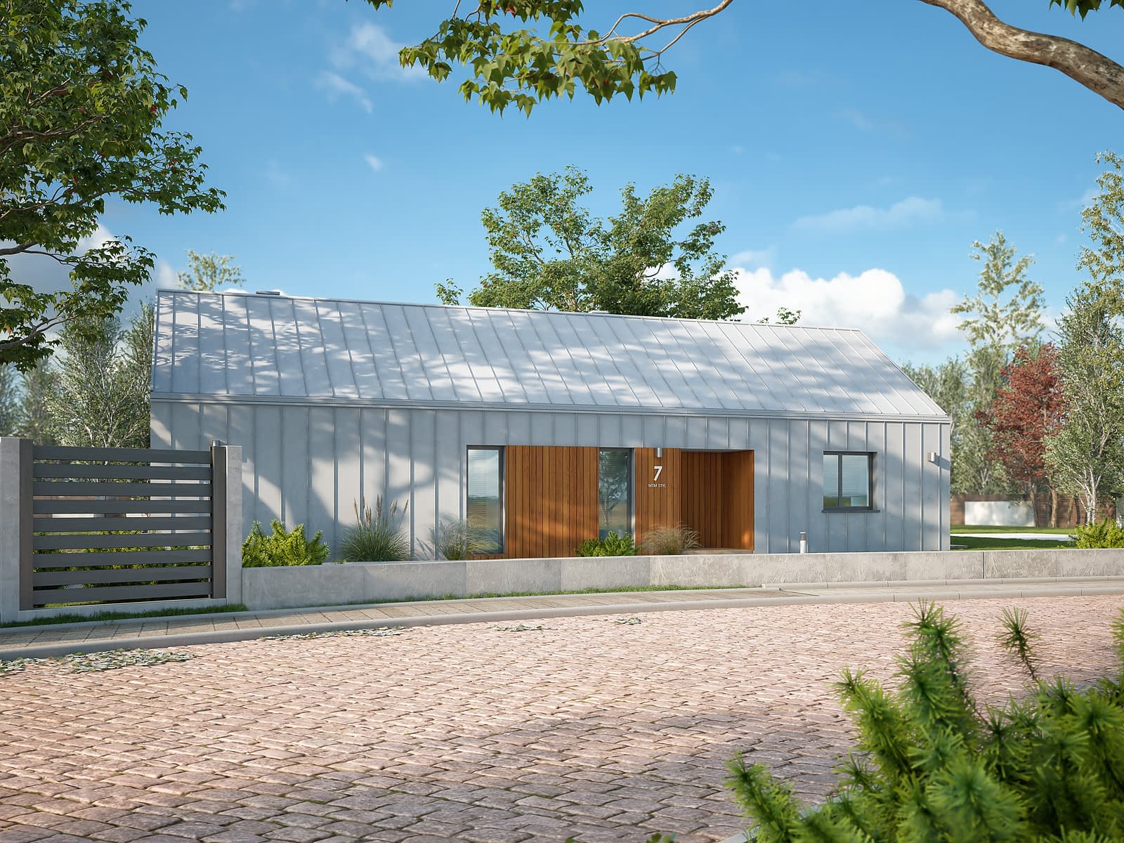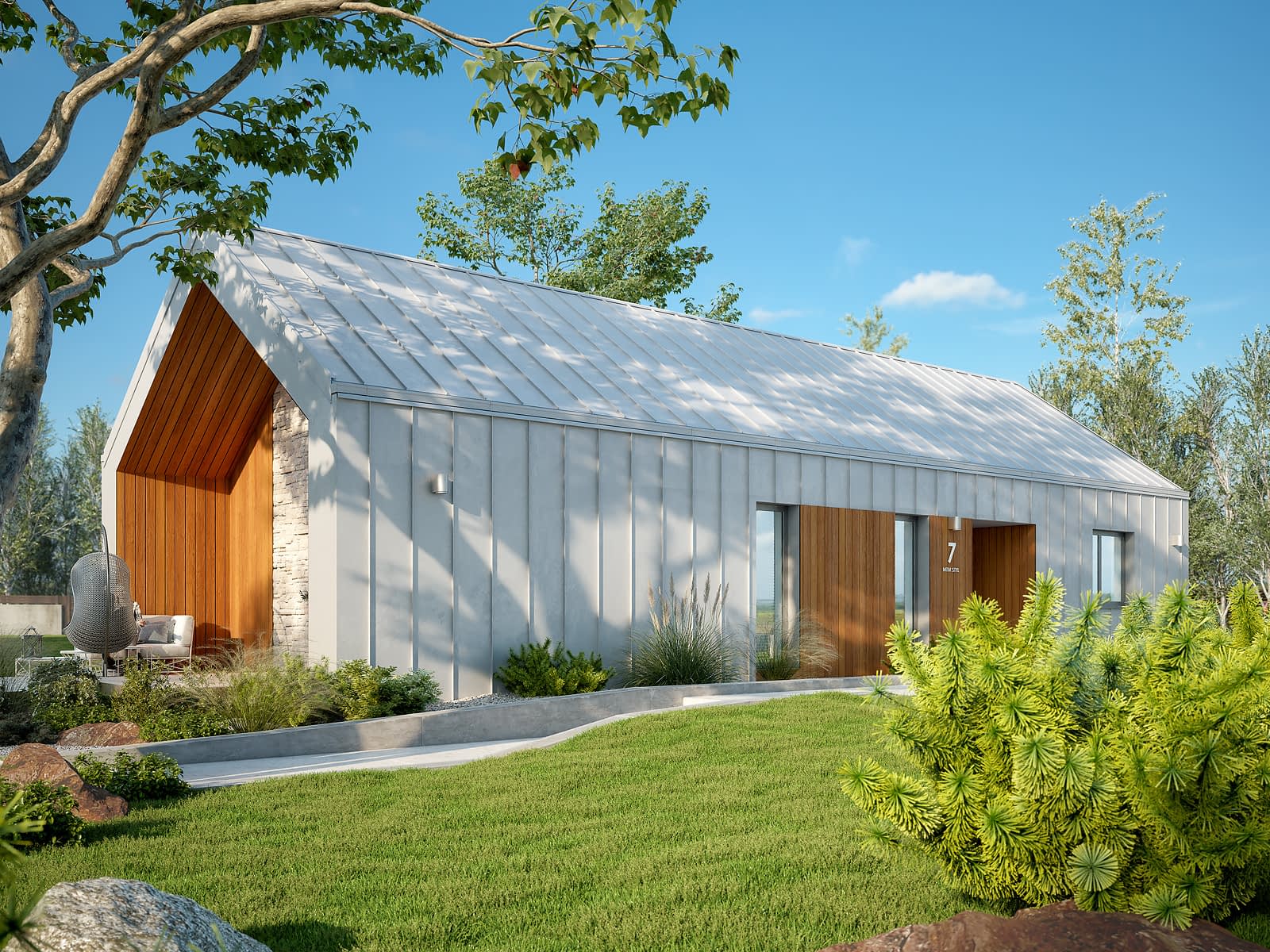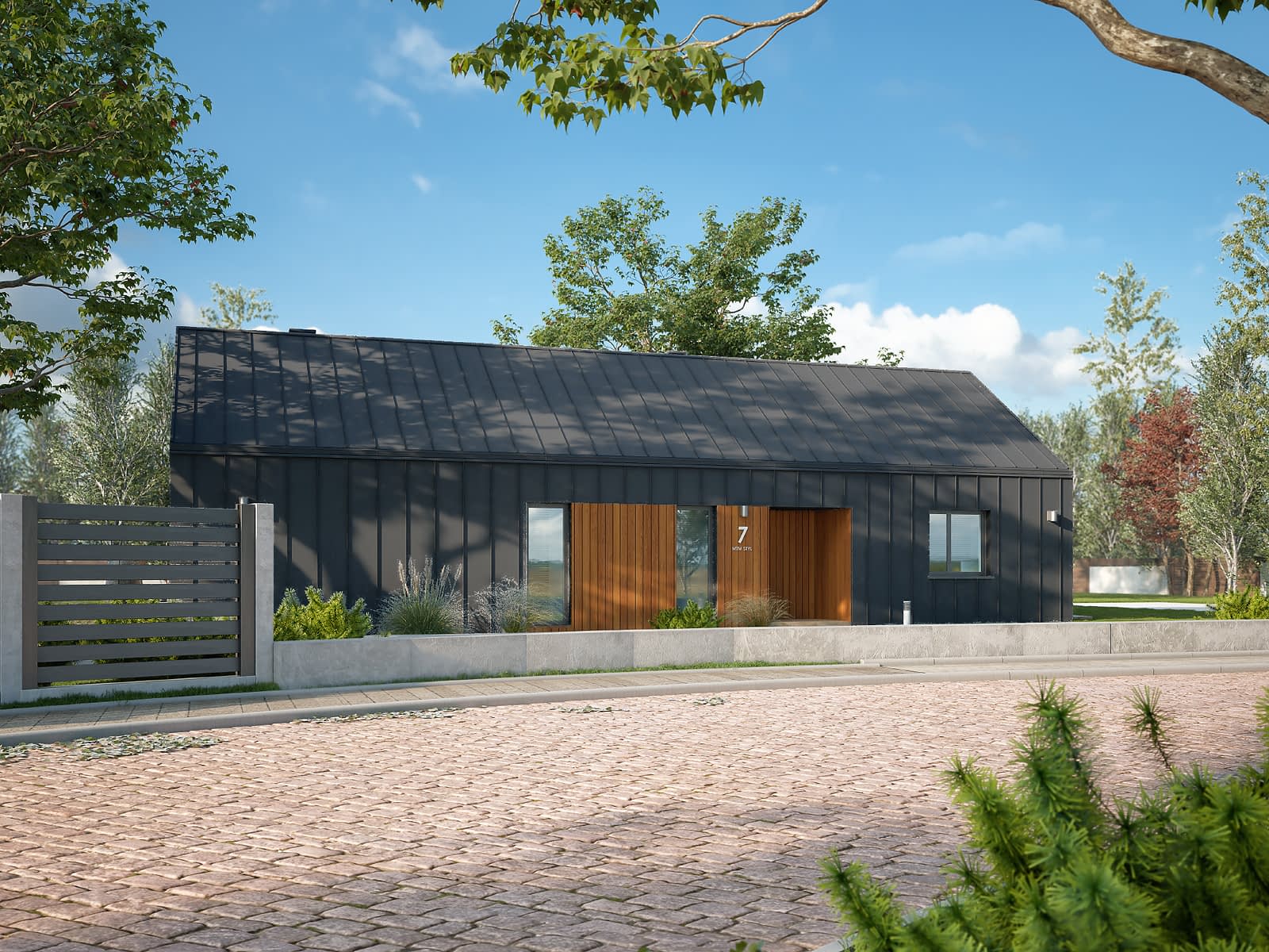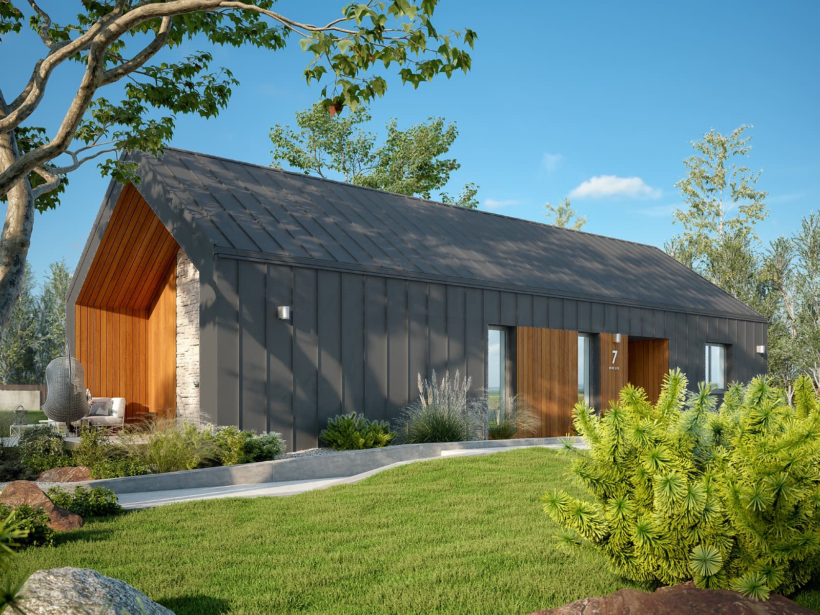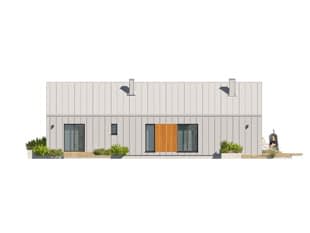 Opuncja to parterowy projekt domu o nowoczesnej formie. Prosta bryła na planie prostokąta została przykryta dwuspadowym dachem bez okapów, co jest charakterystyczne dla projektów w stylu nowoczesnej stodoły. Projekt jest odpowiedzią na trzy główne założenia: minimalistyczna forma nawiązująca do tradycyjnej zabudowy, reprezentacyjna strefa dzienna z sufitem sięgającym dachu oraz wygodny taras. W prostym i wygodnym układzie pomieszczeń zachowano podział na strefę dzienną i nocną. Otwarta strefa dzienna składa się z salonu, jadalni oraz otwartej kuchni. W części prywatnej znajdują się dwie sypialnie oraz łazienka. Uzupełnieniem układu funkcjonalnego jest przedsionek z dodatkowym pomieszczeniem gospodarczym. Opuncja może być punktem wyjścia do zaprojektowania większego domu, np. z poddaszem użytkowym i antresolą lub z garażem.Konstrukcja