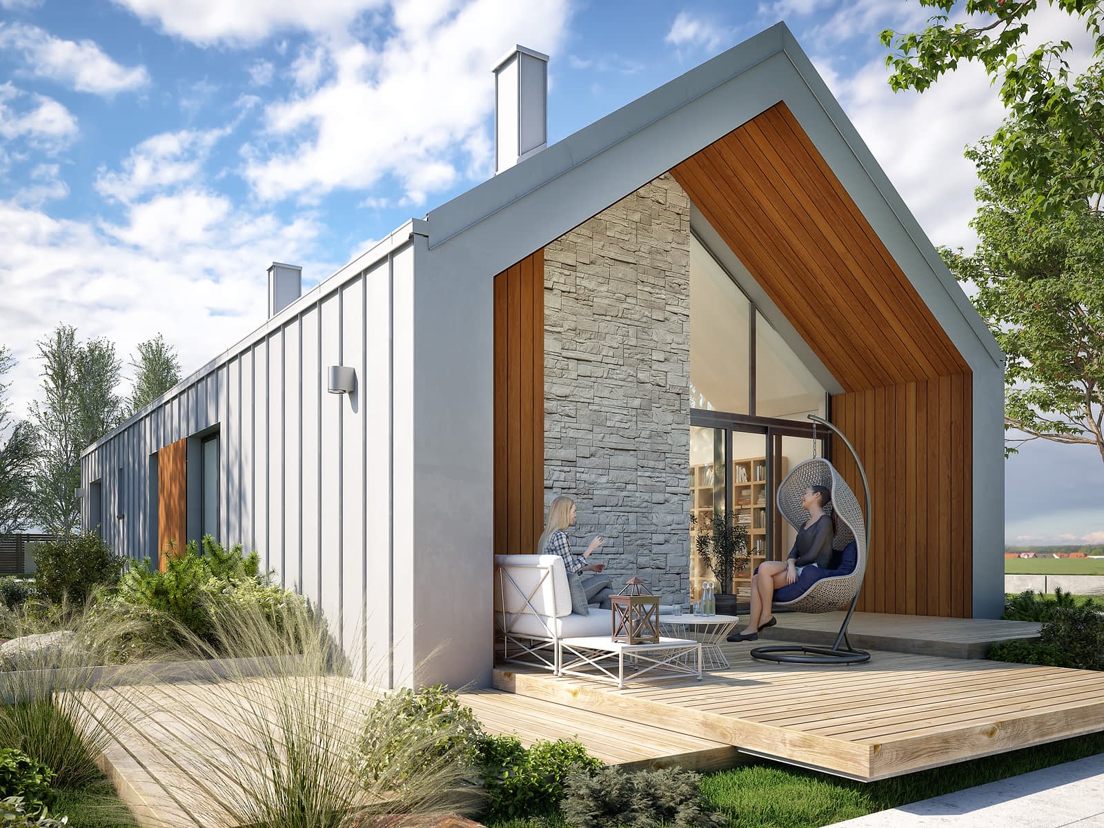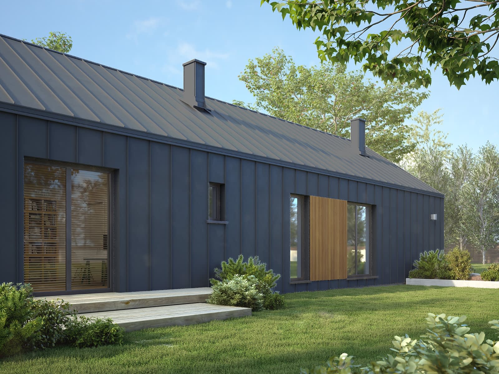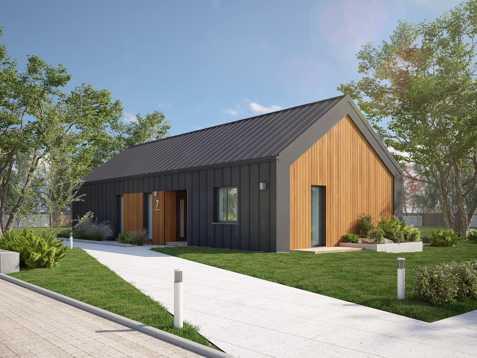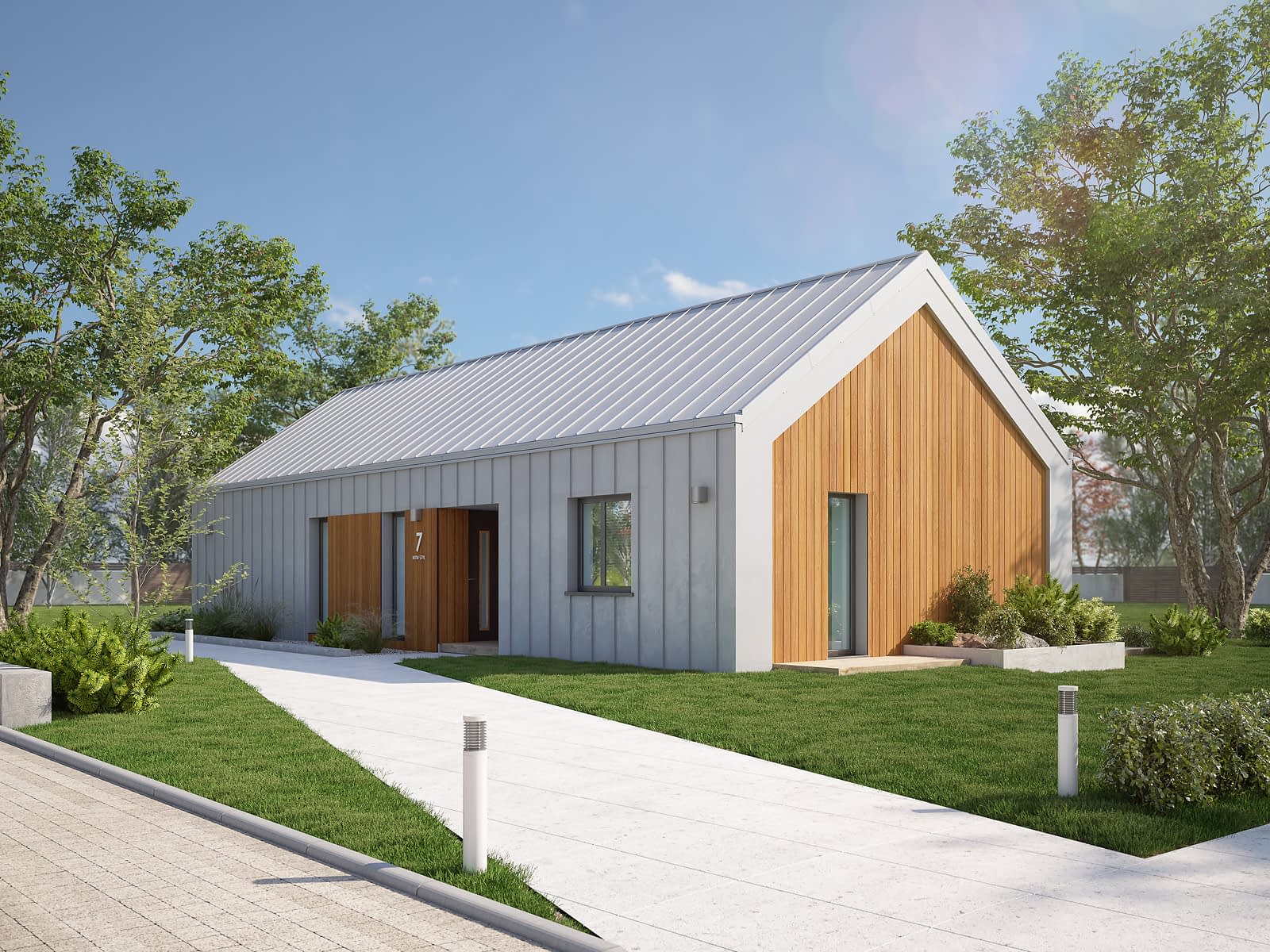 Opuncja to parterowy projekt domu o nowoczesnej formie. Prosta bryła na planie prostokąta została przykryta dwuspadowym dachem bez okapów, co jest charakterystyczne dla projektów w stylu nowoczesnej stodoły. Projekt jest odpowiedzią na trzy główne założenia: minimalistyczna forma nawiązująca do tradycyjnej zabudowy, reprezentacyjna strefa dzienna z sufitem sięgającym dachu oraz wygodny taras. W prostym i wygodnym układzie pomieszczeń zachowano podział na strefę dzienną i nocną. Otwarta strefa dzienna składa się z salonu, jadalni oraz otwartej kuchni. W części prywatnej znajdują się dwie sypialnie oraz łazienka. Uzupełnieniem układu funkcjonalnego jest przedsionek z dodatkowym pomieszczeniem gospodarczym. Opuncja może być punktem wyjścia do zaprojektowania większego domu, np. z poddaszem użytkowym i antresolą lub z garażem.Konstrukcja