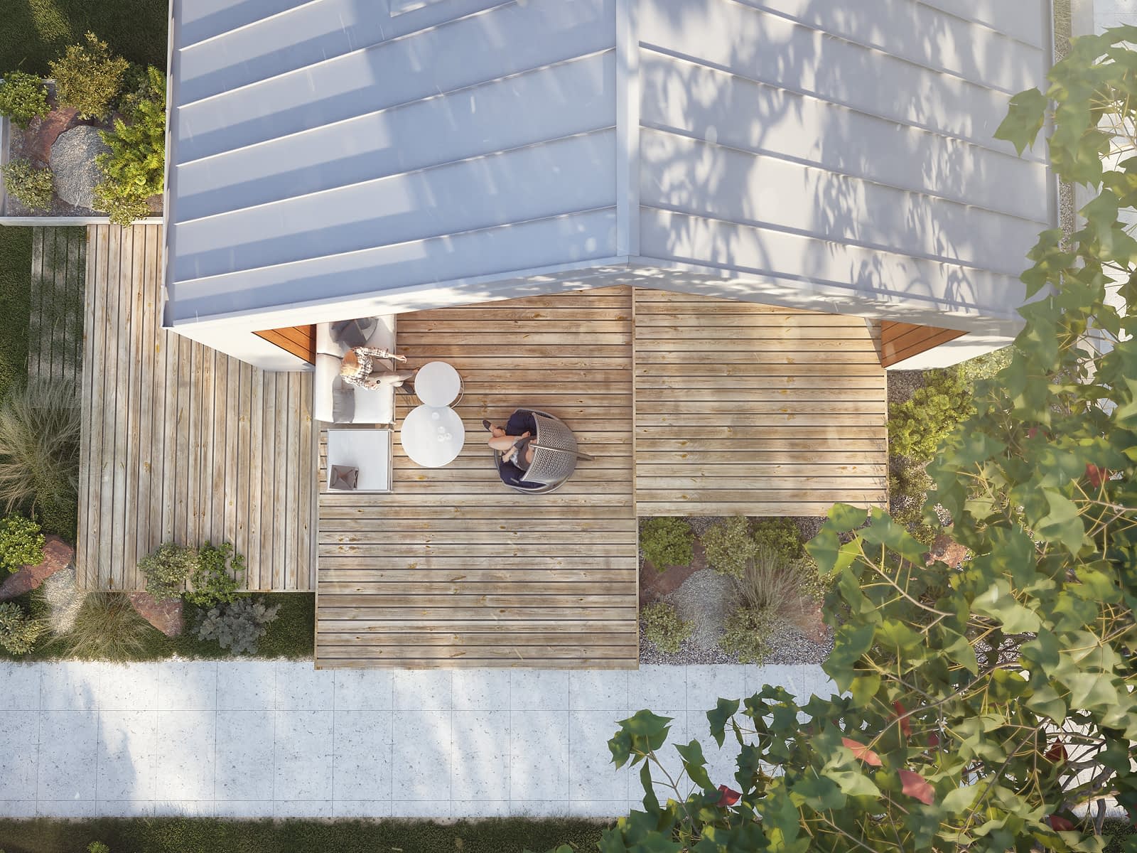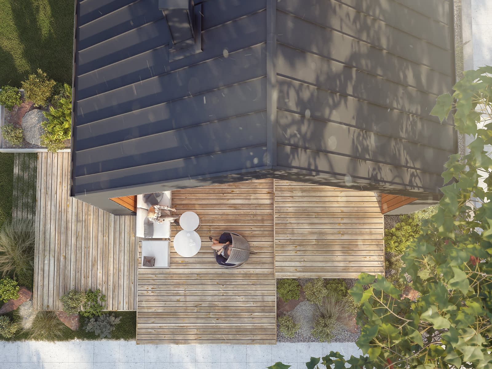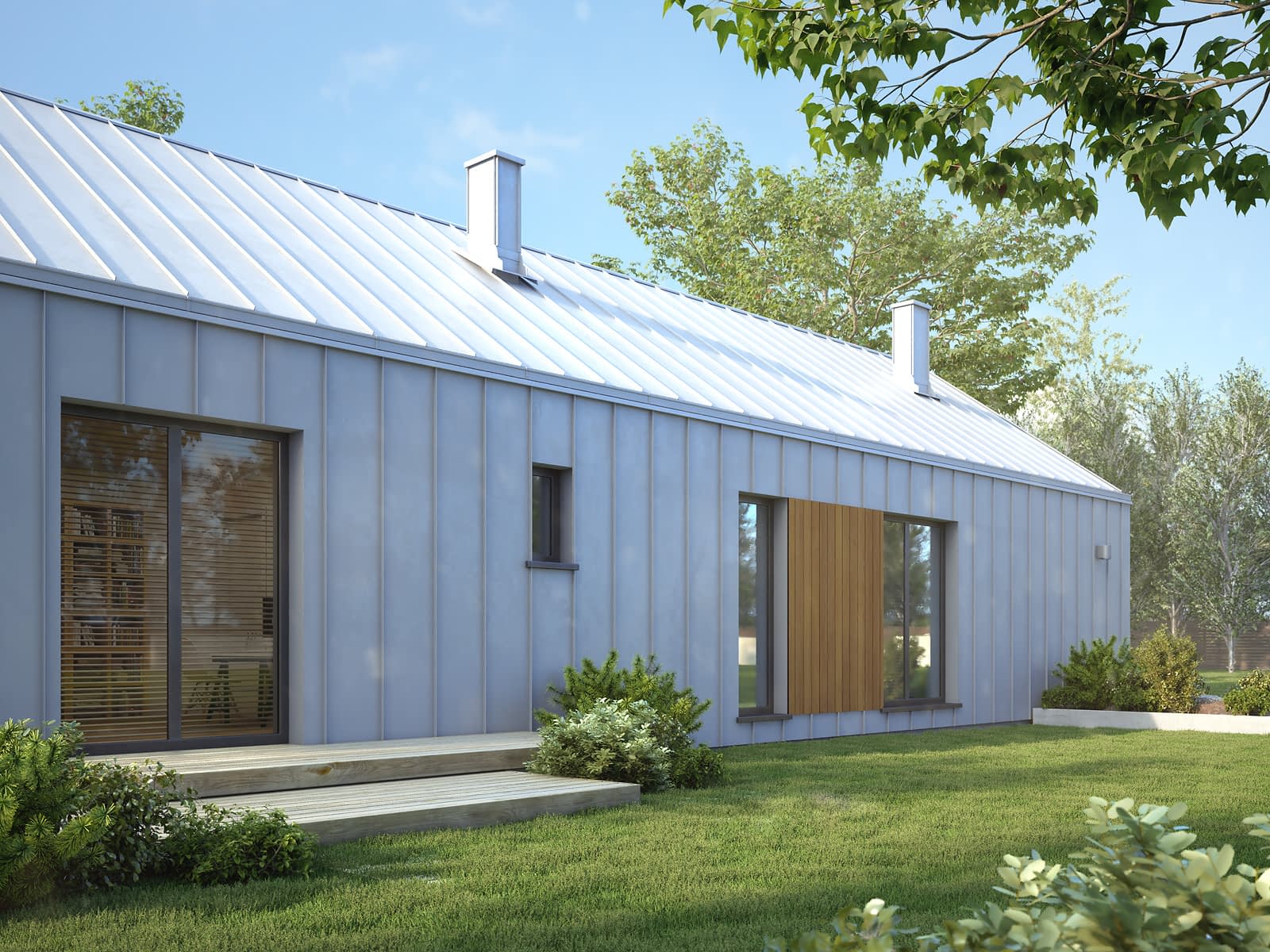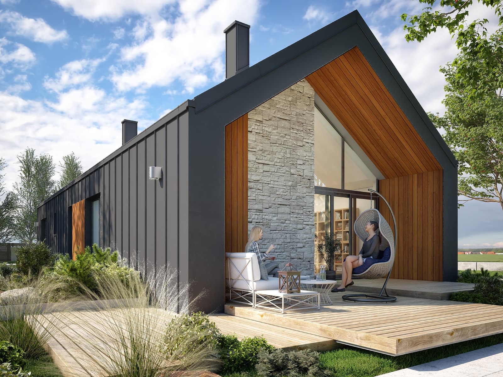 Opuncja to parterowy projekt domu o nowoczesnej formie. Prosta bryła na planie prostokąta została przykryta dwuspadowym dachem bez okapów, co jest charakterystyczne dla projektów w stylu nowoczesnej stodoły. Projekt jest odpowiedzią na trzy główne założenia: minimalistyczna forma nawiązująca do tradycyjnej zabudowy, reprezentacyjna strefa dzienna z sufitem sięgającym dachu oraz wygodny taras. W prostym i wygodnym układzie pomieszczeń zachowano podział na strefę dzienną i nocną. Otwarta strefa dzienna składa się z salonu, jadalni oraz otwartej kuchni. W części prywatnej znajdują się dwie sypialnie oraz łazienka. Uzupełnieniem układu funkcjonalnego jest przedsionek z dodatkowym pomieszczeniem gospodarczym. Opuncja może być punktem wyjścia do zaprojektowania większego domu, np. z poddaszem użytkowym i antresolą lub z garażem.Konstrukcja