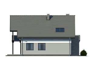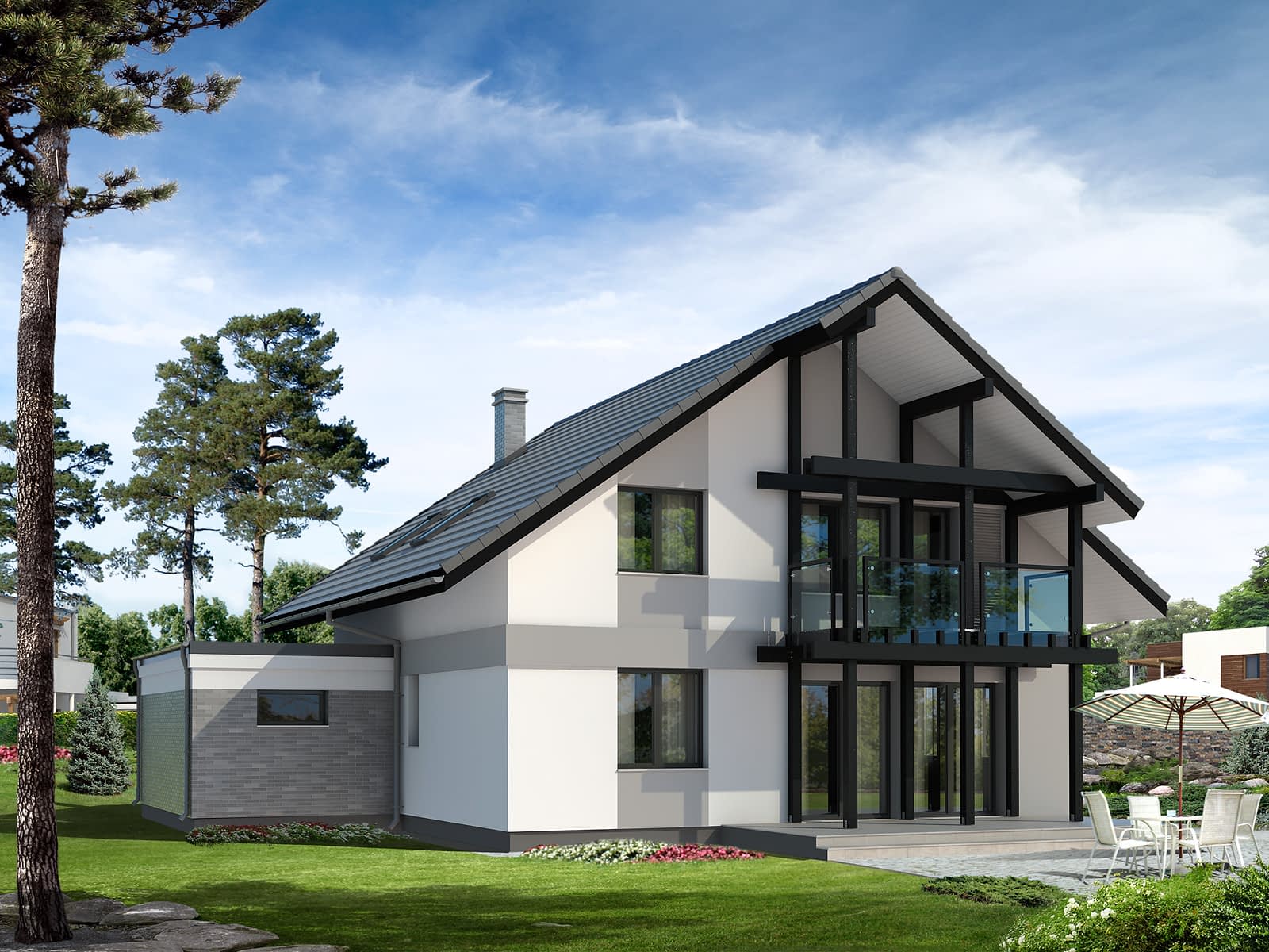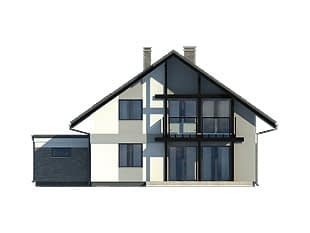 Budynek jednorodzinny przeznaczony dla rodziny 4 – 5-osobowej. Zwarta bryła domu oparta na kwadracie wzbogacona została dostawioną bryłą garażu i konstrukcją balkonu zadaszającego wejście główne. Ażurowa drewniana konstrukcja balkonu od strony ogrodowej decyduje o charakterze domu, a prosty dwuspadowy dach nabiera lekkości dzięki wysuniecu jego połaci nad tę konstrukcję. Wygodę użytkowania gwarantują liczne pomieszczenia dodatkowe: na parterze dwa pomieszczenia gospodarcze i spiżarnia, na poddaszu odrębna pralnia i garderoba.Konstrukcja