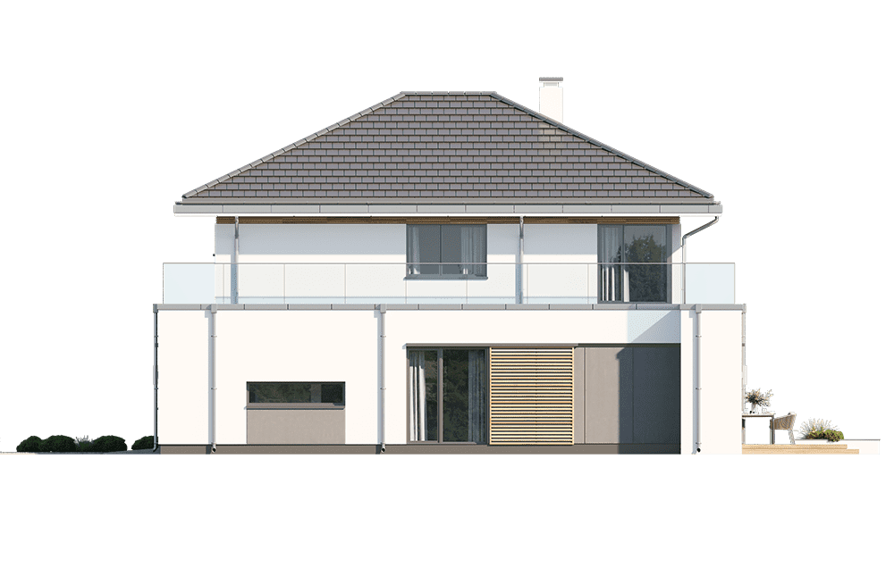 Projekt domu Orkan jest propozycją nowoczesnej, komfortowej willi miejskiej, będącej spełnieniem marzeń o wygodnym życiu w otoczeniu pięknych przedmiotów. Projekt domu Orkan ma oryginalną formę i stylistykę. Łączy w sobie cechy domu piętrowego z domem parterowym, z mocno przenikającym się wnętrzem z otaczającym ogrodem. Dzięki cofnięciu głównego piętrowego rdzenia budynku uzyskaliśmy bardziej rozczłonkowaną, bliższą ludzkiej skali bryłę domu. Taki zabieg wprowadził do architektury projektu właściwe proporcje i skalę. Dom jest jednocześnie duży i mały, wysoki i niski, rozległy i zwarty w sobie. Sylwetkę budynku zaprojektowano wprowadzając wzajemnie kontrastujące ze sobą fragmenty jasnych i ciemnych ścian. Duże przeszklenia okien i drzwi balkonowych dobrze doświetlają wnętrze i łączą pomieszczenia z ogrodem. Na parterze zaprojektowano otwartą część dzienną, z salonem, jadalnią, holem z pięknie wyeksponowanymi schodami, oraz kuchnią. Na dolnej kondygnacji mamy też - co jest rzadkością w niedużych domach piętrowych - dwa dodatkowe pokoje : apartament sypialny z łazienką i garderobą i pokój - gabinet. Dzięki temu mamy w projekcie pięć pokoi i salon. Na parterze mieści się podwójny garaż i kotłownia. Na piętrze znajdują się trzy sypialnie, dwie łazienki i pralnia. Kondygnacje połączone są ze sobą otworem schodowym z dwukondygnacyjną ścianą – galerią, oraz dodatkowo pustką nad jadalnią z antresolą na piętrze (pustkę można też zabudować dodając kolejny pokój na piętrze). Orkan ma dość prostą konstrukcję, zaprojektowano go z energooszczędnych nowoczesnych materiałów. Koszty utrzymania budynku nie będą wysokie. Projekt domu Orkan jest doskonałą propozycją dla osób zamierzających budować dom piętrowy, ale chcący czegoś bardziej oryginalnego niż zwykła piętrowa kostka, a jednocześnie pragnących domu o nowoczesnej architekturze. Zapraszamy !