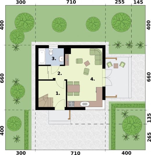 - Minimalne wymiary działki14.6 x 14.1m