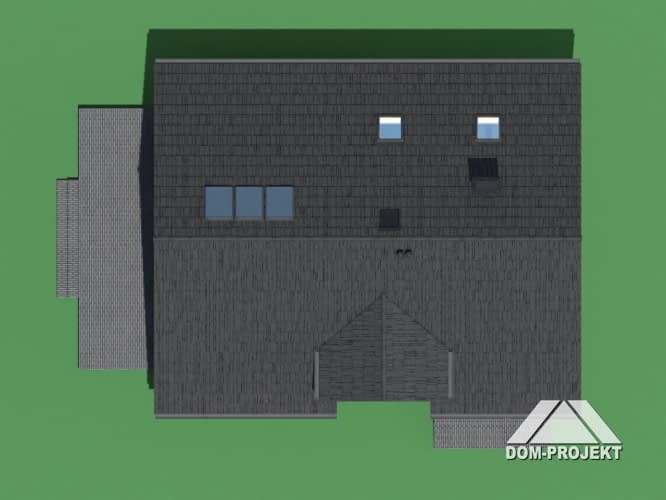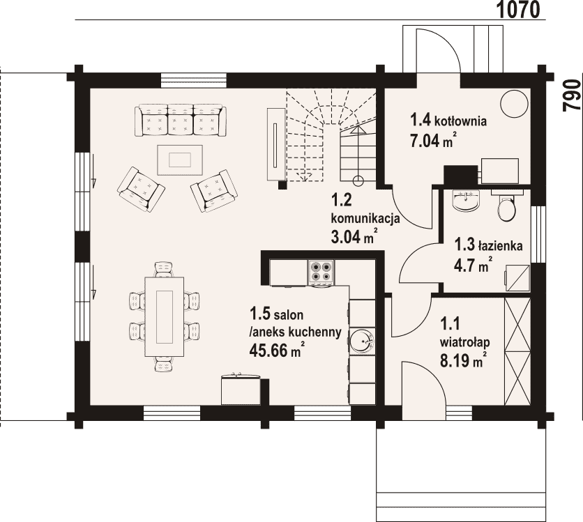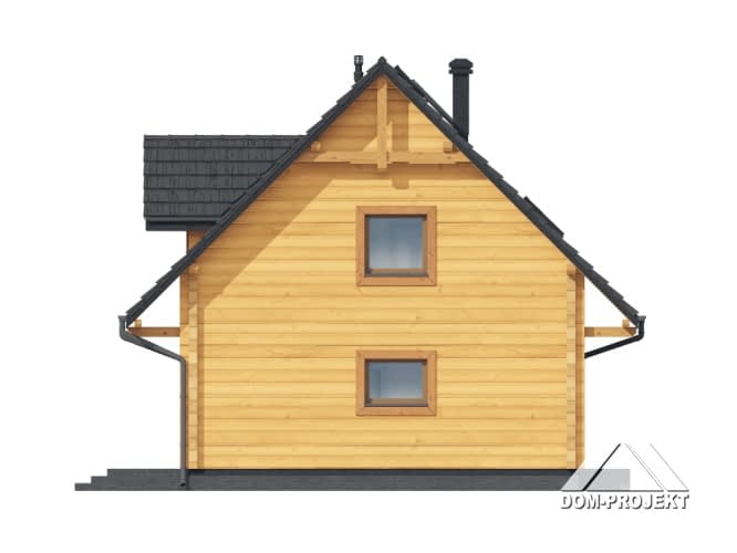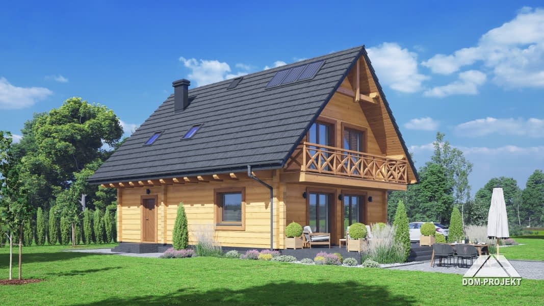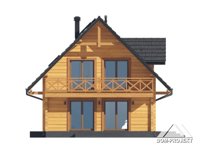Dom z bali. Na parterze salon z aneksem kuchennym, wyjściem na taras i schodami na poddasze. Kotłownia, łazienka, wiatrołap, komunikacja. Na poddaszu cztery pokoje, łazienka, komunikacja oraz balkon dostępny z dwóch pokoi. Zwarta bryła budynku oraz dach dwuspadowy sprzyjają szybkiej i taniej budowie oraz niskim kosztom eksploatacji.Rzuty