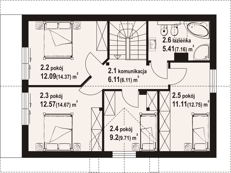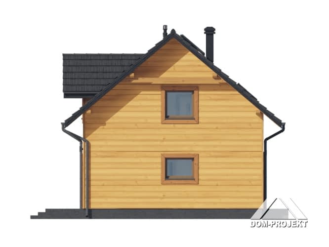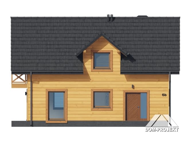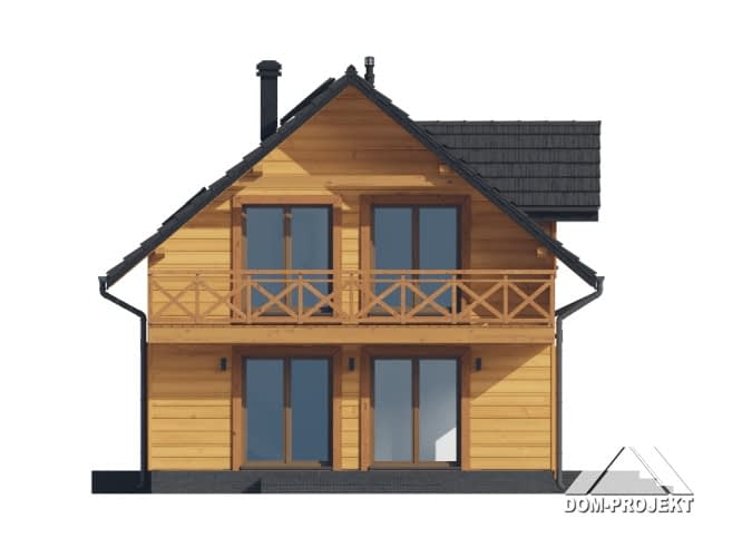 Dom w konstrukcji szkieletu drewnianego. Na parterze salon z aneksem kuchennym, wyjściem na taras i schodami na poddasze. Kotłownia, łazienka, wiatrołap. Na poddaszu cztery pokoje, łazienka, komunikacja oraz balkon dostępny z dwóch pokoi. Zwarta bryła budynku oraz dach dwuspadowy sprzyjają szybkiej i taniej budowie oraz niskim kosztom eksploatacji.Rzuty
