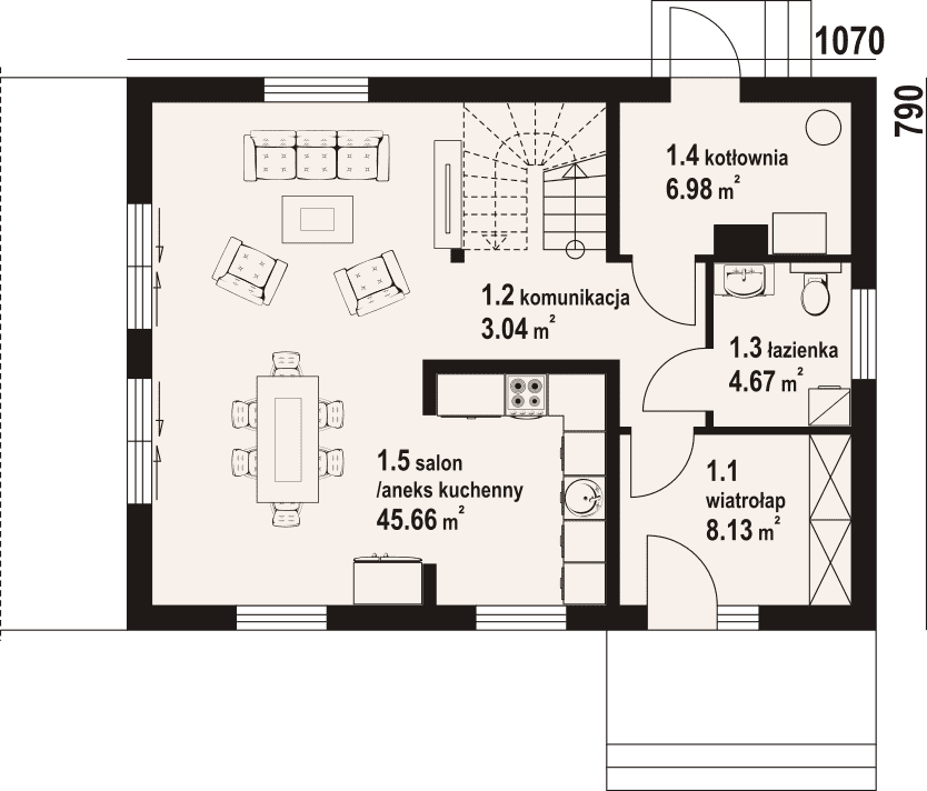 - 1.5 - salon z aneksem kuchennym45.66 m²