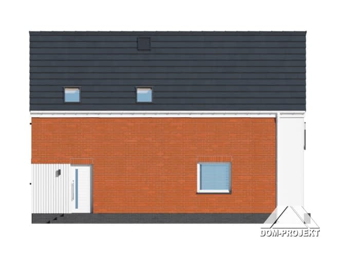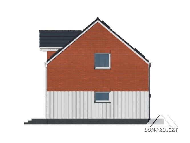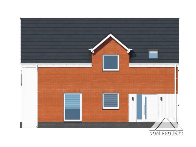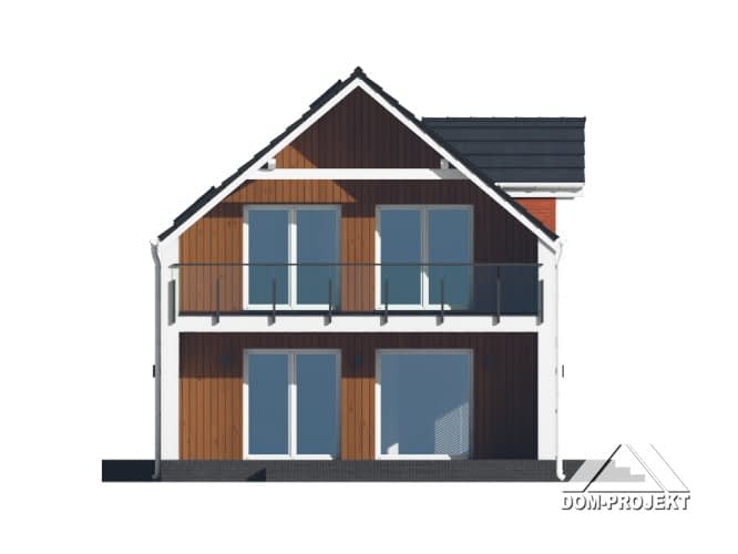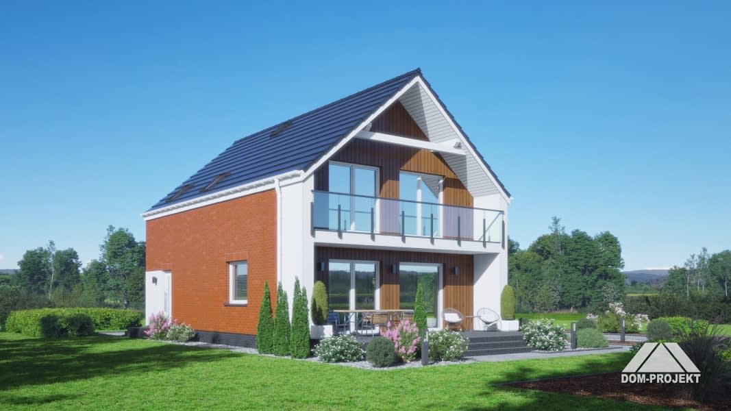 Dom z poddaszem użytkowym. Na parterze salon z aneksem kuchennym, wyjściem na taras i schodami na poddasze. Pomieszczenie gospodarcze, łazienka, wiatrołap. Na poddaszu cztery pokoje, łazienka, komunikacja oraz balkon dostępny z dwóch pokoi. Zwarta bryła budynku oraz dach dwuspadowy sprzyjają szybkiej i taniej budowie oraz niskim kosztom eksploatacji.Rzuty