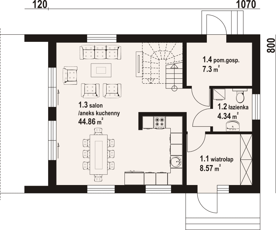 - 1.3 - salon z aneksem kuchennym44.86 m²