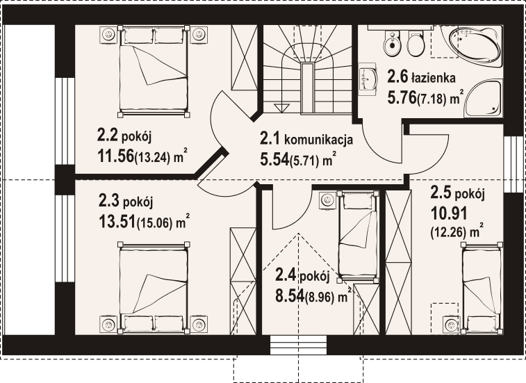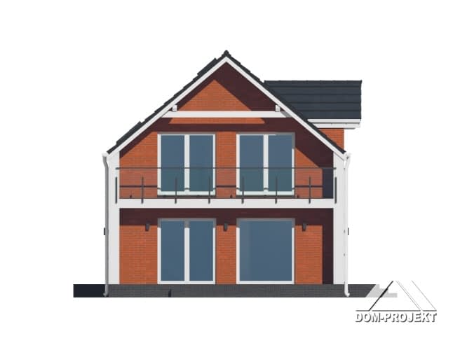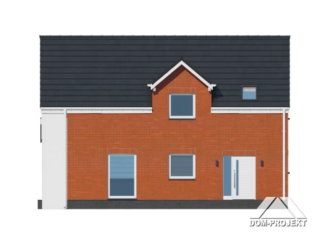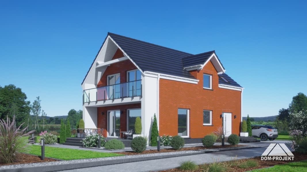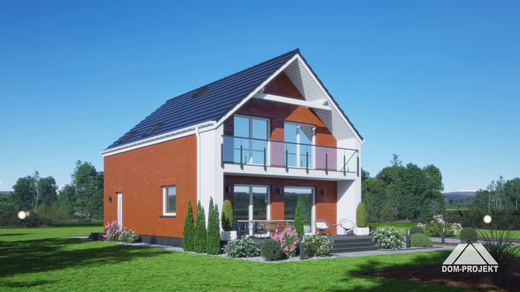 Dom z poddaszem użytkowym. Na parterze salon z aneksem kuchennym, wyjściem na taras i schodami na poddasze. Pomieszczenie gospodarcze, łazienka, wiatrołap. Na poddaszu cztery pokoje, łazienka, komunikacja. Balkon dostępny z dwóch pokoi. Zwarta bryła budynku oraz dach dwuspadowy sprzyjają szybkiej i taniej budowie oraz niskim kosztom eksploatacji.Rzuty