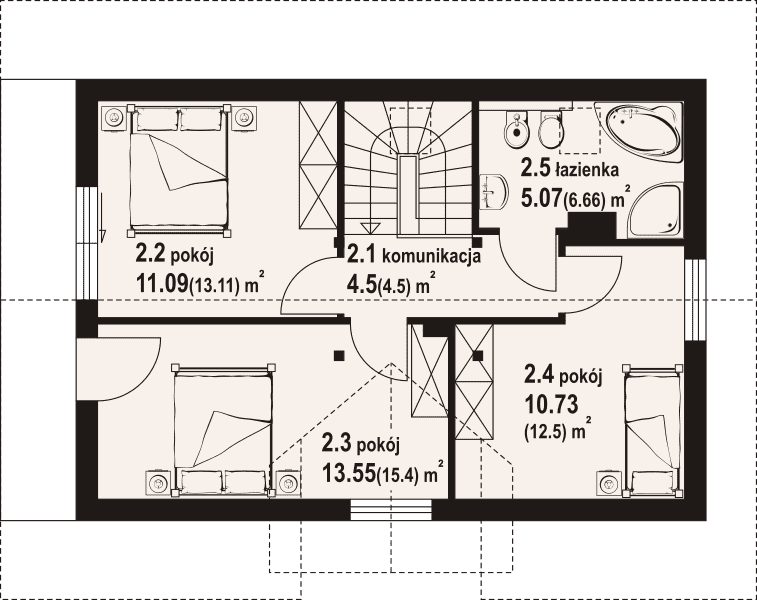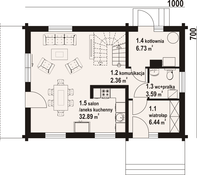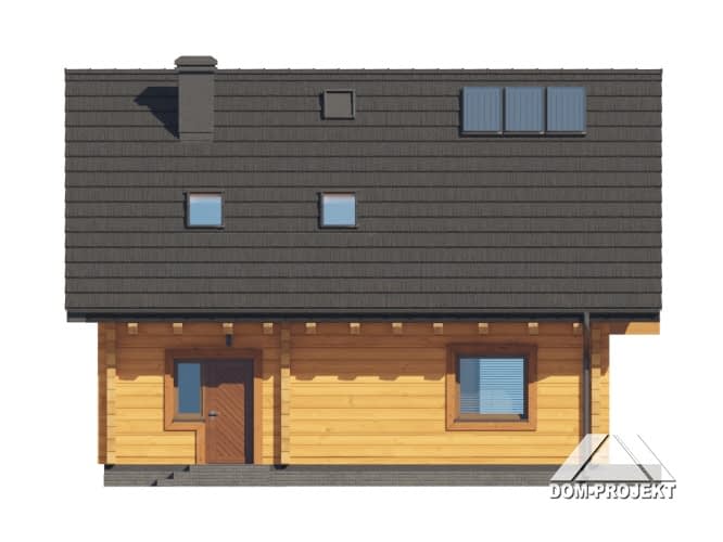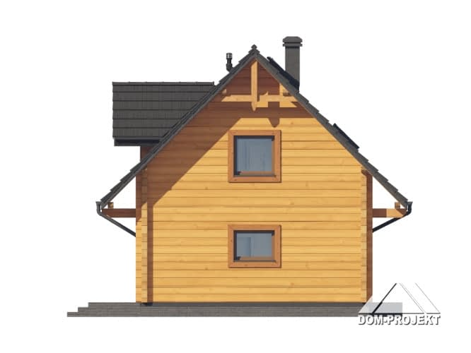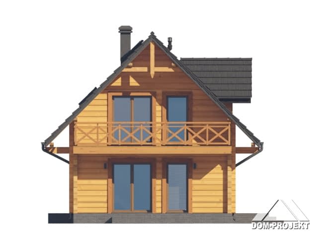 Dom z bali. Na parterze salon z aneksem kuchennym, wyjściem na taras i schodami na poddasze. Kotłownia, wc z pralką, komunikacja, wiatrołap. Na poddaszu trzy pokoje, łazienka, komunikacja oraz balkon dostępny z dwóch pokoi. Zwarta bryła budynku oraz dach dwuspadowy sprzyjają szybkiej i taniej budowie oraz niskim kosztom eksploatacji.Rzuty
