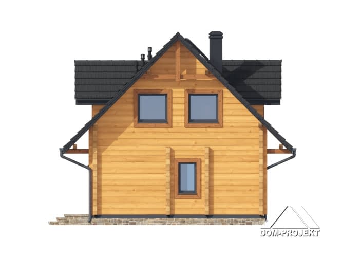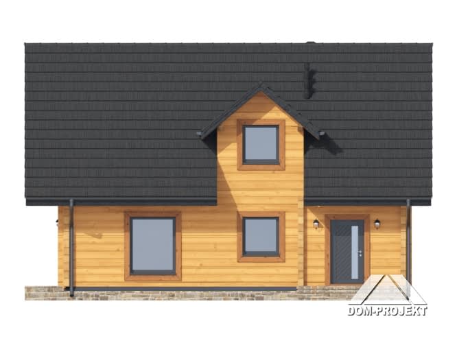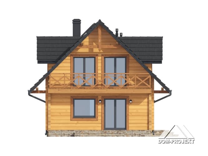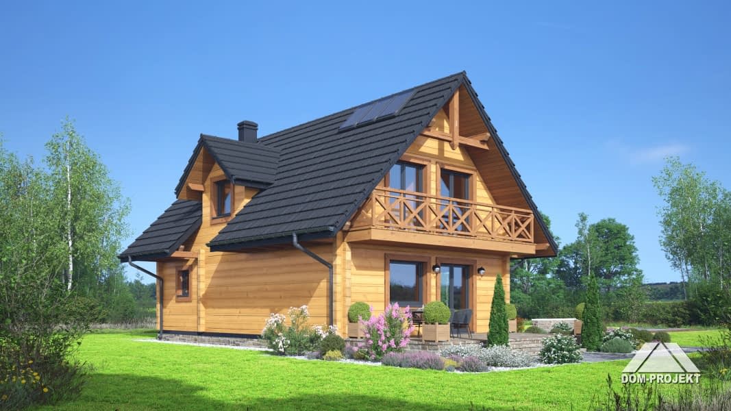 Dom z bali. Na parterze salon z aneksem kuchennym, wyjściem na taras i schodami na poddasze. Łazienka, komunikacja, wiatrołap. Na poddaszu cztery pokoje, łazienka, komunikacja, oraz balkon dostępny z dwóch pokoi. Zwarta bryła budynku oraz dach dwuspadowy sprzyjają szybkiej i taniej budowie oraz niskim kosztom eksploatacji.Rzuty