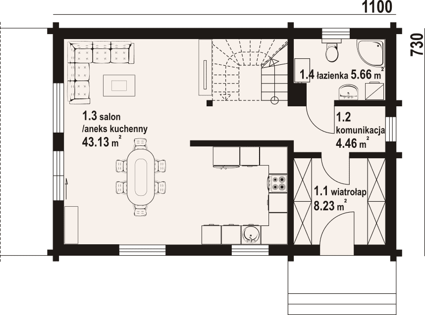 - 1.3 - salon z aneksem kuchennym43.13 m²