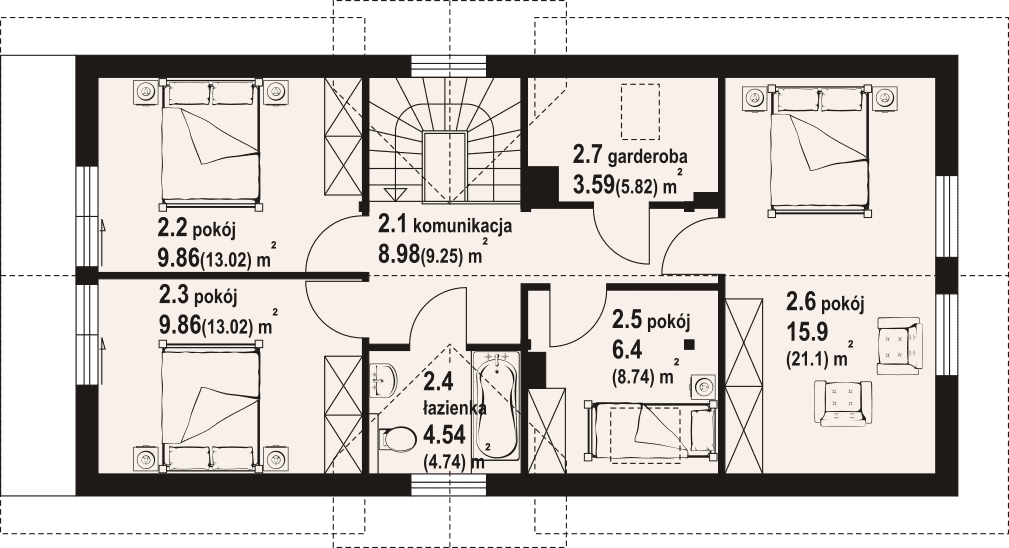 Dom w konstrukcji szkieletu drewnianego. Na parterze salon z aneksem kuchennym, wyjściem na taras i schodami na poddasze. WC, komunikacja, wiatrołap oraz garaż. Na poddaszu cztery pokoje, komunikacja, łazienka, garderoba oraz balkon dostępny z dwóch pokoi. Zwarta bryła budynku oraz dach dwuspadowy sprzyjają szybkiej i taniej budowie oraz niskim kosztom eksploatacji.Rzuty