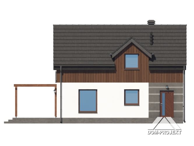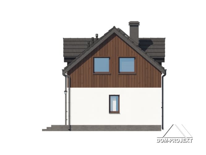 Dom z poddaszem użytkowym. Na parterze salon z aneksem kuchennym, wyjściem na taras i schodami na poddasze. Wc, komunikacja, wiatrołap. Na poddaszu cztery pokoje, łazienka, komunikacja. Zwarta bryła budynku oraz dach dwuspadowy sprzyjają szybkiej i taniej budowie oraz niskim kosztom eksploatacji.Rzuty