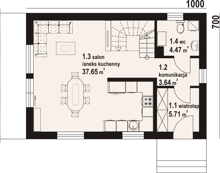 - 1.3 - salon z aneksem kuchennym37.65 m²