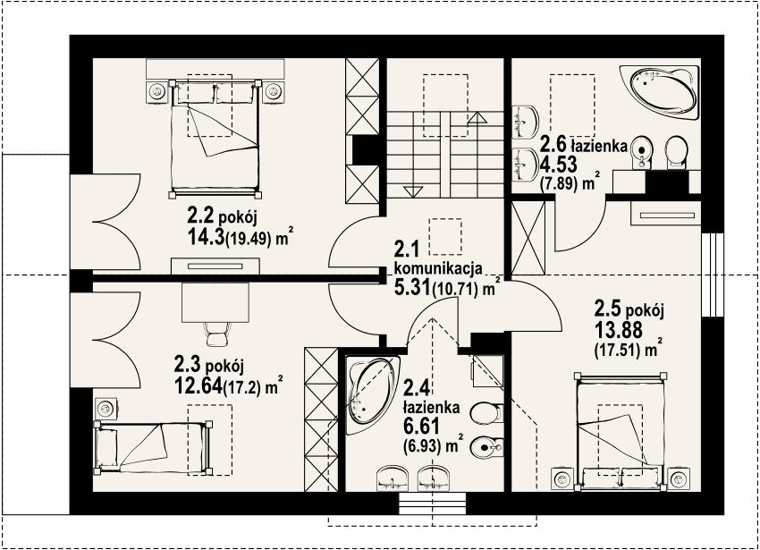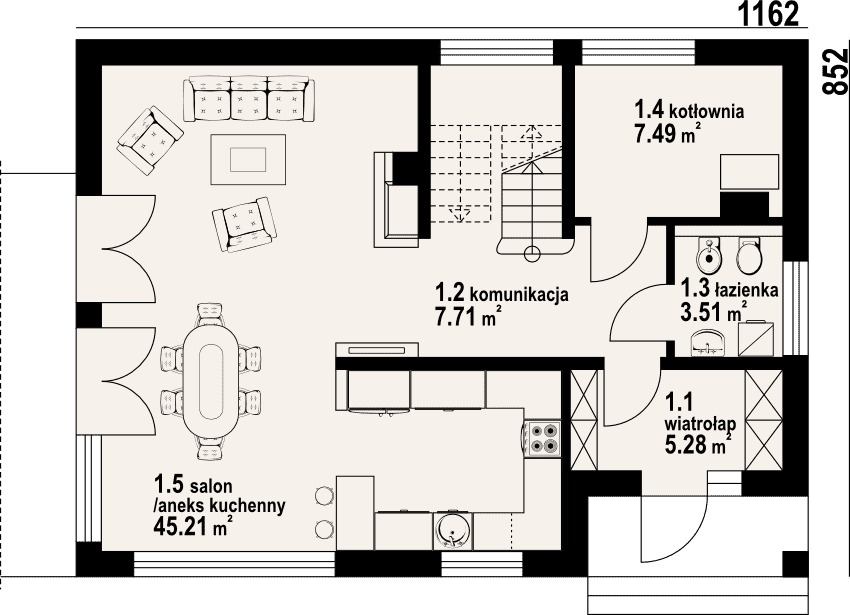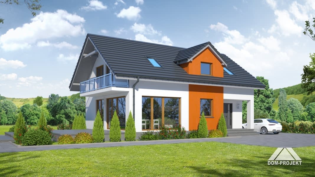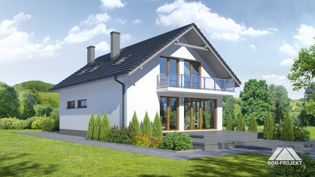 Wygodny dom z poddaszem, w którym na parterze zaprojektowano otwartą część dzienną która stanowi duży, słoneczny salon połączony z aneksem kuchennym. Ponadto na tej kondygnacji znajdują się pomieszczenia łazienki i kotłowni. W strefie nocnej na poddaszu przewidziano trzy sypialnie i dwie łazienki.Rzuty