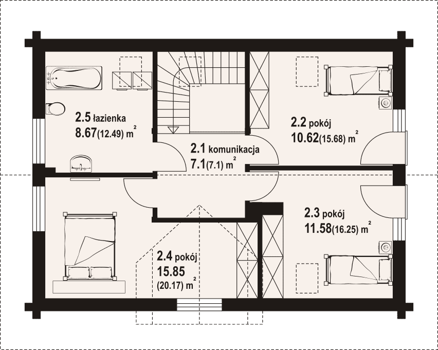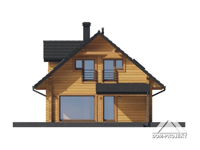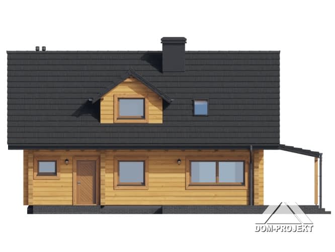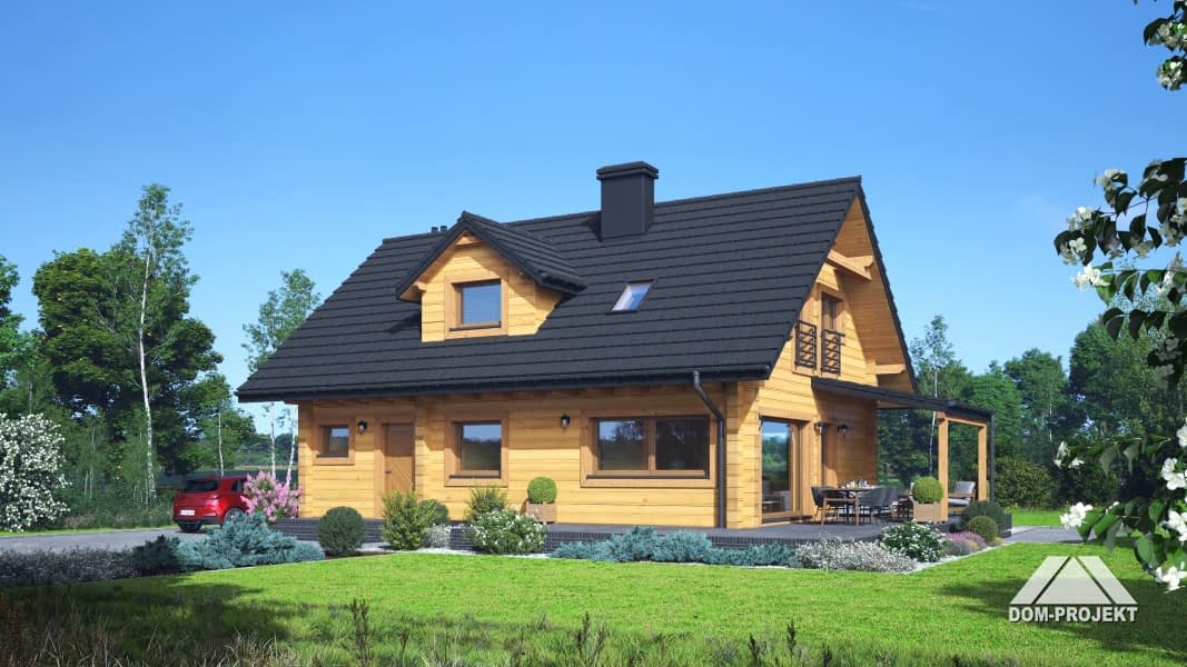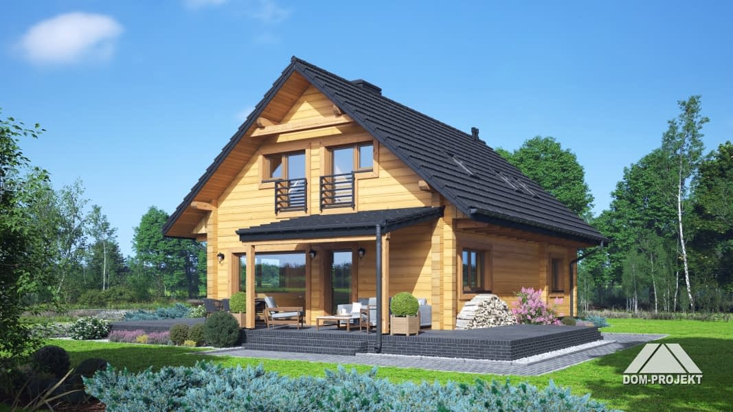 Dom z bali. Na parterze salon z kuchnią, kominkiem, wyjściem na zadaszony taras i schodami na poddasze. Pod schodami schowek. Pokój, łazienka, korytarz, wiatrołap, pomieszczenie gospodarcze. Na poddaszu trzy pokoje, łazienka, komunikacja. Zwarta bryła budynku oraz dach dwuspadowy sprzyjają szybkiej i taniej budowie oraz niskim kosztom eksploatacji.Rzuty