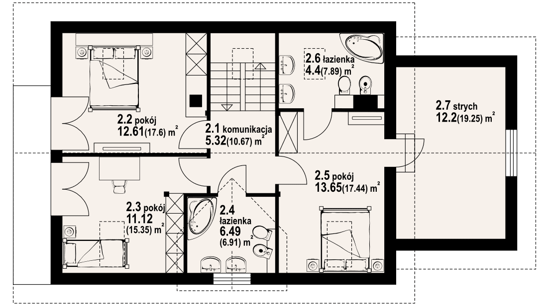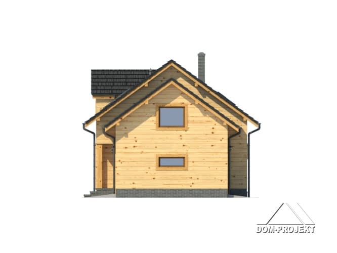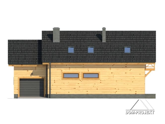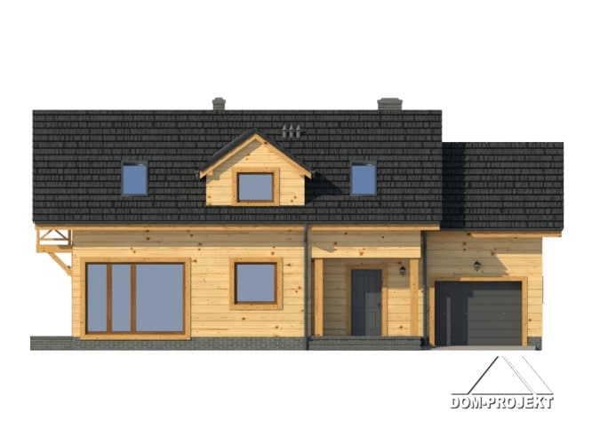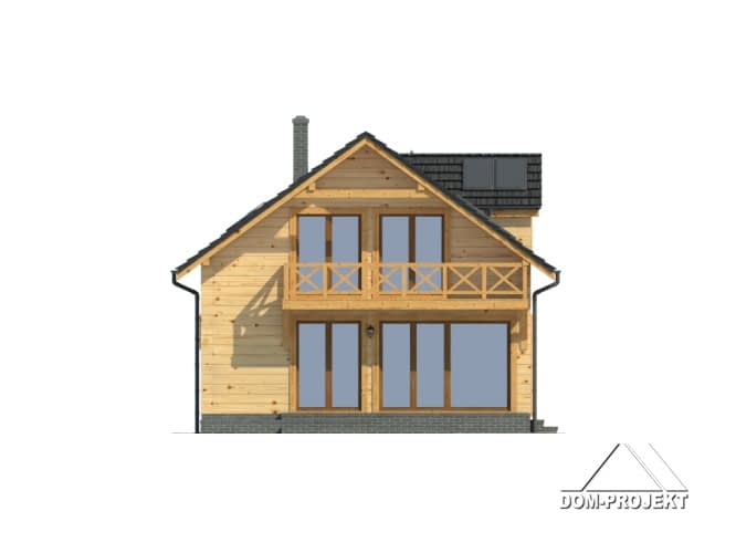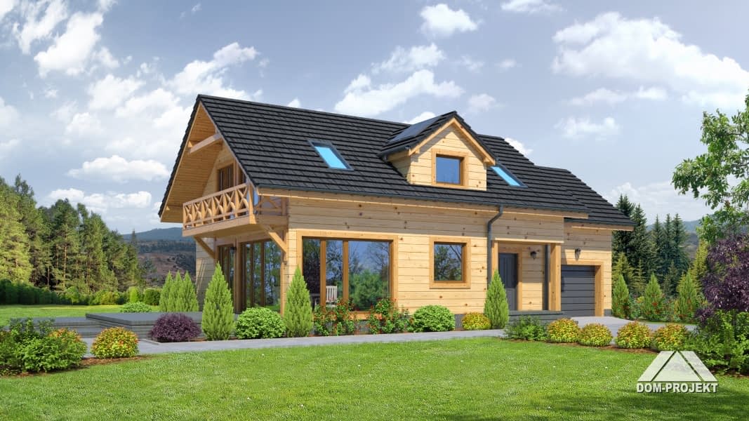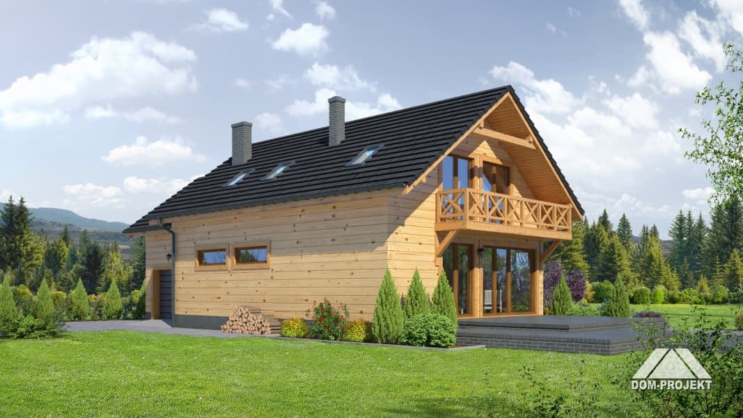 Dom w technologii szkieletowej. Na parterze duży salon z aneksem kuchennym, kominkiem i wyjściem na taras, łazienka, wiatrołap, komunikacja i kotłownia. Na poddaszu trzy pokoje, jeden z własną łazienką, dodatkowa łazienka oraz strych. W bocznej części garaż.Rzuty