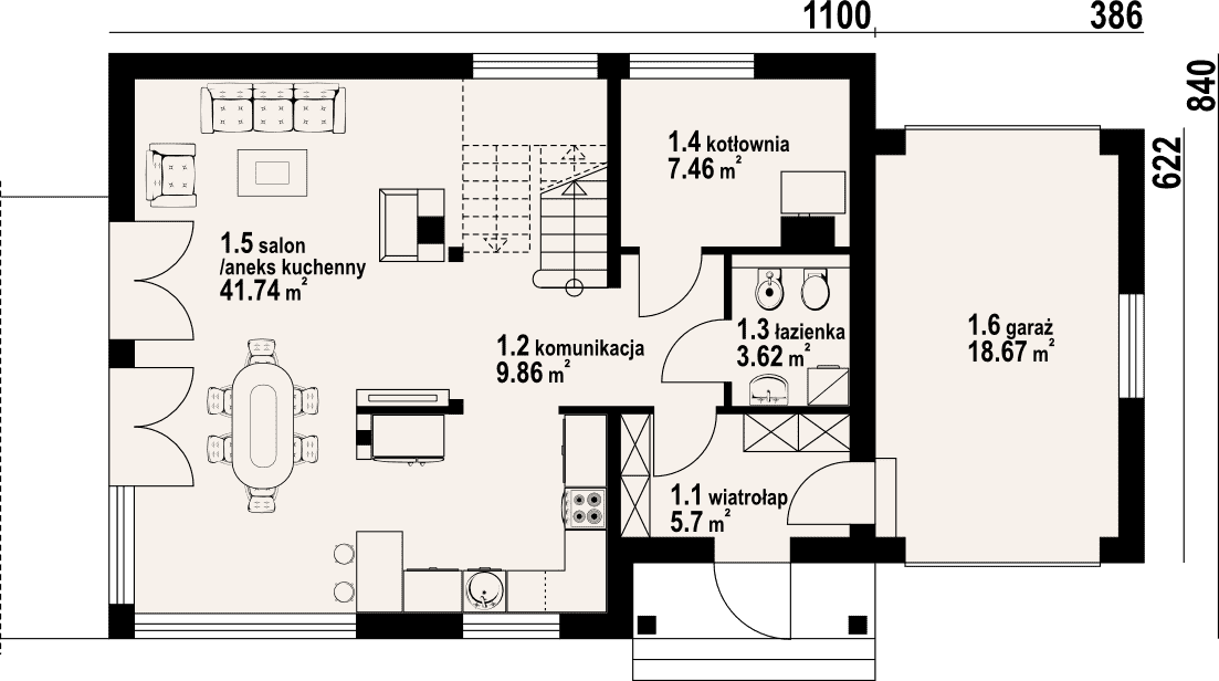 - 1.5 - salon z aneksem kuchennym41.74 m²