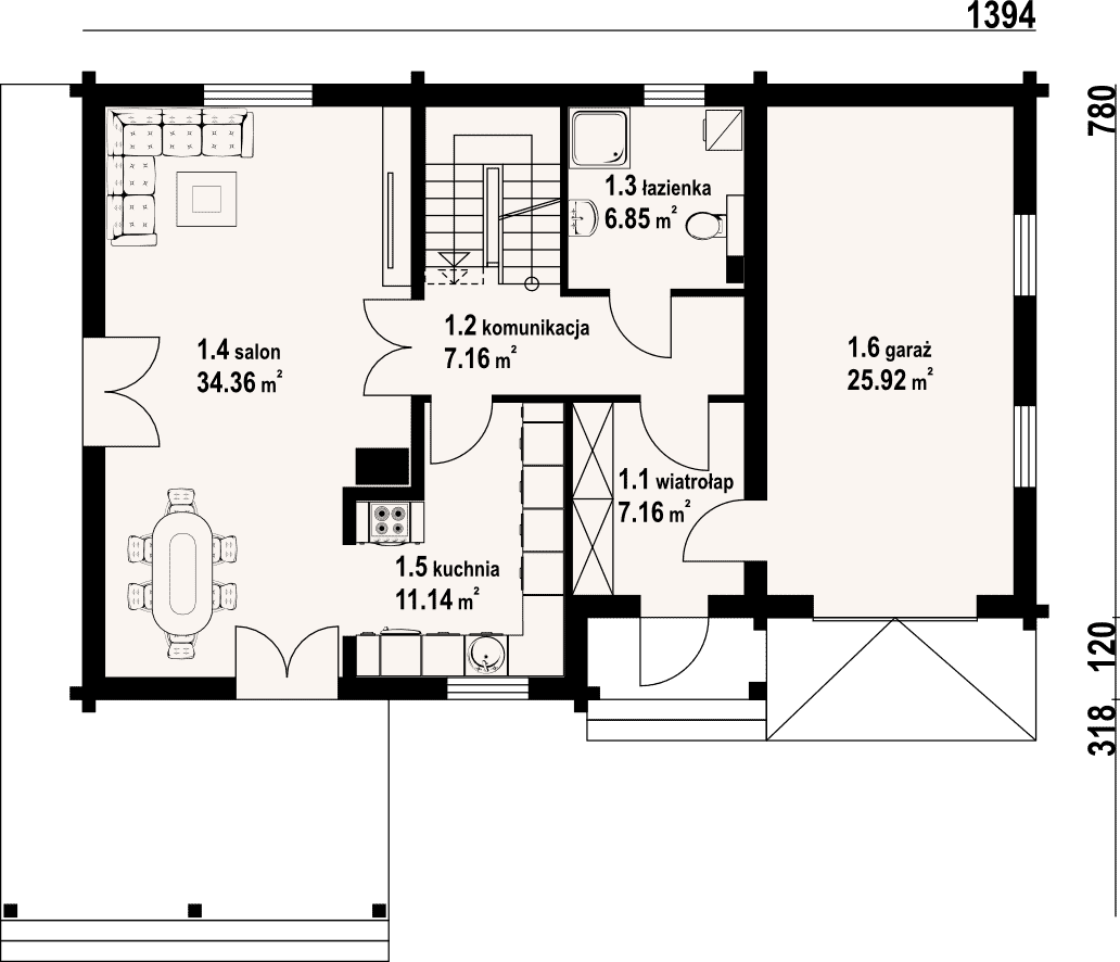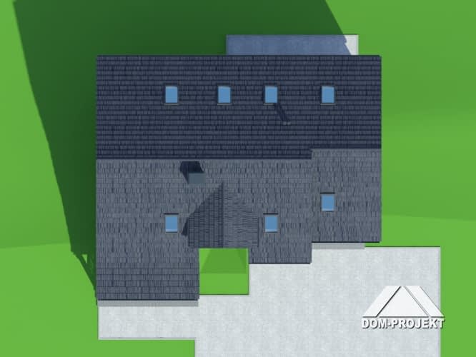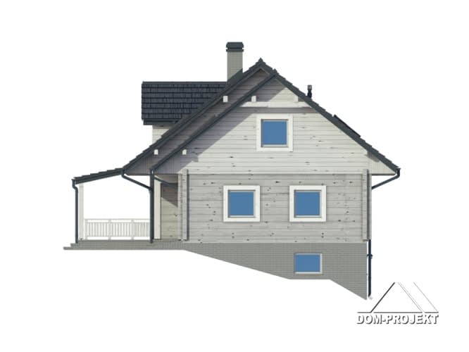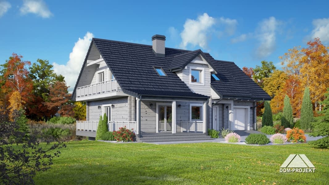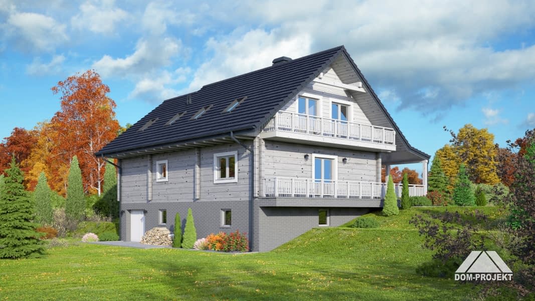 Dom z bali drewnianych. Duży salon a aneksem kuchennym, kominkiem i wyjściem na taras. Łazienka, wiatrołap, komunikacja i garaż. Na poddaszu trzy pokoje, łazienka, strych i balkon. W piwnicach kotłownia, pomieszczenie gospodarcze, pomieszczenia piwnic i komunikacja. Zwarta bryła budynku i dach dwuspadowy sprzyjają taniej i szybkiej budowie i niskim kosztom eksploatacji.Rzuty