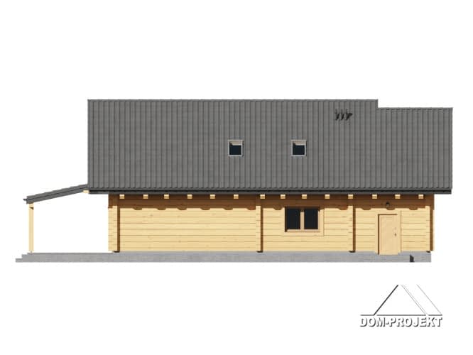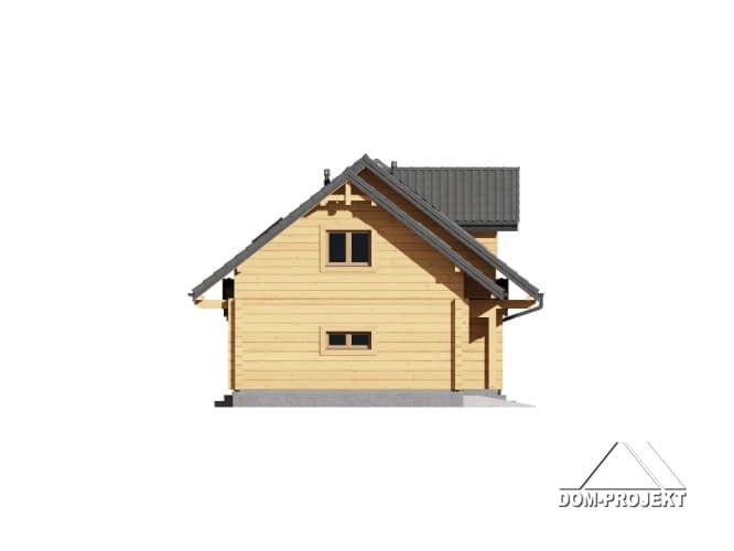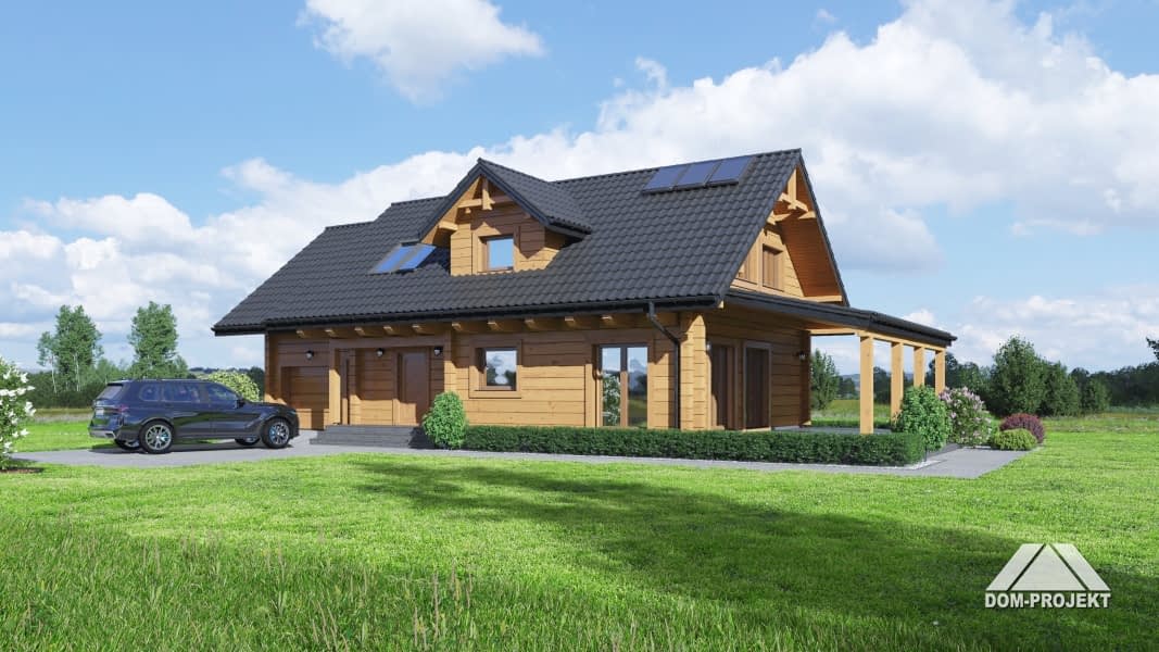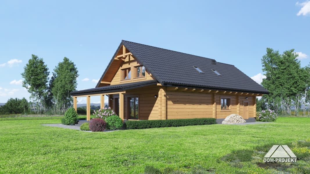 Dom z bali. Na parterze duży salon z aneksem kuchennym oraz wyjściem na duży, zadaszony taras. Pokój, łazienka, komunikacja, wiatrołap i spiżarka oraz garaż. Na poddaszu trzy pokoje, łazienka, komunikacja, strych. Zwarta bryła budynku oraz dach dwuspadowy sprzyjają szybkiej i taniej budowie oraz niskim kosztom eksploatacji.Rzuty