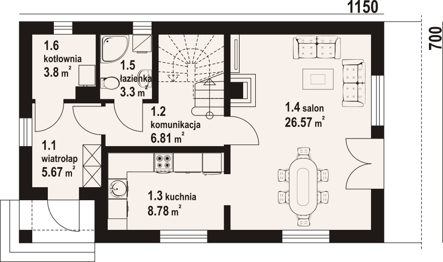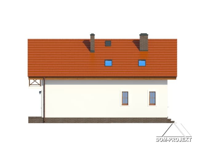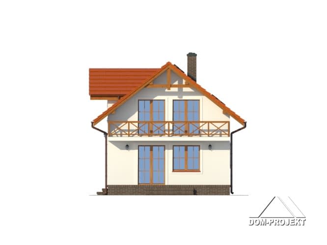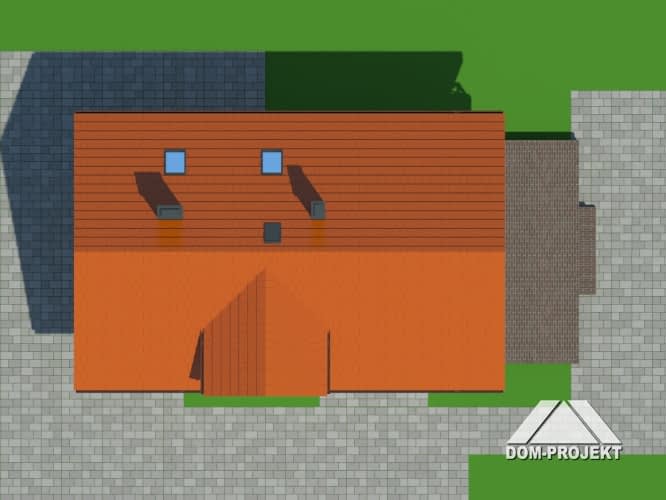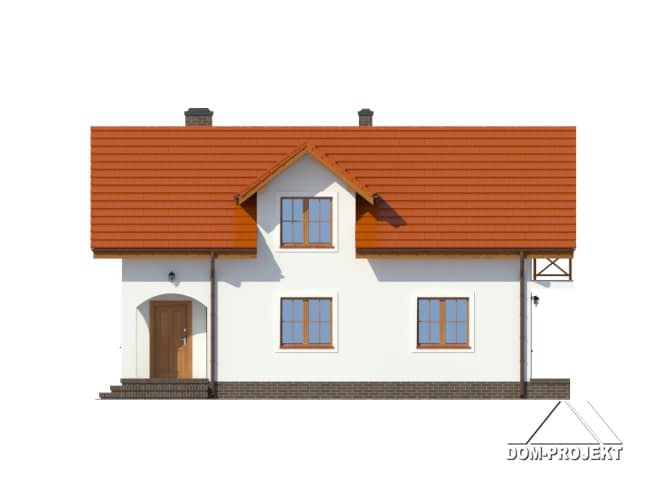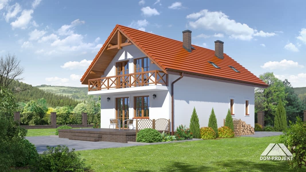 Dom z poddaszem użytkowym. Na parterze salon z kuchnią, kominkiem oraz wyjściem na taras. Komunikacja, łazienka, kotłownia, wiatrołap. Na poddaszu trzy pokoje, łazienka, komunikacja. Zwarta bryła budynku oraz dach dwuspadowy sprzyjają szybkiej i taniej budowie oraz niskim kosztom eksploatacji.Rzuty