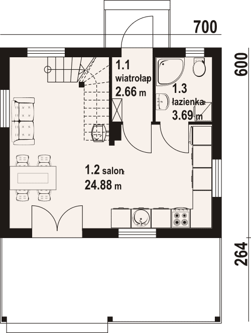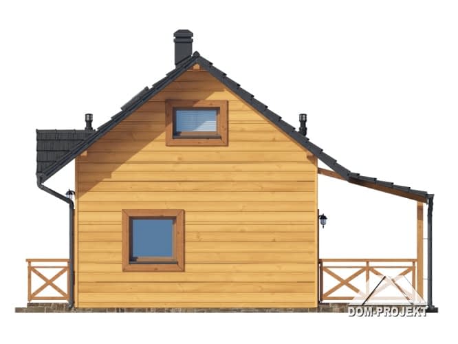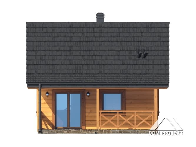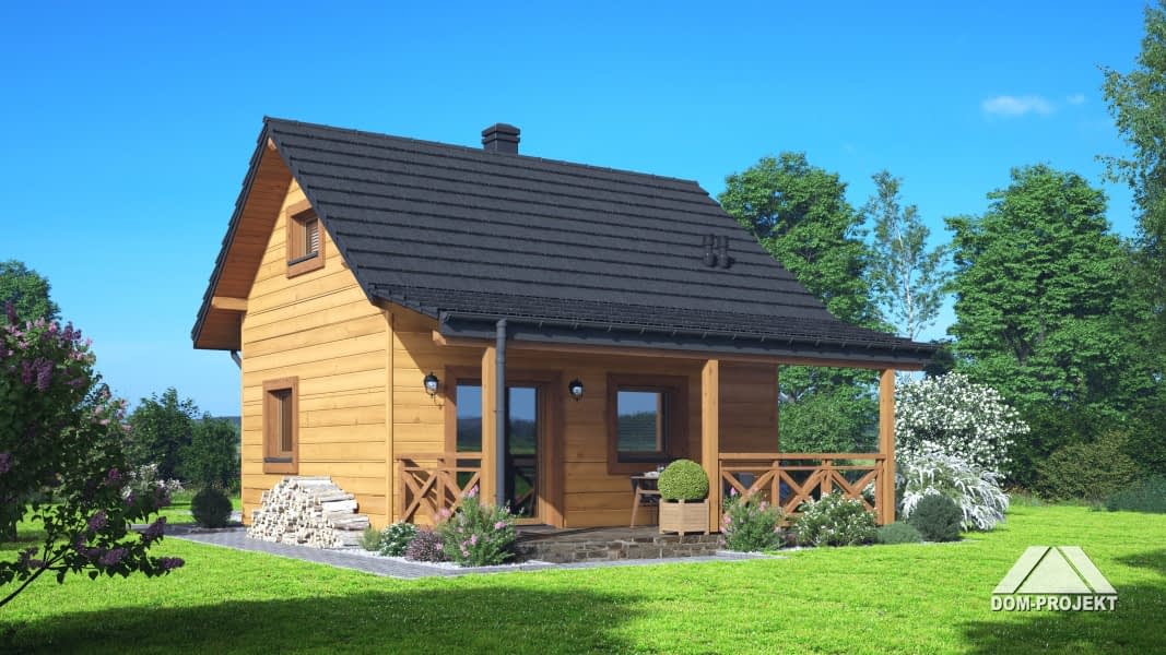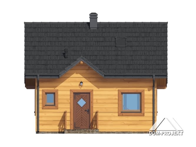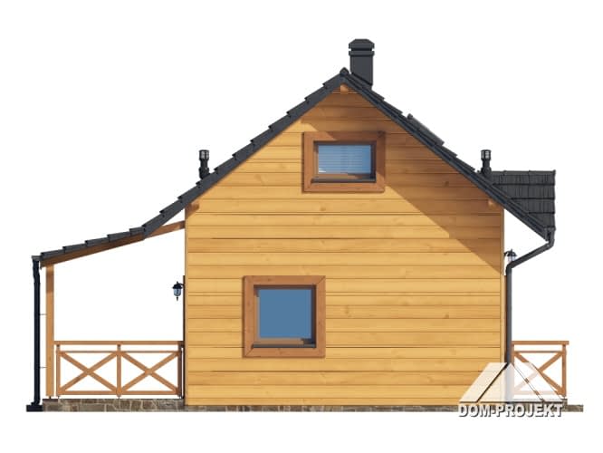 Dom w konstrukcji szkieletu drewnianego. Na parterze salon z aneksem kuchennym, kominkiem, wyjściem na duży, zadaszony taras i schodami na poddasze oraz łazienka. Na poddaszu pokój. Zwarta bryła budynku oraz dach dwuspadowy sprzyjają szybkiej i taniej budowie oraz niskim kosztom eksploatacji.Rzuty