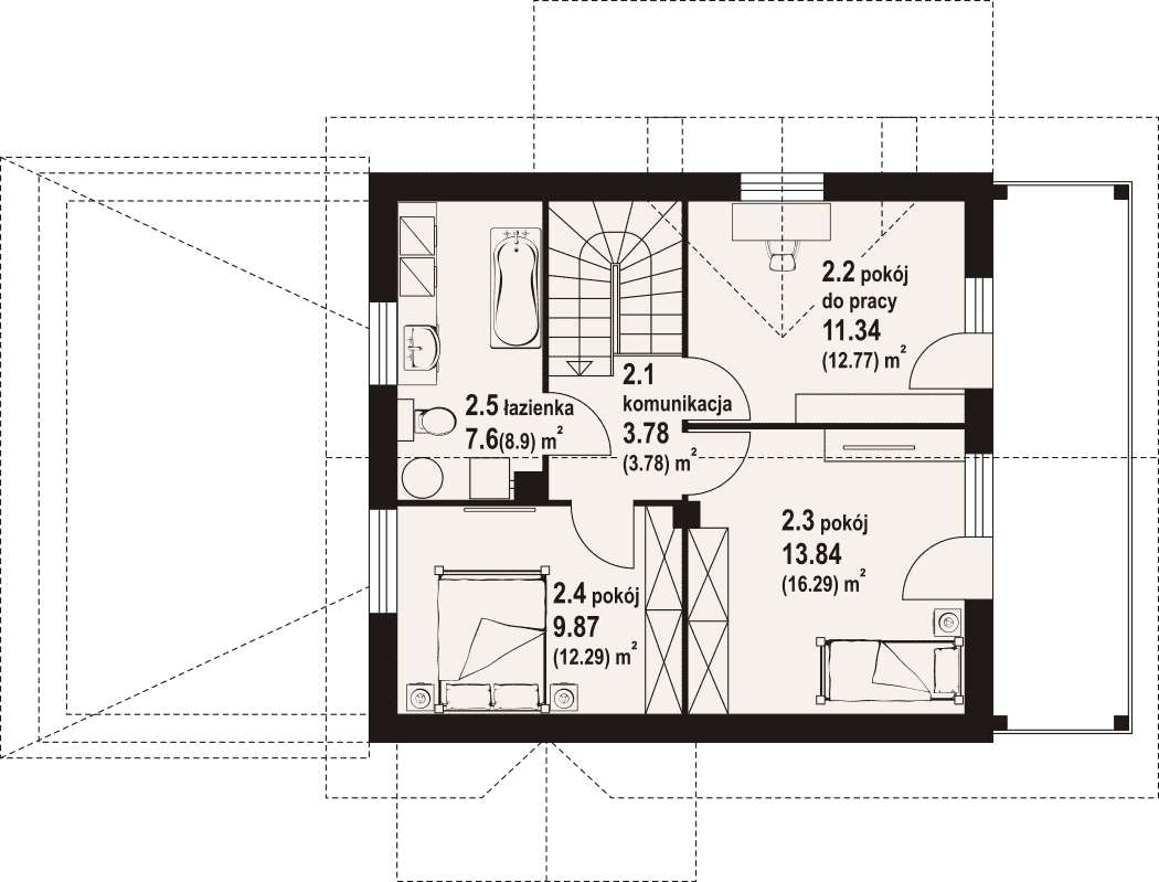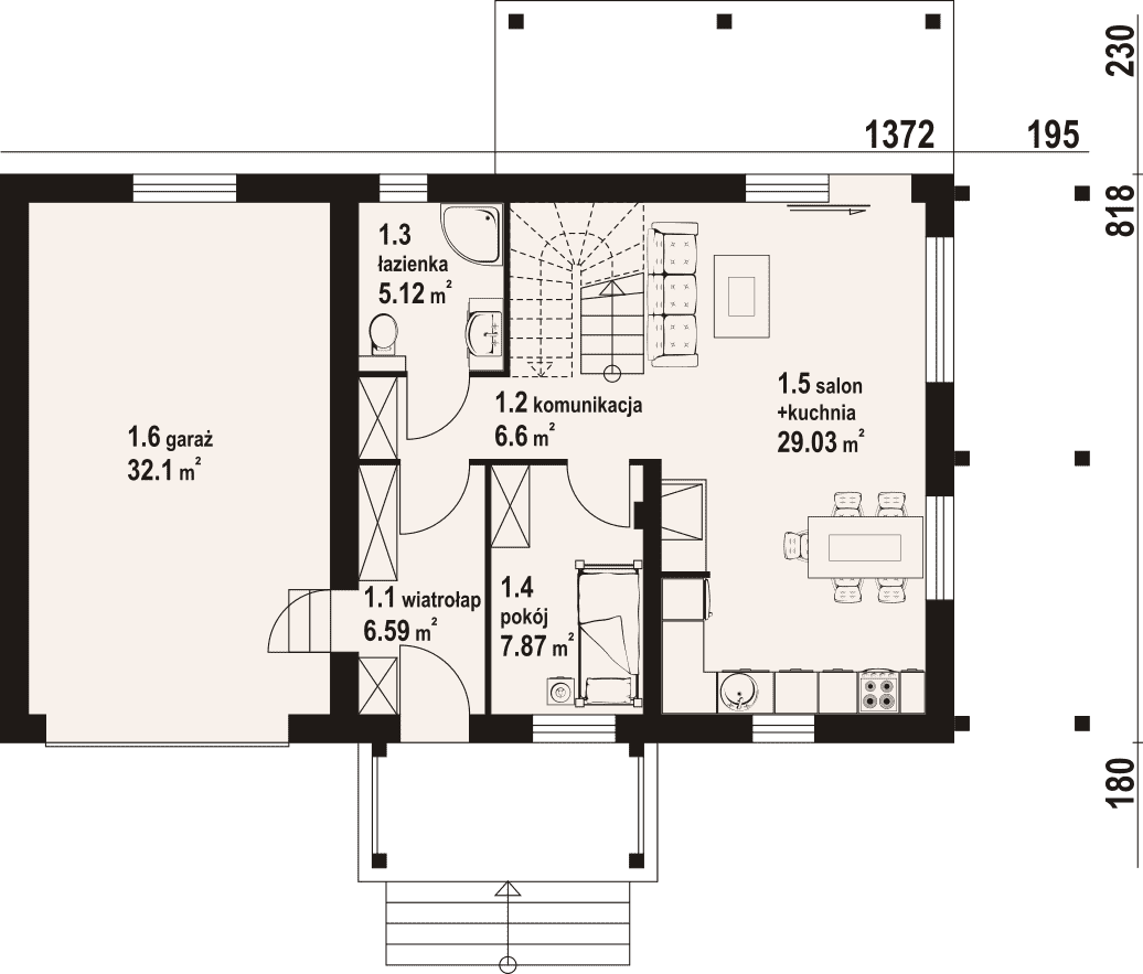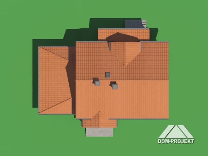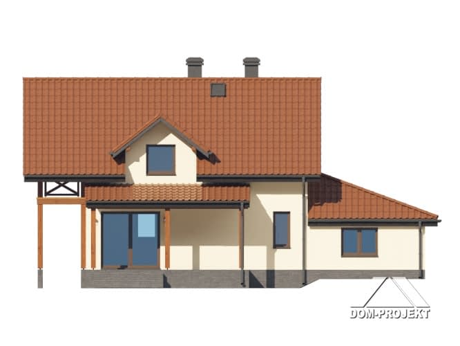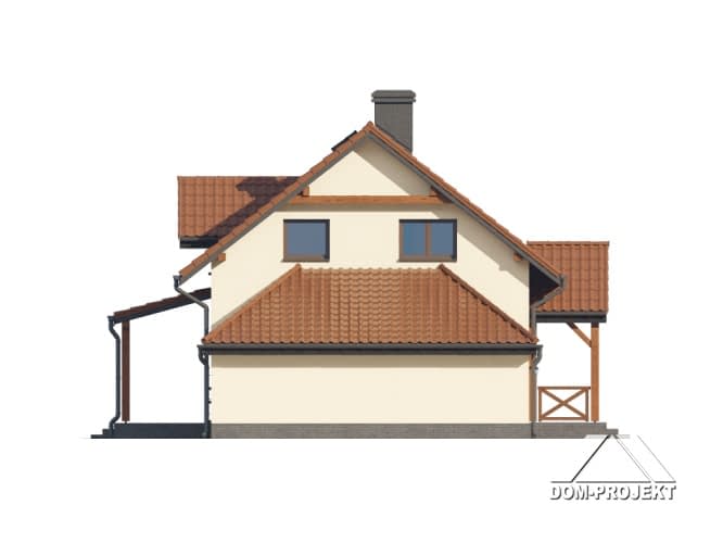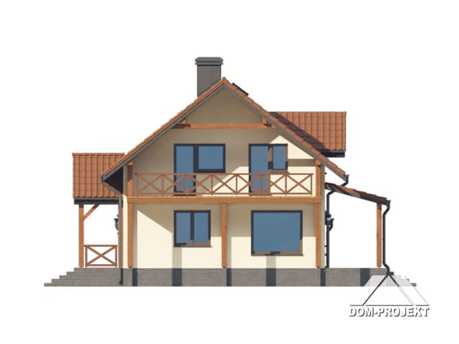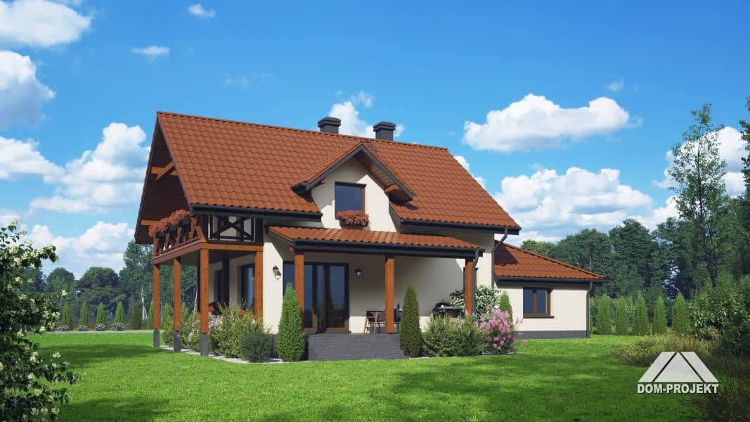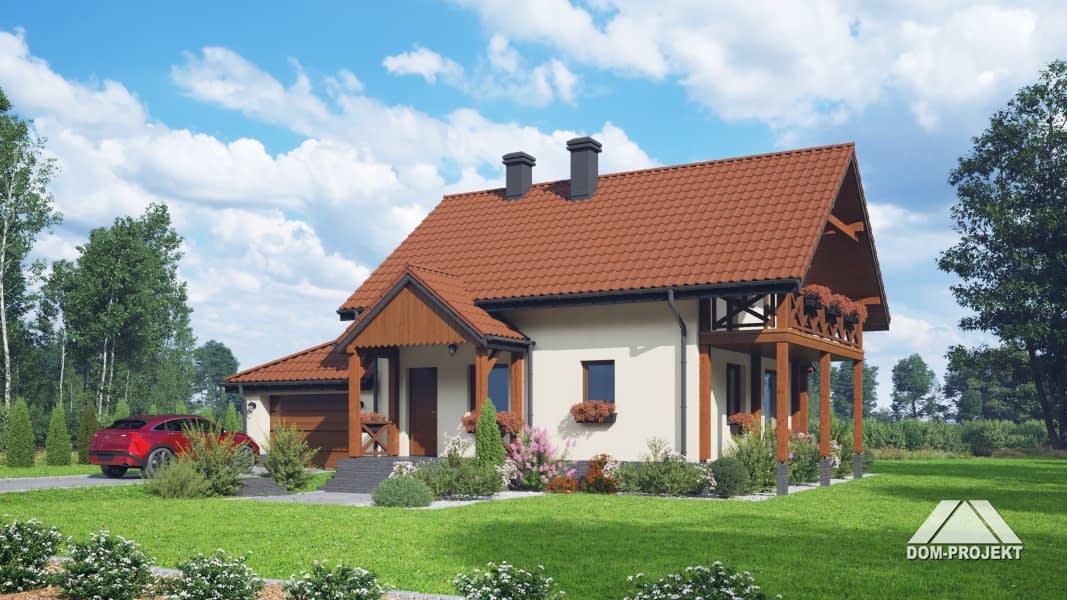 Dom z poddaszem użytkowym. Na parterze salon z aneksem kuchennym, kominkiem oraz wyjściem na zadaszony taras. Pokój, łazienka, komunikacja, wiatrołap oraz garaż. Na poddaszu trzy pokoje, łazienka, komunikacja oraz balkon. Zwarta bryła budynku oraz dach dwuspadowy sprzyjają szybkiej i taniej budowie oraz niskim kosztom eksploatacji.Rzuty