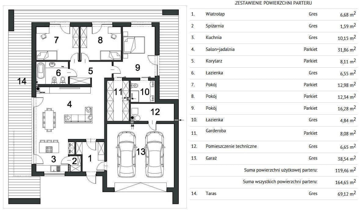 Układ domu to 3 wydzielone strefy: dzienna w postaci salonu i otwartej kuchni ze spiżarnią, nocna w której zaprojektowano 3 sypialnie, z czego sypialnia gospodarzy z łazienką i garderobą oraz łazienka przeznaczona dla pozostałych domowników. Strefa techniczna obejmująca dwustanowiskowy garaż i pomieszczenie techniczne.